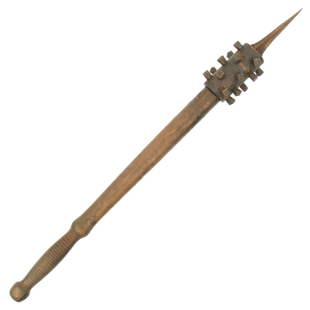 Original Item: Only One Available. This totally original incredible example has a massive 26 1/2 inch wood shaft with a 5 inch barbed iron head and a 5 inch spike to the top. Overall it measures 31 1/2 inches in length and is the most astounding impressive example of a Great War trench club we have ever encountered! The head of the club is encircled with five rows of 4 iron protrusions, which would shatter a soldier's skull with ease. Reminiscent of a medieval design, this was a must gruesome weapon.