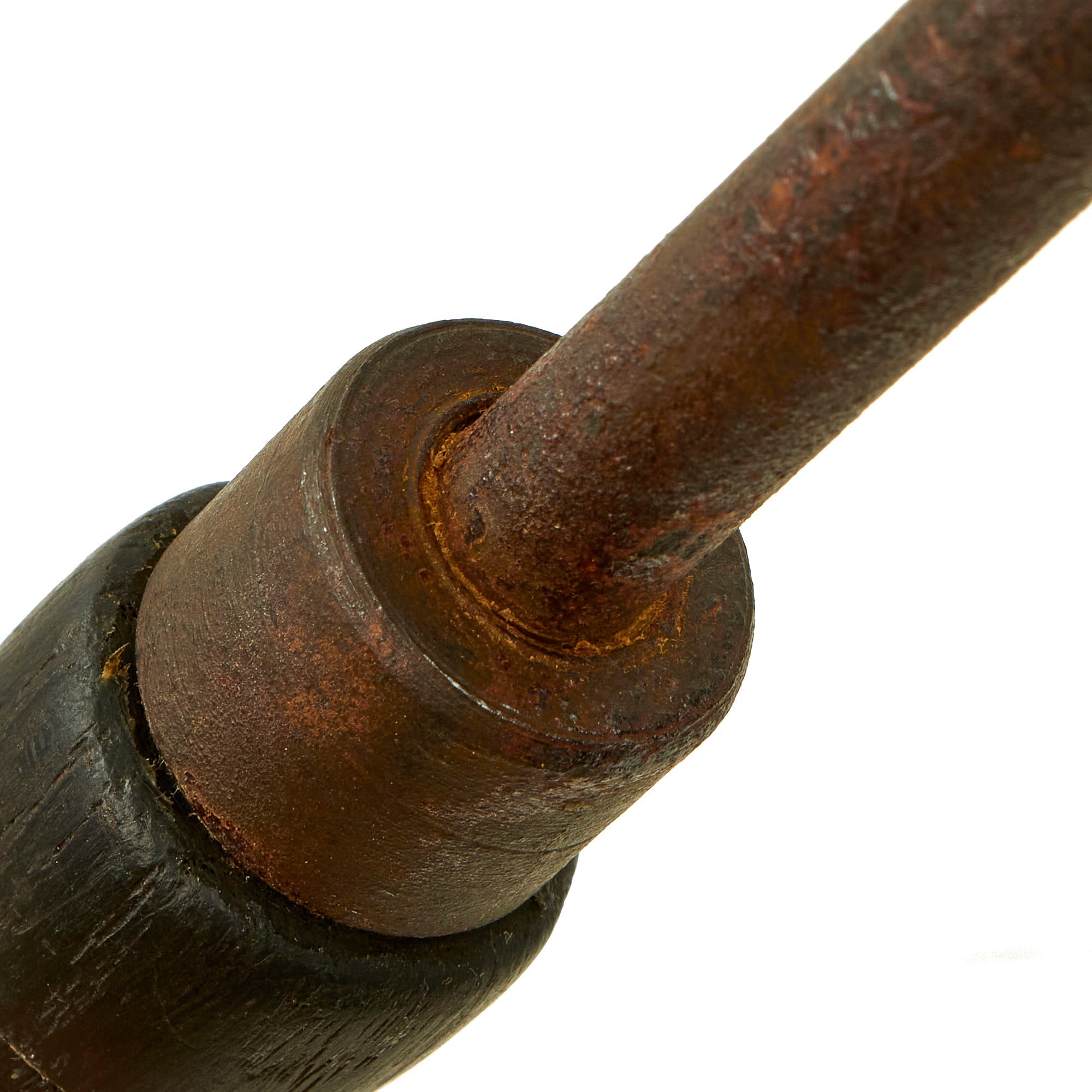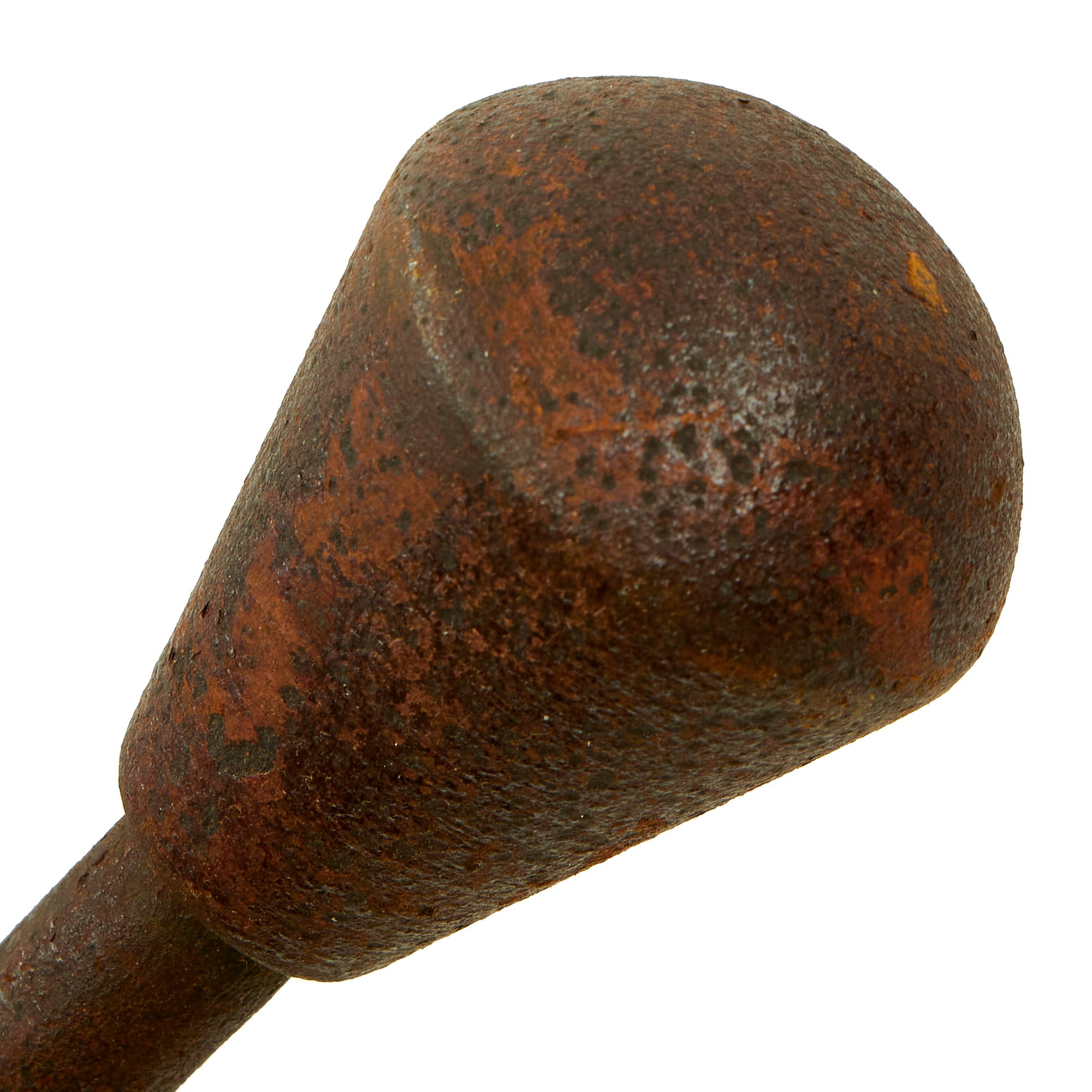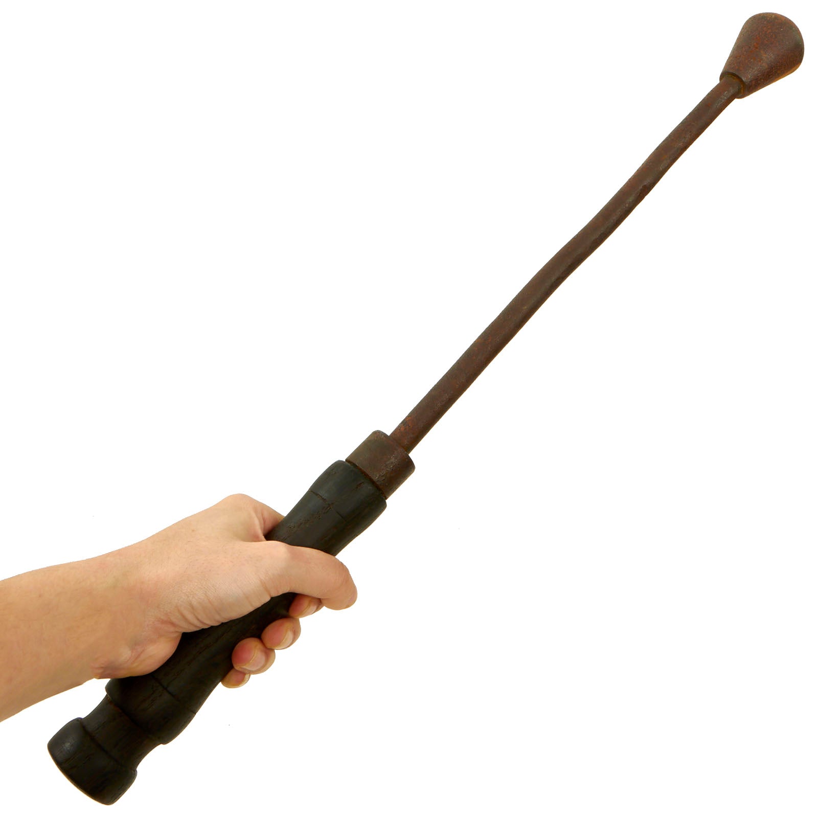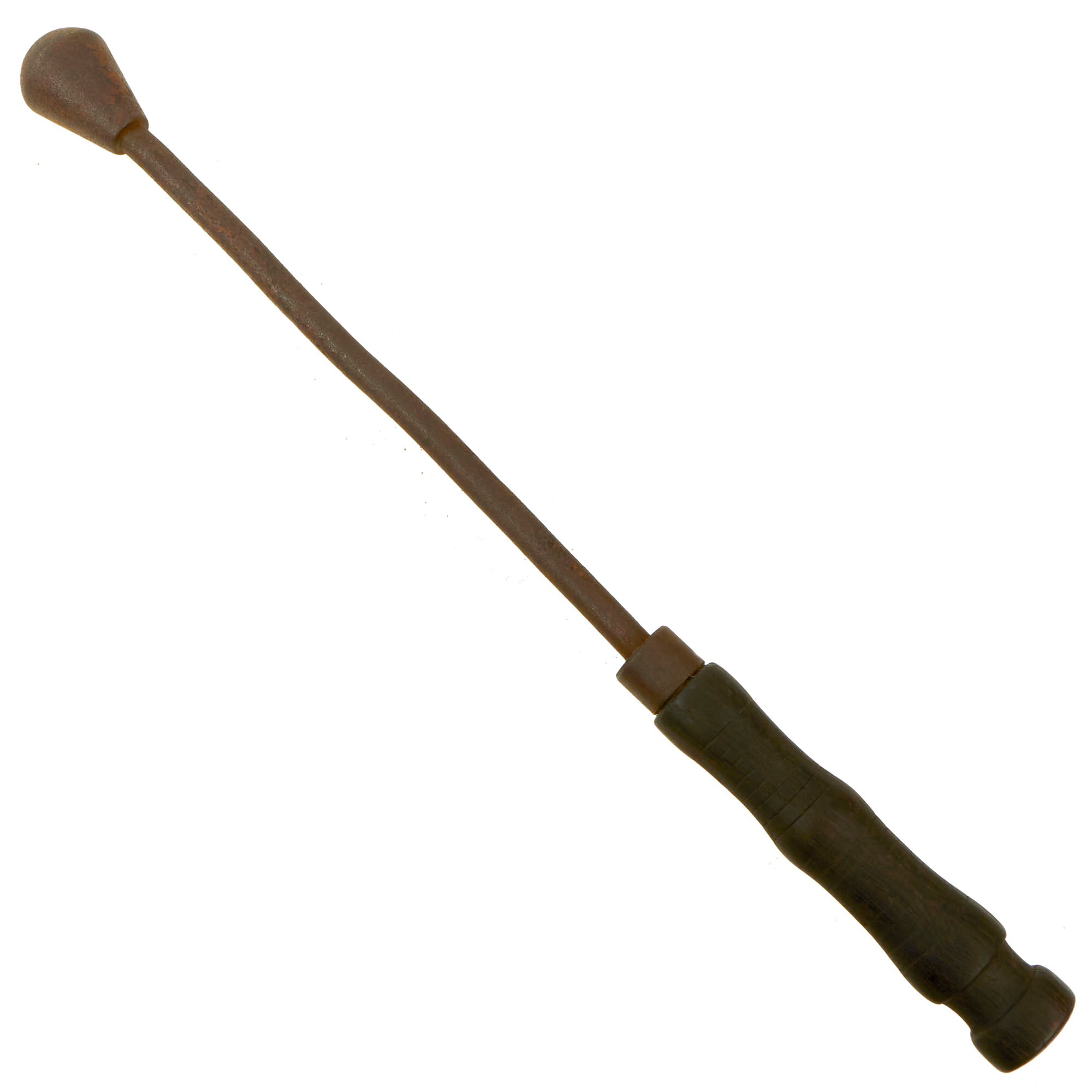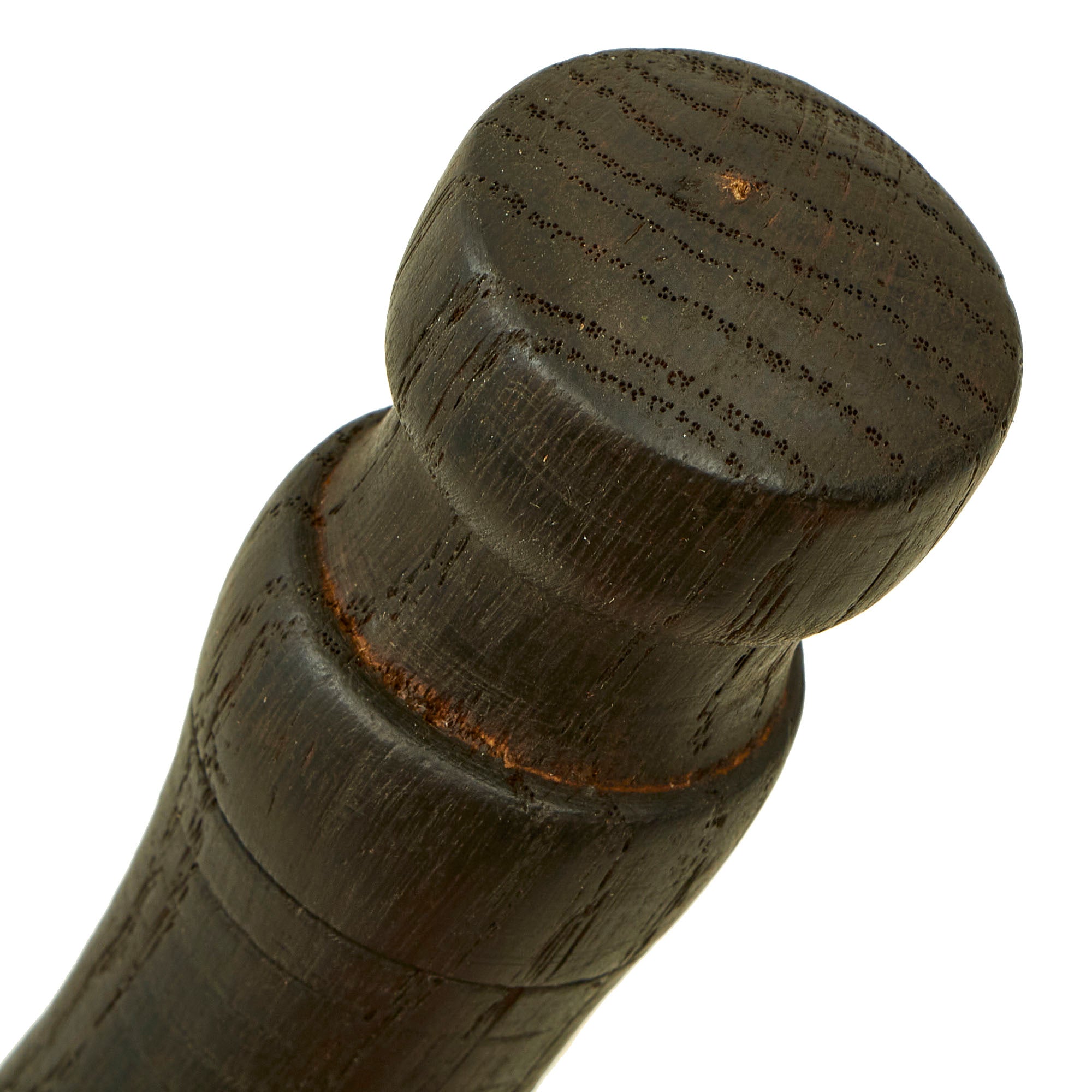 This trench club (Nahkampfkeule) features a pear-shaped iron head mounted to the top of a 12 mm diameter rigid steel wire cable. This rigid cable was attached to the inside of the iron head and passes completely through the massive double-concave wood grip. There are regularly spaced, 0.5 mm deep grooves turned about the circumference of its wood grip. Its pommel has groove for a lanyard. Overall length is 20 inches and weight is 2 lbs.