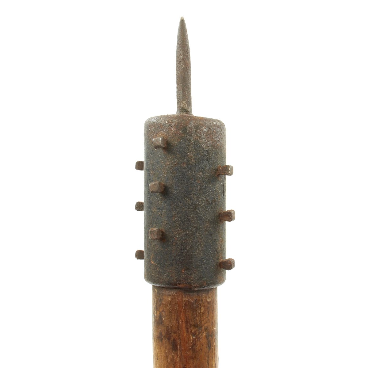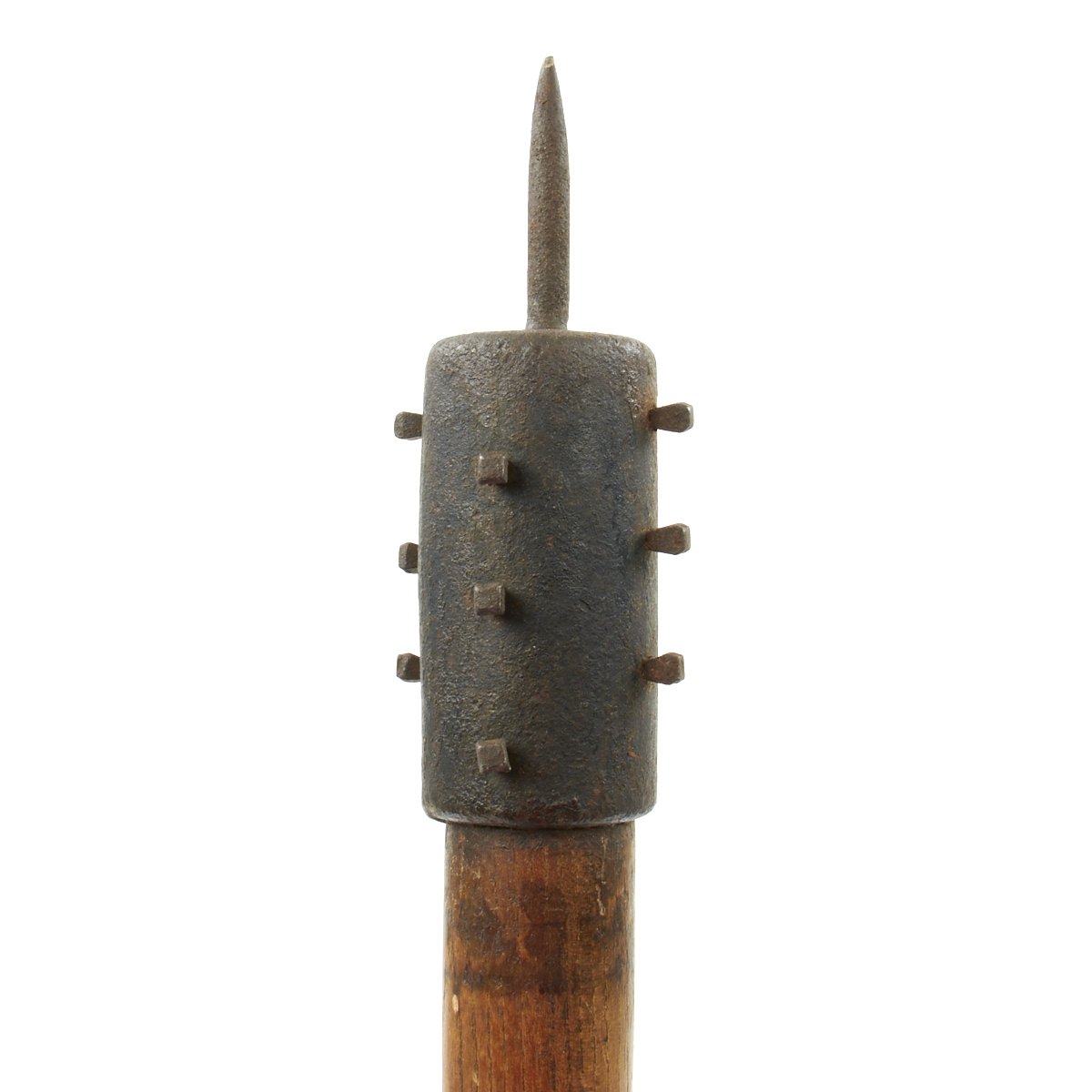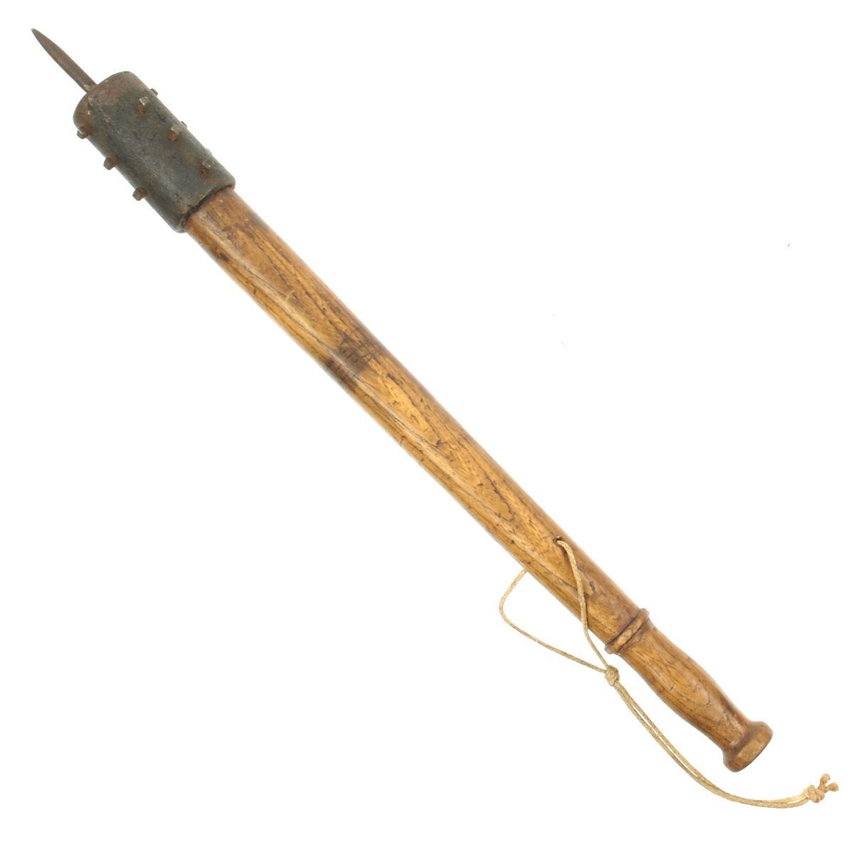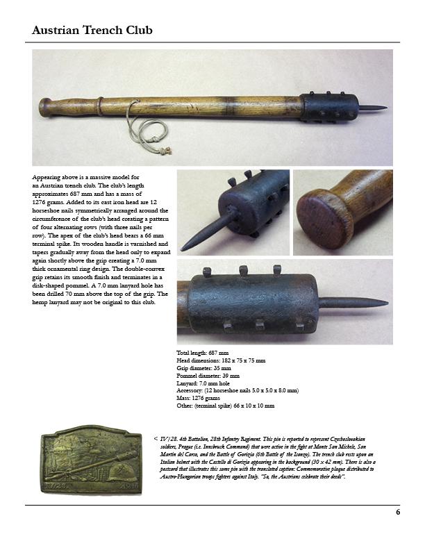 Original Item: Only One Available. A fantastic example of a World War One massive model Austrian trench club. The club's length is approximately 27 inches (687 mm) and has a weight of 2.8 pounds (1276 grams). Added to its cast iron head are 12 horseshoe nails symmetrically arranged around the circumference of the club's head creating a pattern of four alternating rows (with three nails per row). The apex of the club's head bears a 2.5 inch (66 mm) terminal spike. The wooden handle is varnished and tapers gradually away from the head only to expand again shortly above the grip creating a 7.0 mm thick ornamental ring design. The doable-convex grip retains its smooth finish and terminates in a disk-shaped pommel. A 7.0 mm Lanyard bole has been drilled 2.7 inches (70 mm) above the top of the grip. The hemp lanyard may not be original to this club.
