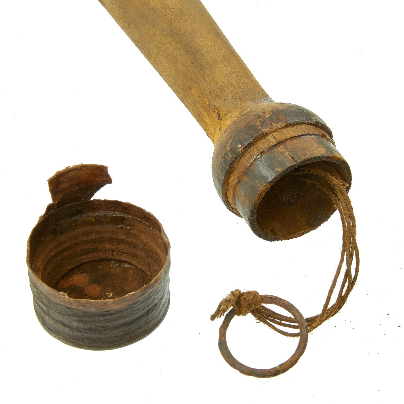 The handle is in similar condition to the warhead, and does show use and age. The handle on this example has a much wider base than the typical German design. It features a screw cap on the bottom, which is retained by a tape seal, under which is an original steel pull ring and cord. Unfortunately, due to oxidation the screw cap has become rust seized to the end fitting, which has pulled off the wooden handle. Now the entire bottom comes off.