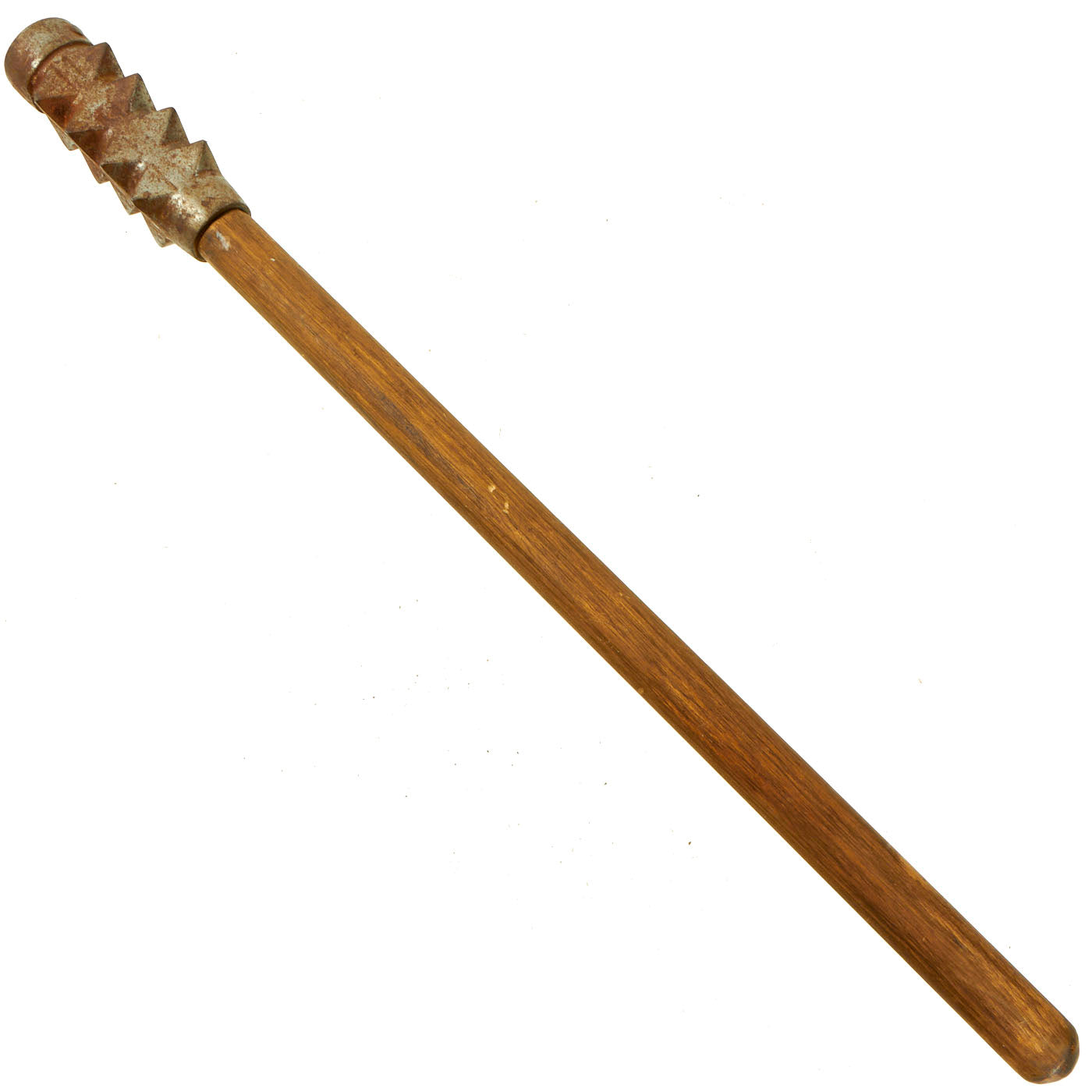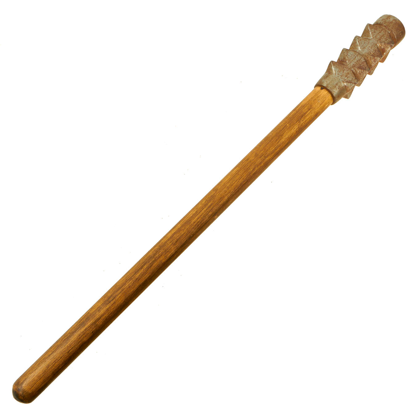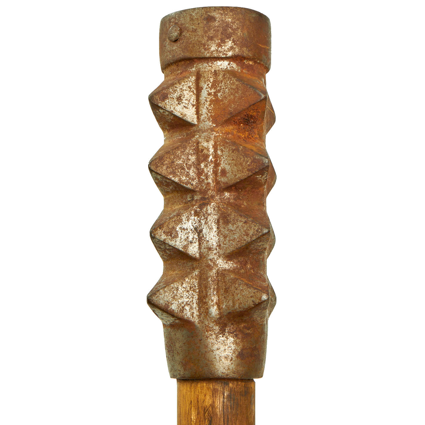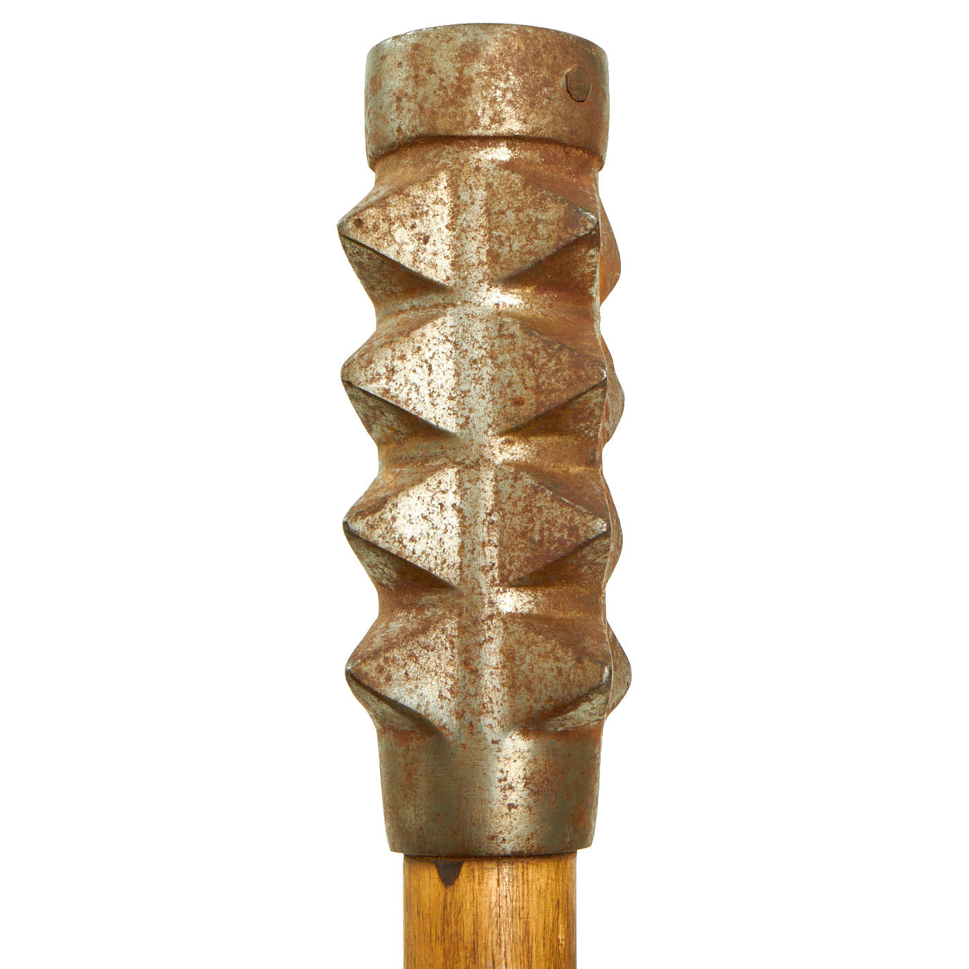 Original Item: Only One Available. This incredible example has a massive 24 inch wood shaft with a 5 inch barbed steel head. The base of the shaft has a tooled grip and is a possible replacement. The head of the club is encircled with four rows of four spikes, which would shatter a soldier's skull with ease. Reminiscent of a medieval design, this was a gruesome weapon.