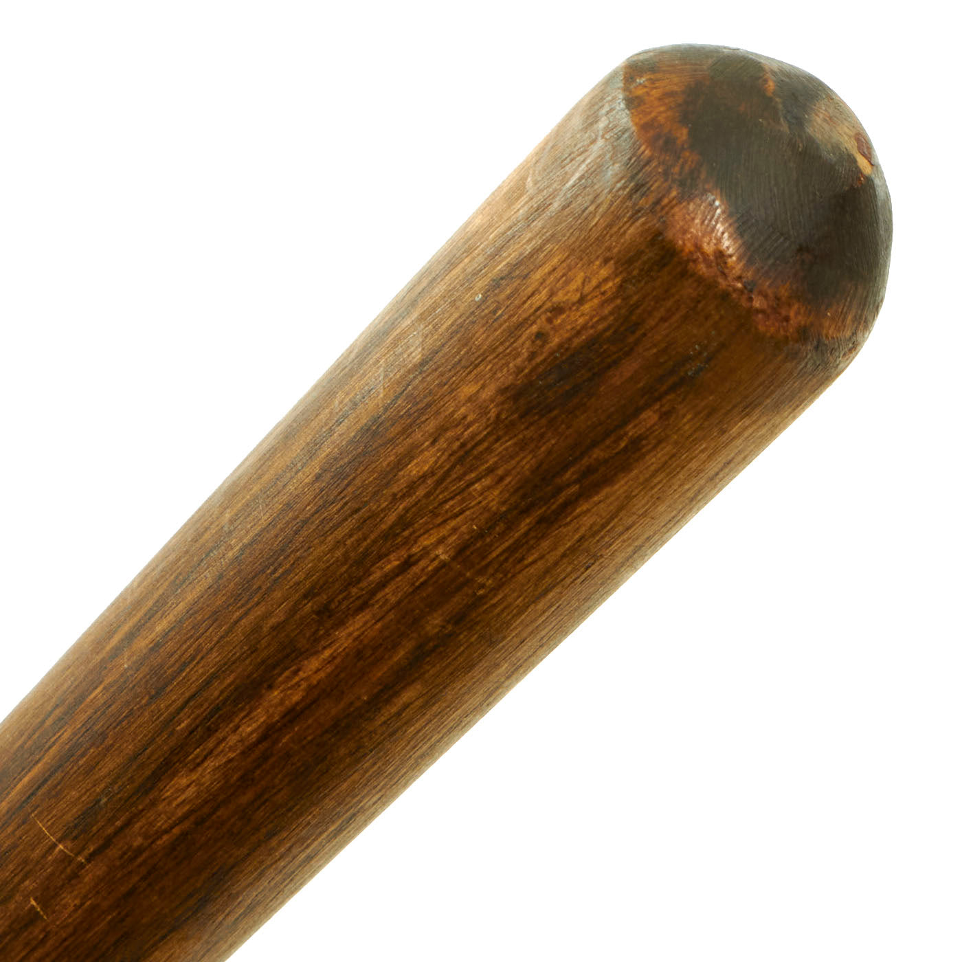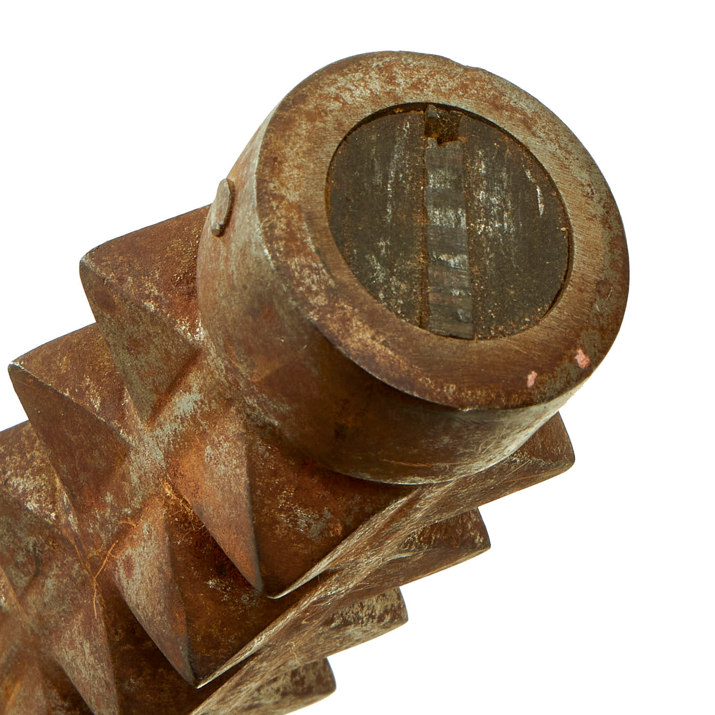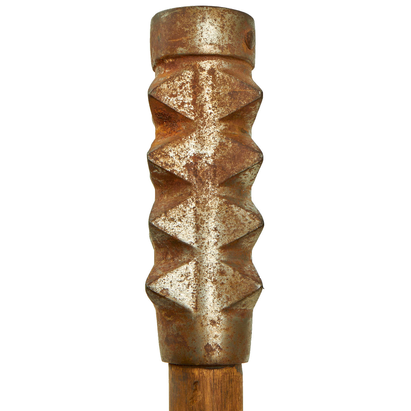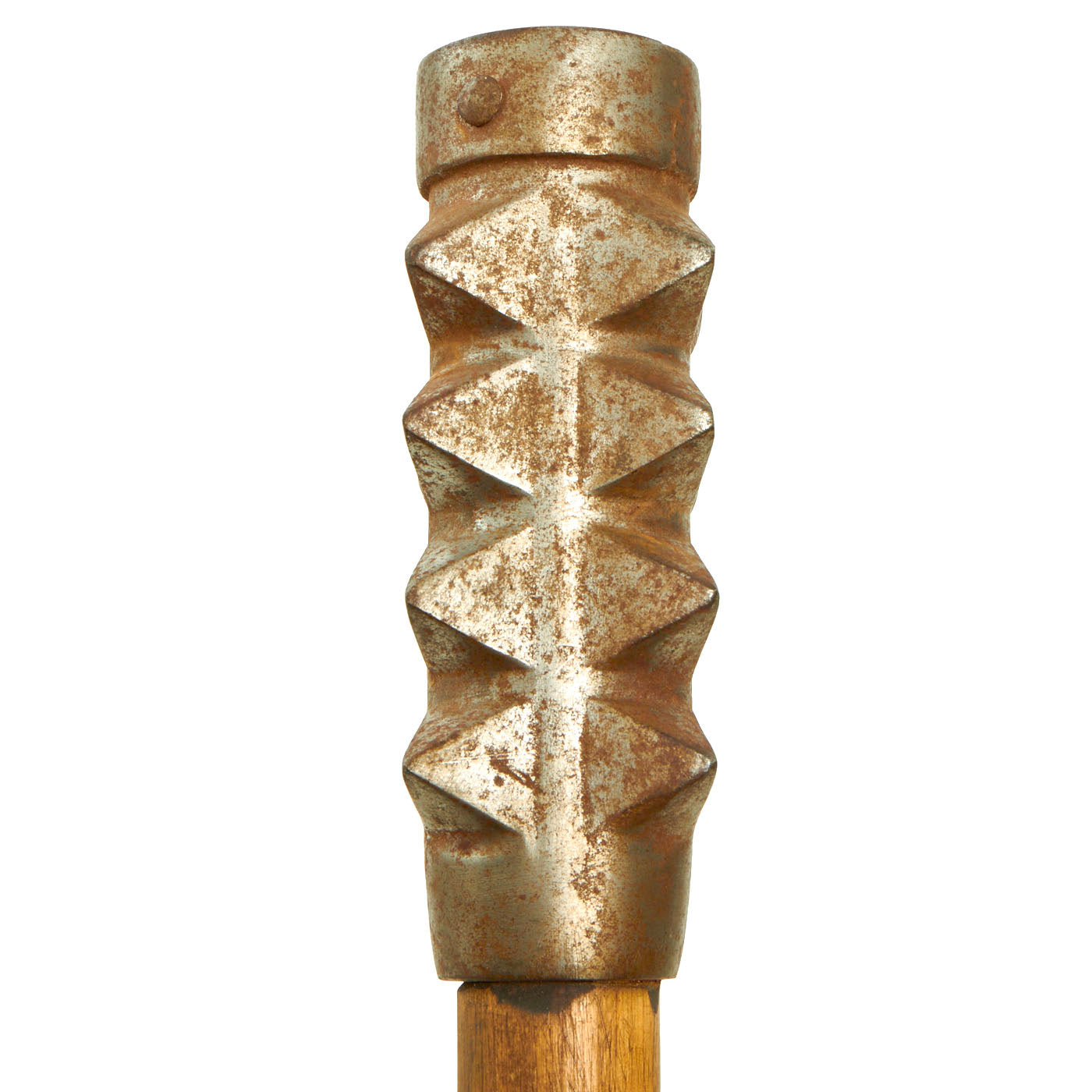 Original Item: Only One Available. This incredible example has a massive 24 inch wood shaft with a 5 inch barbed steel head. The base of the shaft has a tooled grip and is a possible replacement. The head of the club is encircled with four rows of four spikes, which would shatter a soldier's skull with ease. Reminiscent of a medieval design, this was a gruesome weapon.