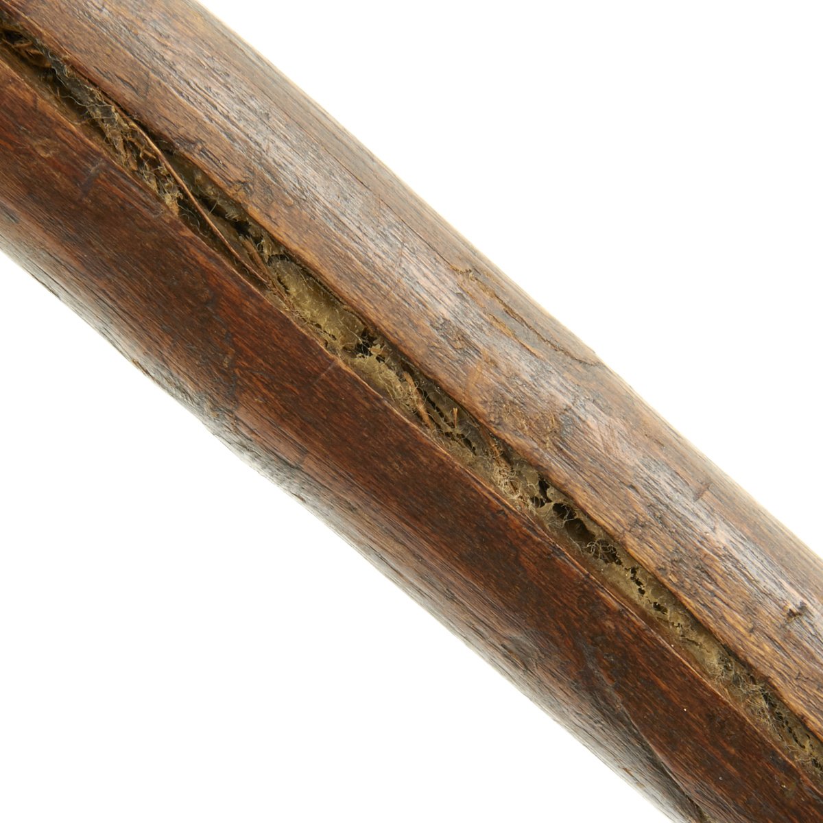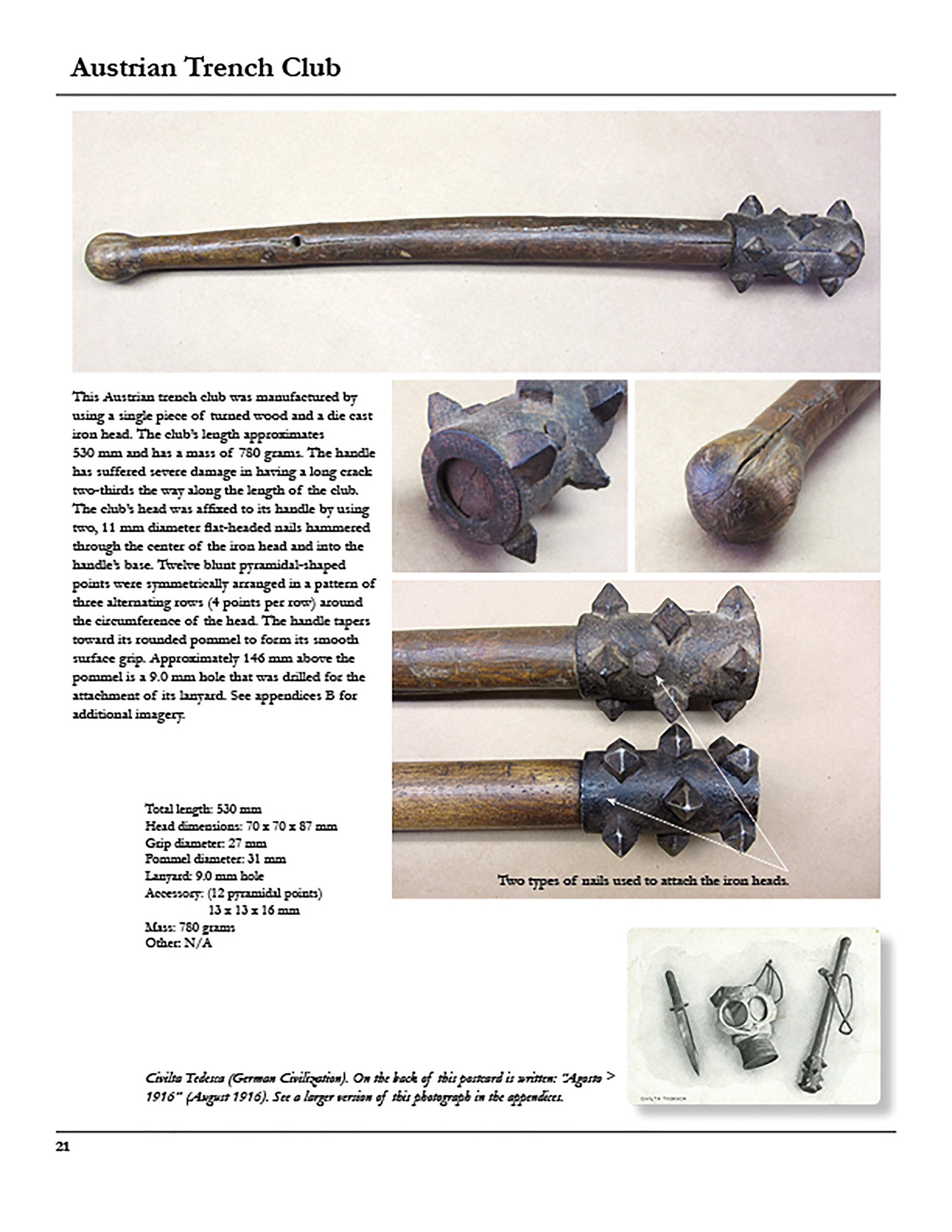 This Austrian trench club was manufactured by using a single piece of turned wood and a die cast iron bead. The club's length is approximately 12 inches and has a mass of 1.8 pounds. The handle has some minor damage with a long crack two-thirds the way along the length of the club, but this does not effect its stability as the crack is shallow and does not run through the shaft. The club's head was affixed to its handle by using two, 11 mm diameter flat-headed nags hammered through the center of the iron head and into the handle's base. Twelve blunt pyramidal-shaped points were symmetrically arranged in a pattern of three alternating rows (4 points per row) around the circumference of the head. The handle tapers toward its rounded pommel to form a smooth surface grip. Approximately 146mm above the pommel is a 9mm drilled hole that was drilled for the attachment of a lanyard.