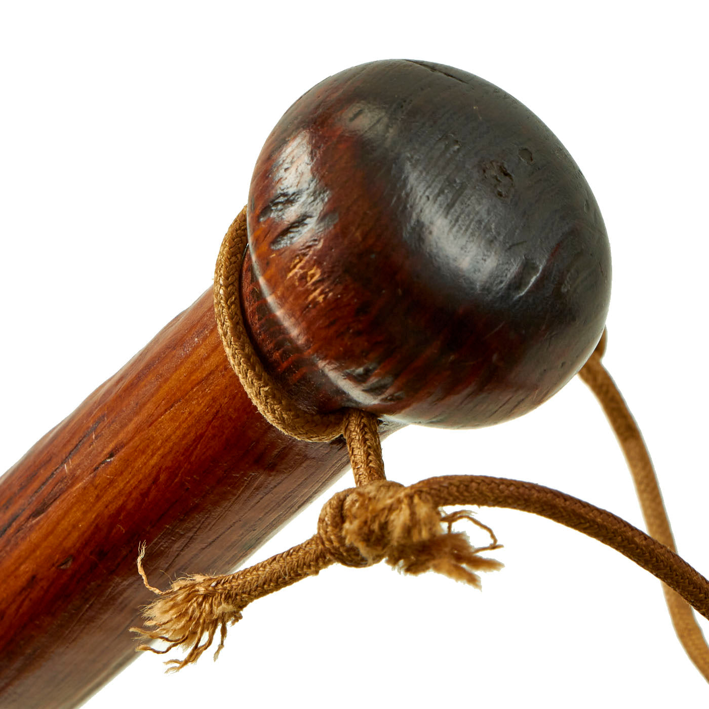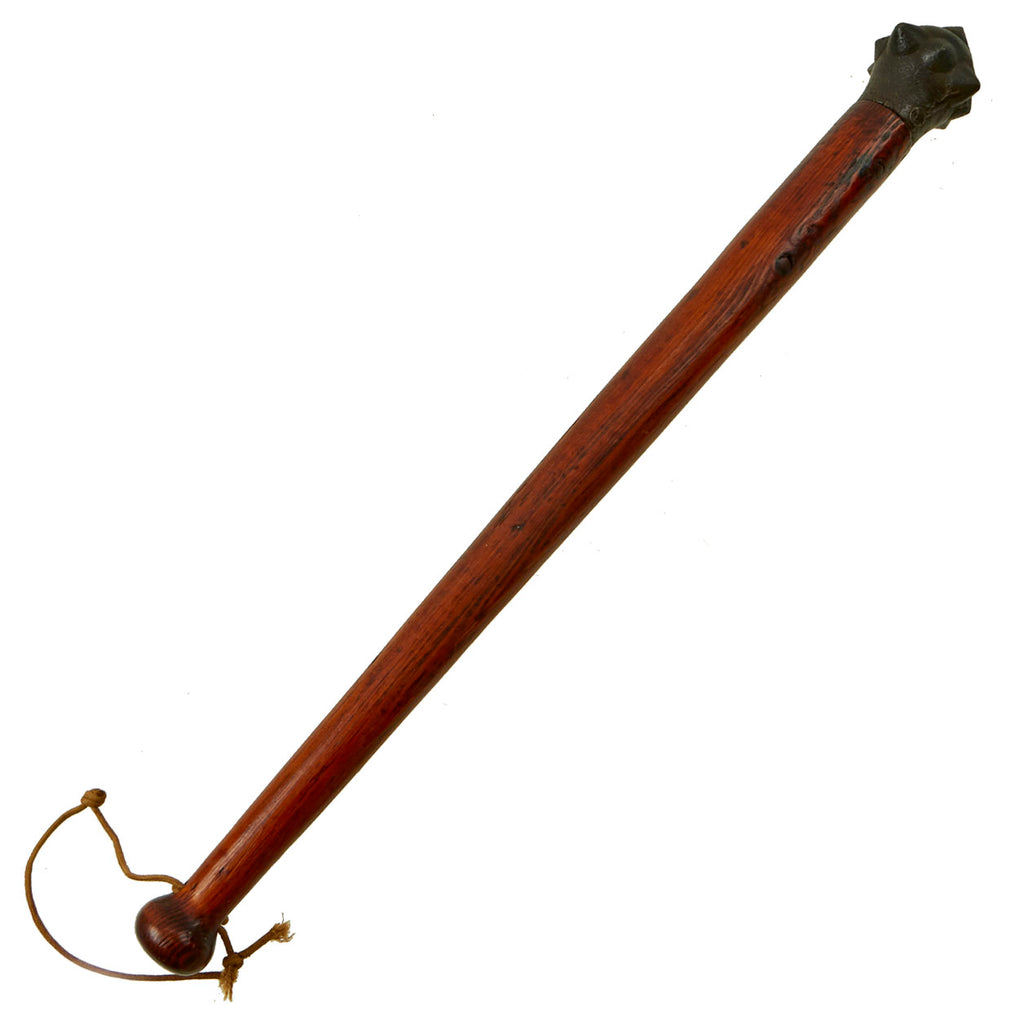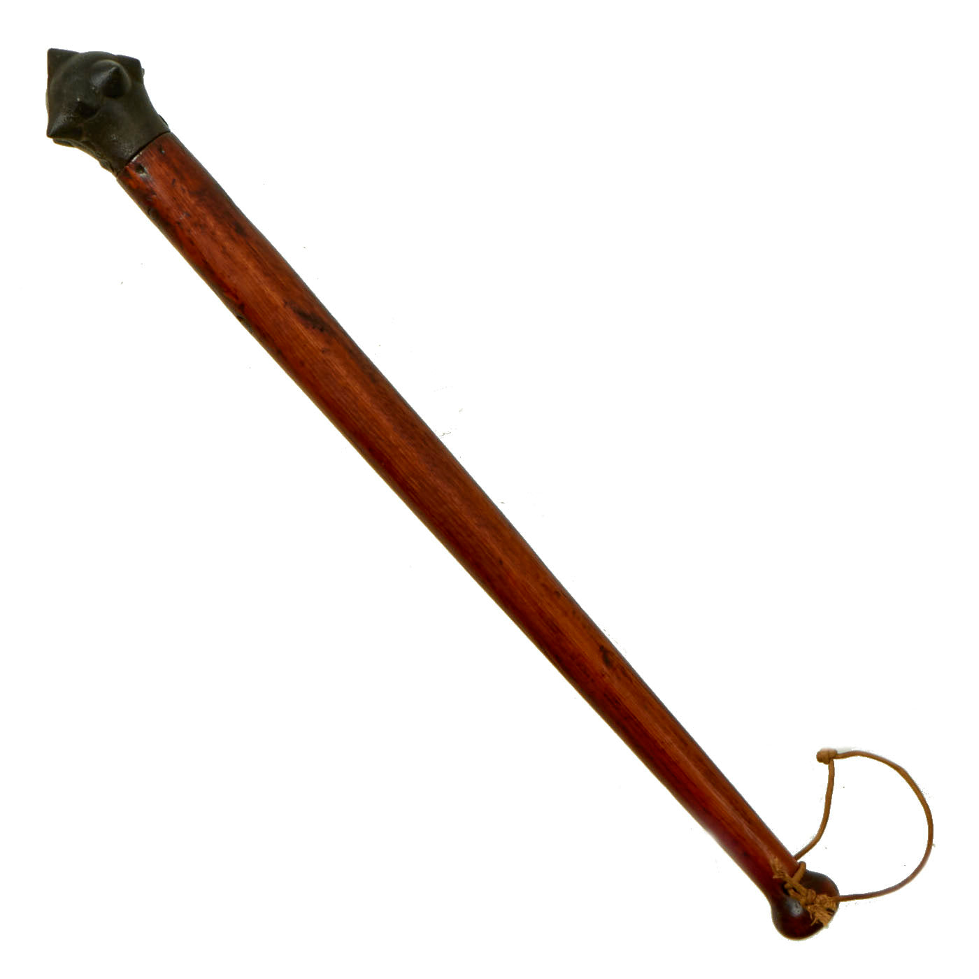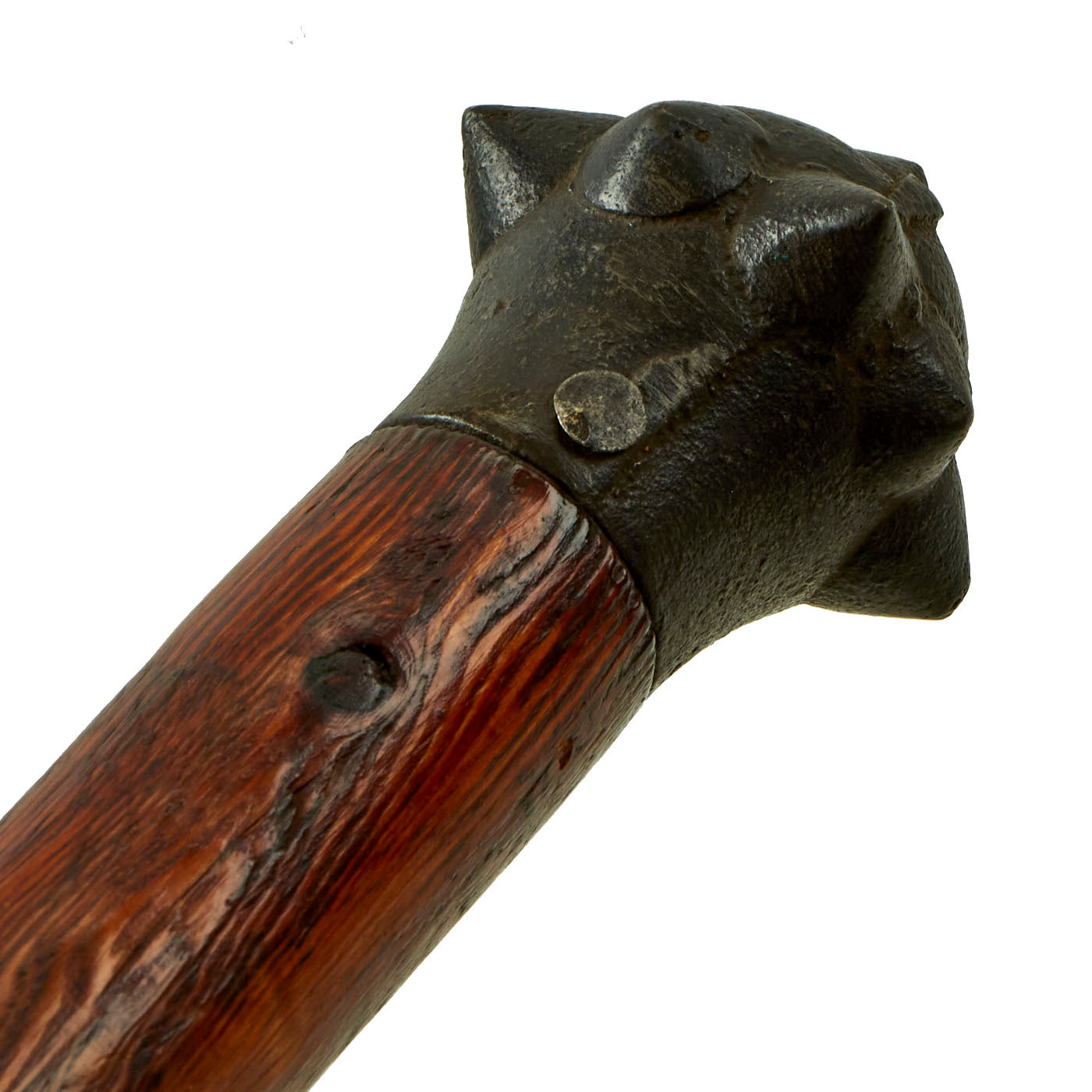 Used in raids against the Imperial Russian trenches on the Eastern Front in WWI, this issued club is patterned after the Knight's Maces of the 13th and 14th centuries. It features a heavy cast iron head, surrounded by circular type pyramid projections with one on the top, which could deliver a devastating blow to any foe. Certainly rendering an opponent wearing a Steel Helmet unconscious and suitable for taking back to friendly lines.