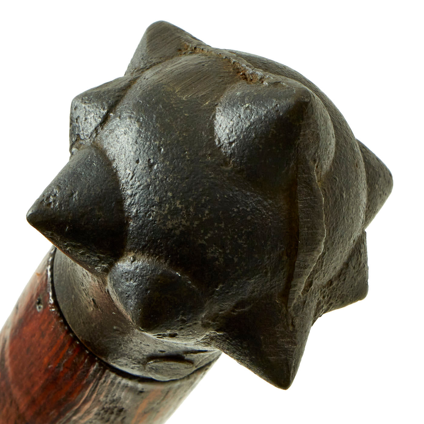 This example is mounted on a 20 ¾” stout wood shaft and 1 ½” across this was and is a formidable weapon. The wood handle appears to have been either refinished for preservation purposes or replaced, and the cast warhead shows some old rust deterioration.