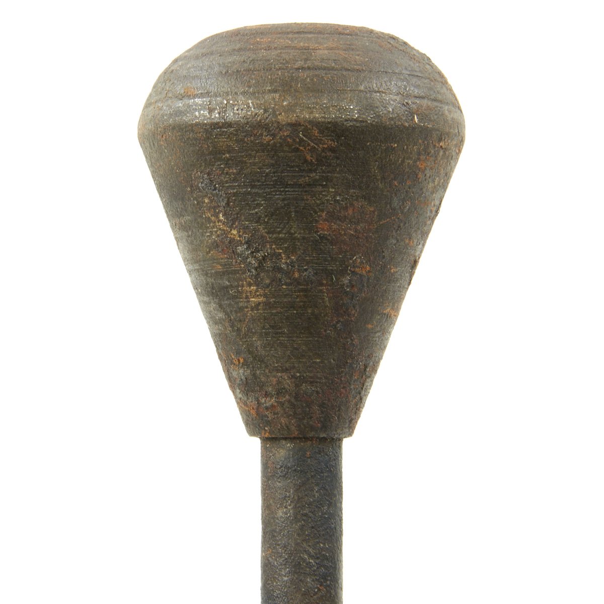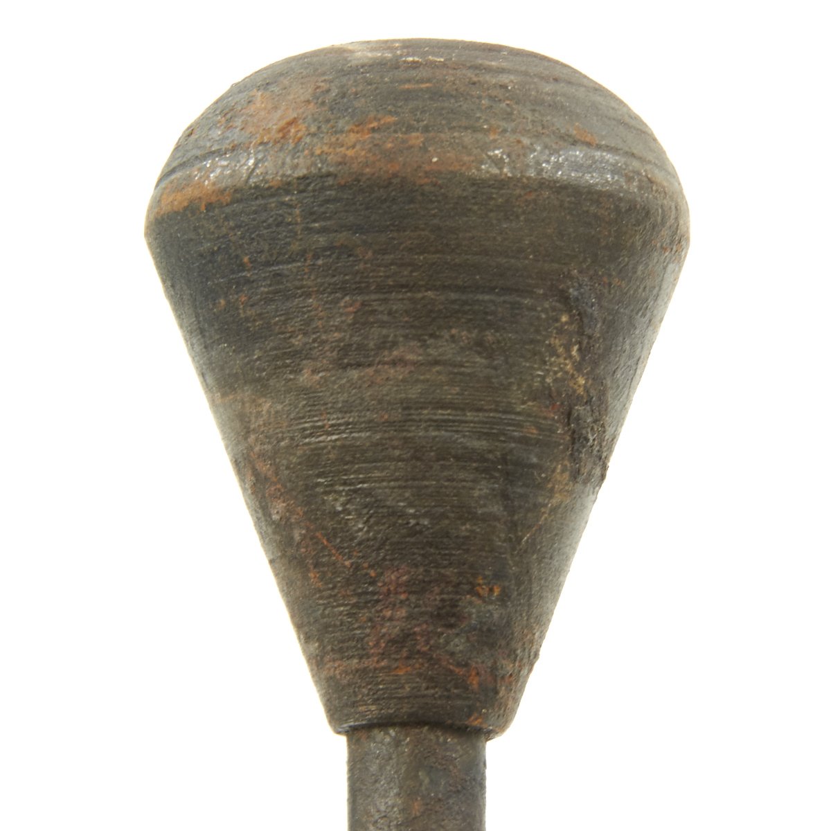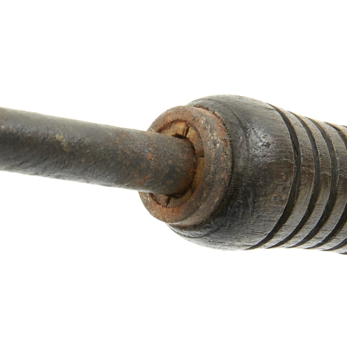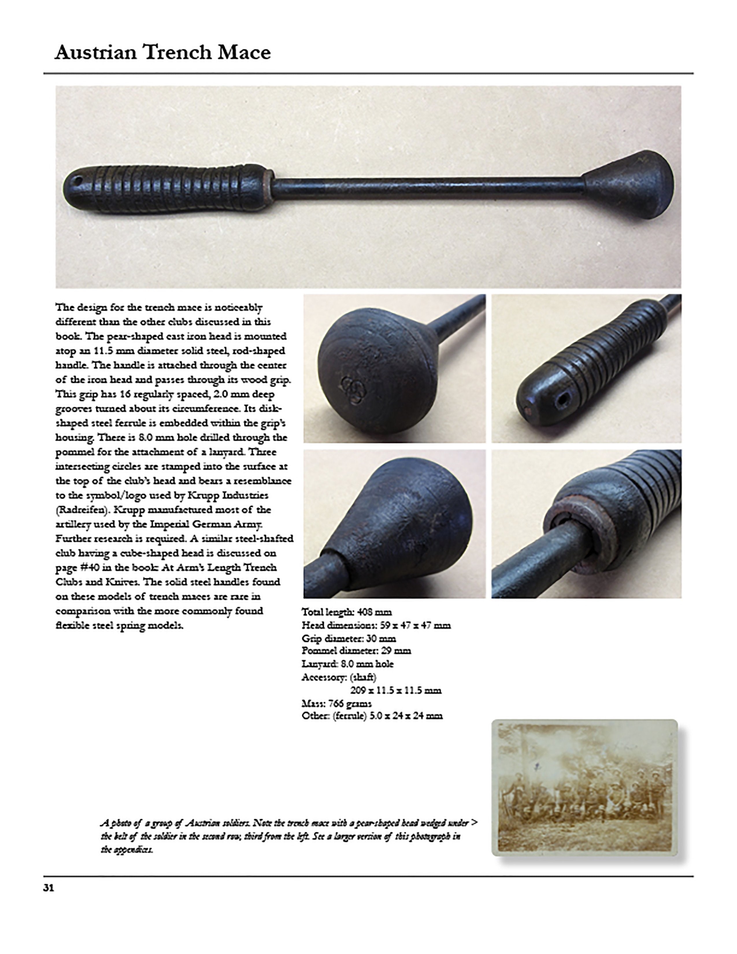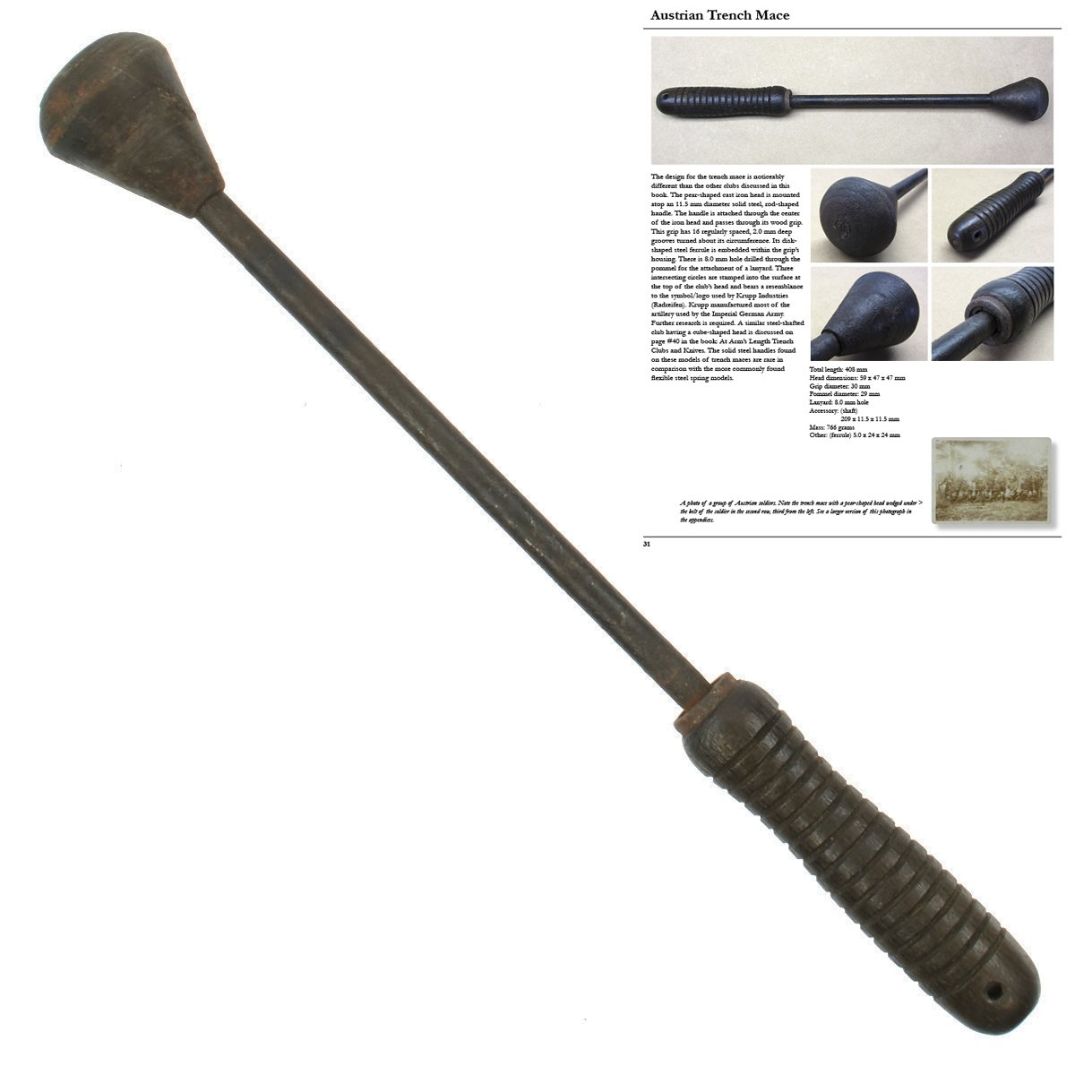 The design for the trench mace is noticeably different than many known Austrian World War One trench clubs. The pear-shaped cast iron head is mounted atop an 11.5 mm diameter solid steel, rod-shaped handle. The handle is attached through the center of the iron bead and passes through its wood grip. This grip has 16 regularly spaced, 2.0 mm deep grooves turned about its circumference. It's disc-shaped steel ferrule is embedded within the grip's housing. There is 8.0 mm hole drilled through the pommel for the attachment of a lanyard. Three intersecting circles are stamped into the surface at the top of the club's head and bear a resemblance to the symbol/logo used by Krupp Industries (Radreifen). Krupp manufactured most of the artillery used by the Imperial German Army. Further research is required. The solid steel handles found on these models of trench maces are rare in comparison with the more commonly found flexible steel spring models. Total length is 16.5 inches.