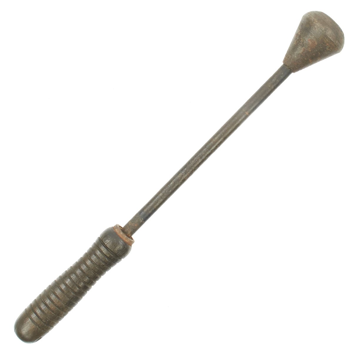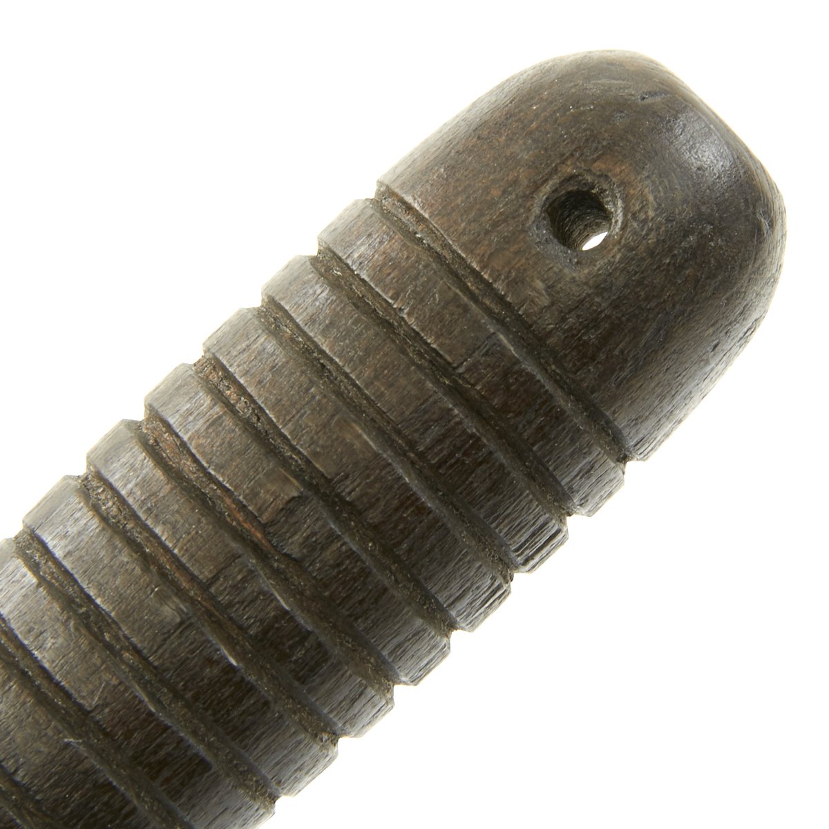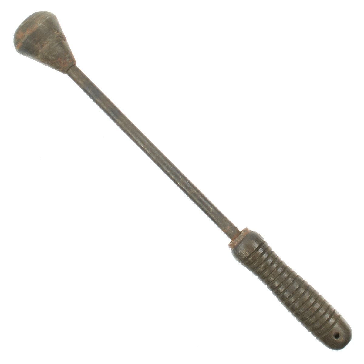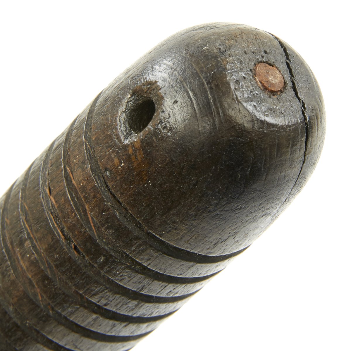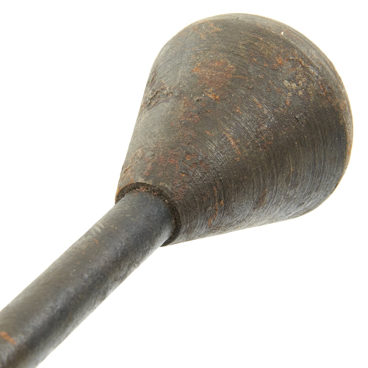 The design for the trench mace is noticeably different than many known Austrian World War One trench clubs. The pear-shaped cast iron head is mounted atop an 11.5 mm diameter solid steel, rod-shaped handle. The handle is attached through the center of the iron bead and passes through its wood grip. This grip has 16 regularly spaced, 2.0 mm deep grooves turned about its circumference. It's disc-shaped steel ferrule is embedded within the grip's housing. There is 8.0 mm hole drilled through the pommel for the attachment of a lanyard. Three intersecting circles are stamped into the surface at the top of the club's head and bear a resemblance to the symbol/logo used by Krupp Industries (Radreifen). Krupp manufactured most of the artillery used by the Imperial German Army. Further research is required. The solid steel handles found on these models of trench maces are rare in comparison with the more commonly found flexible steel spring models. Total length is 16.5 inches.