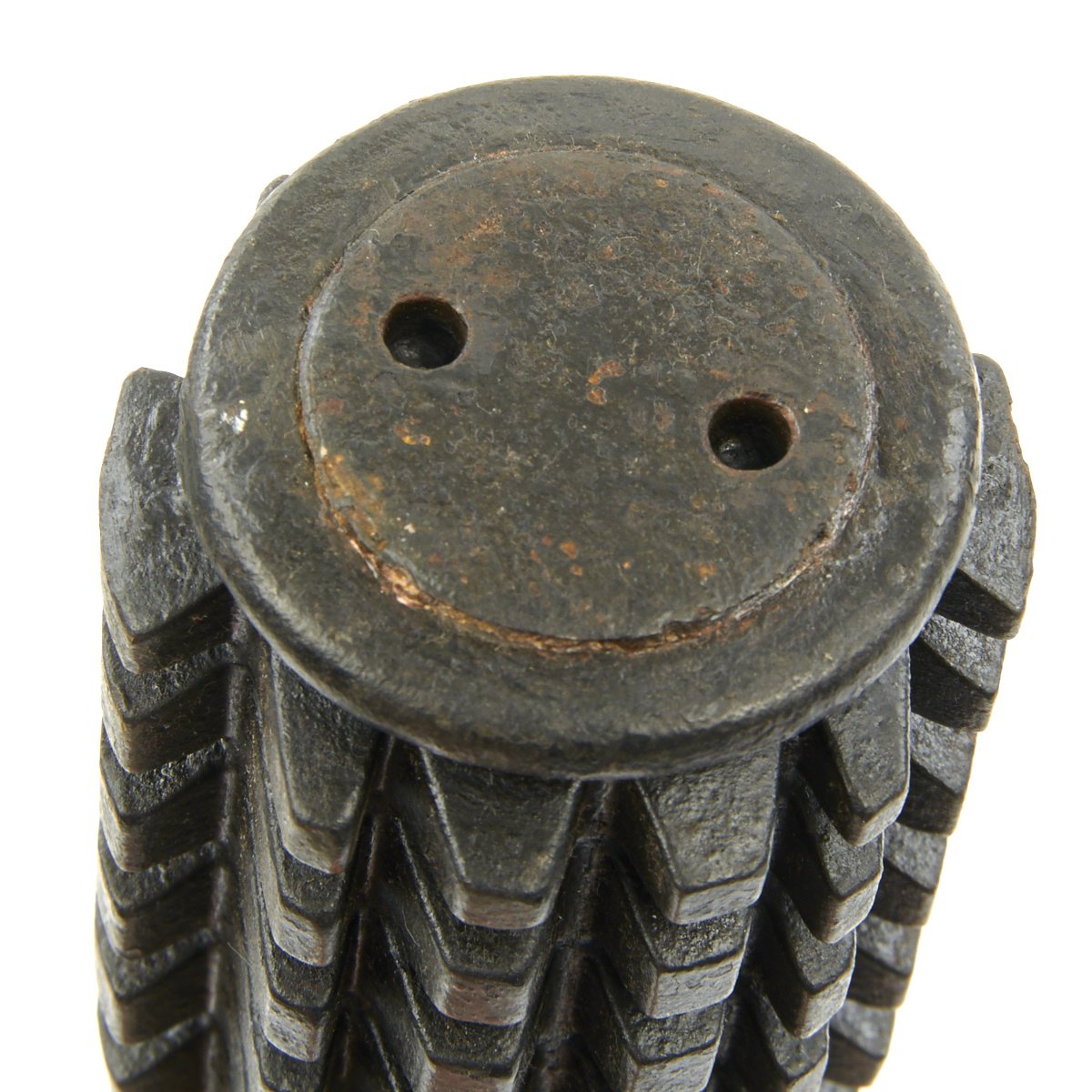The first variant is heavily segmented, both inside and out, one of the most dramatic grenades in this regard. Acomparison of the Zeitzünder rod grenade can be made with its hand grenade counterpart the Rohrhandgranate. The body style is identical, threaded at both ends, allowing different fore and aft pieces to be substituted so the center casting could be configured to be either a rifle or hand grenade.