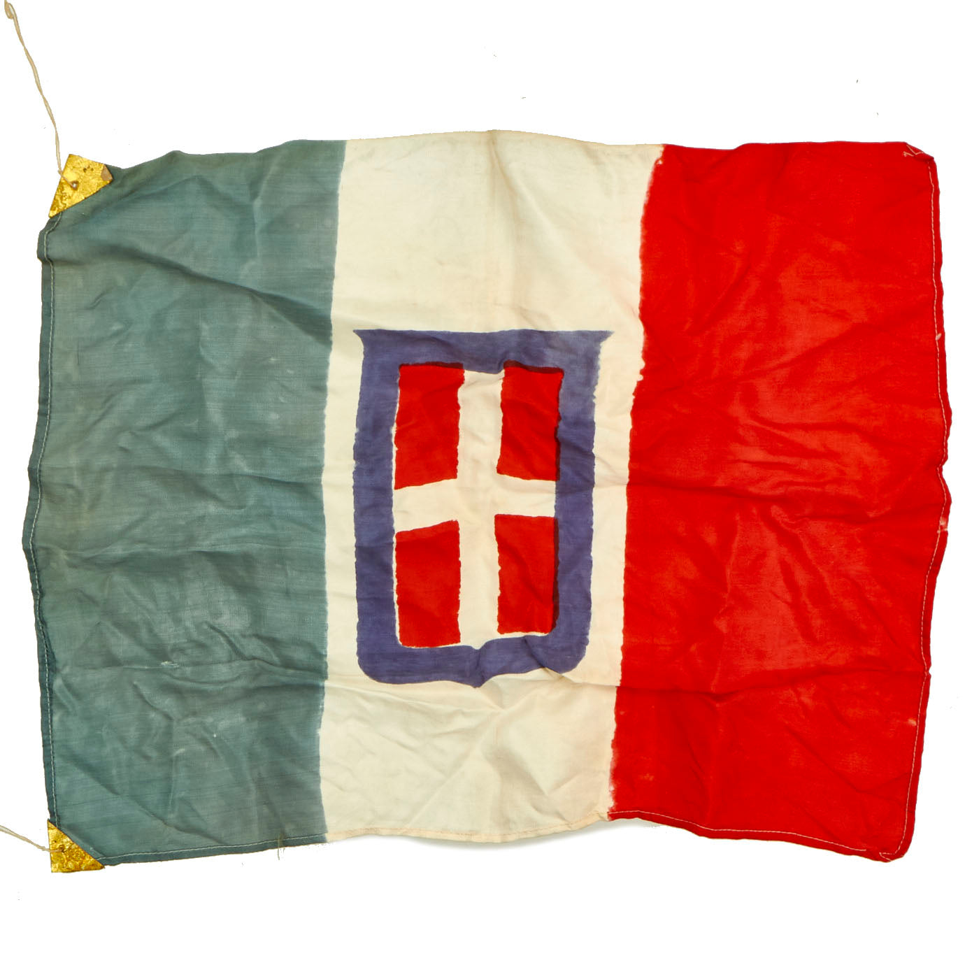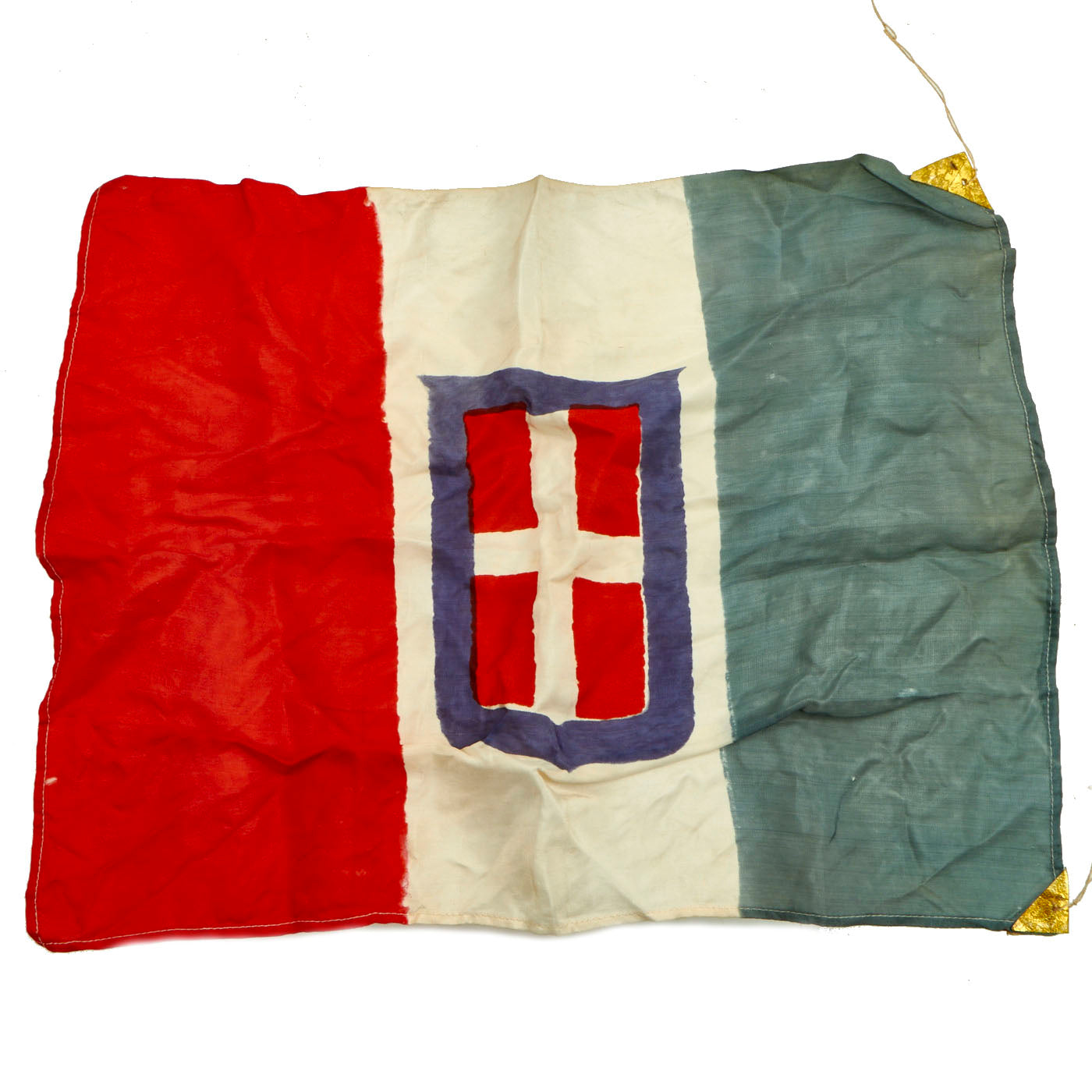 - Kingdom of Italy Flag With Savoy Coat of Arms 16” x 13”: This flag is much smaller than the Belgian flag and is in similar condition with all colors dyed instead of being separate construction. The national flag of Italy, often referred to in Italian as il Tricolore, is a tricolor featuring three equally sized vertical pales of green, white and red, national colors of Italy, with the green at the hoist side, as defined by article 12 of the Constitution of the Italian Republic. The Italian law regulates its use and display, protecting its defense and providing for the crime of insulting it; it also prescribes its teaching in Italian schools together with other national symbols of Italy.