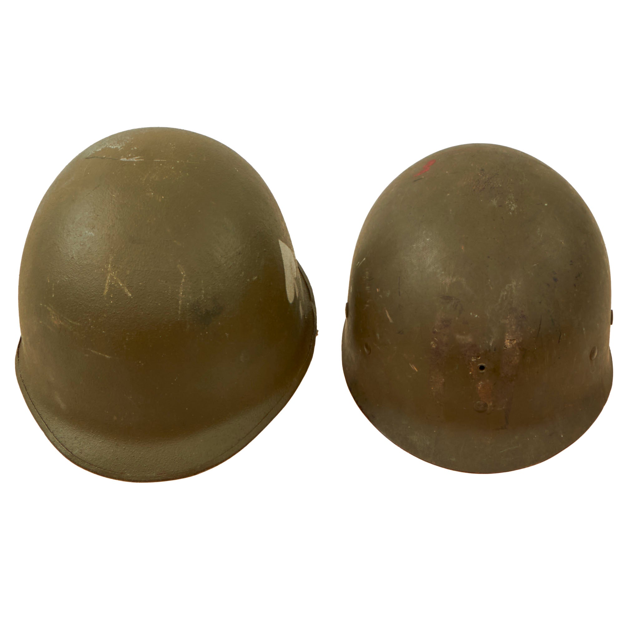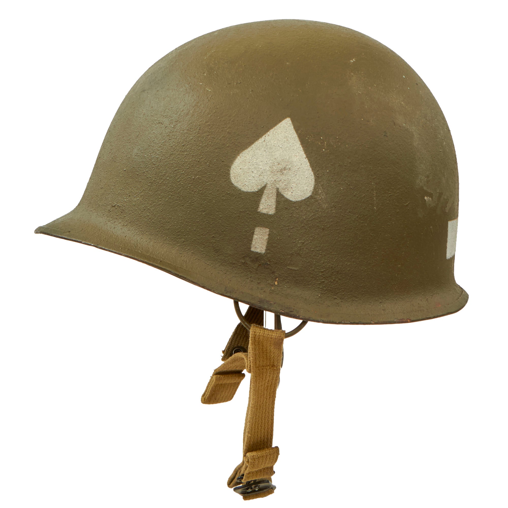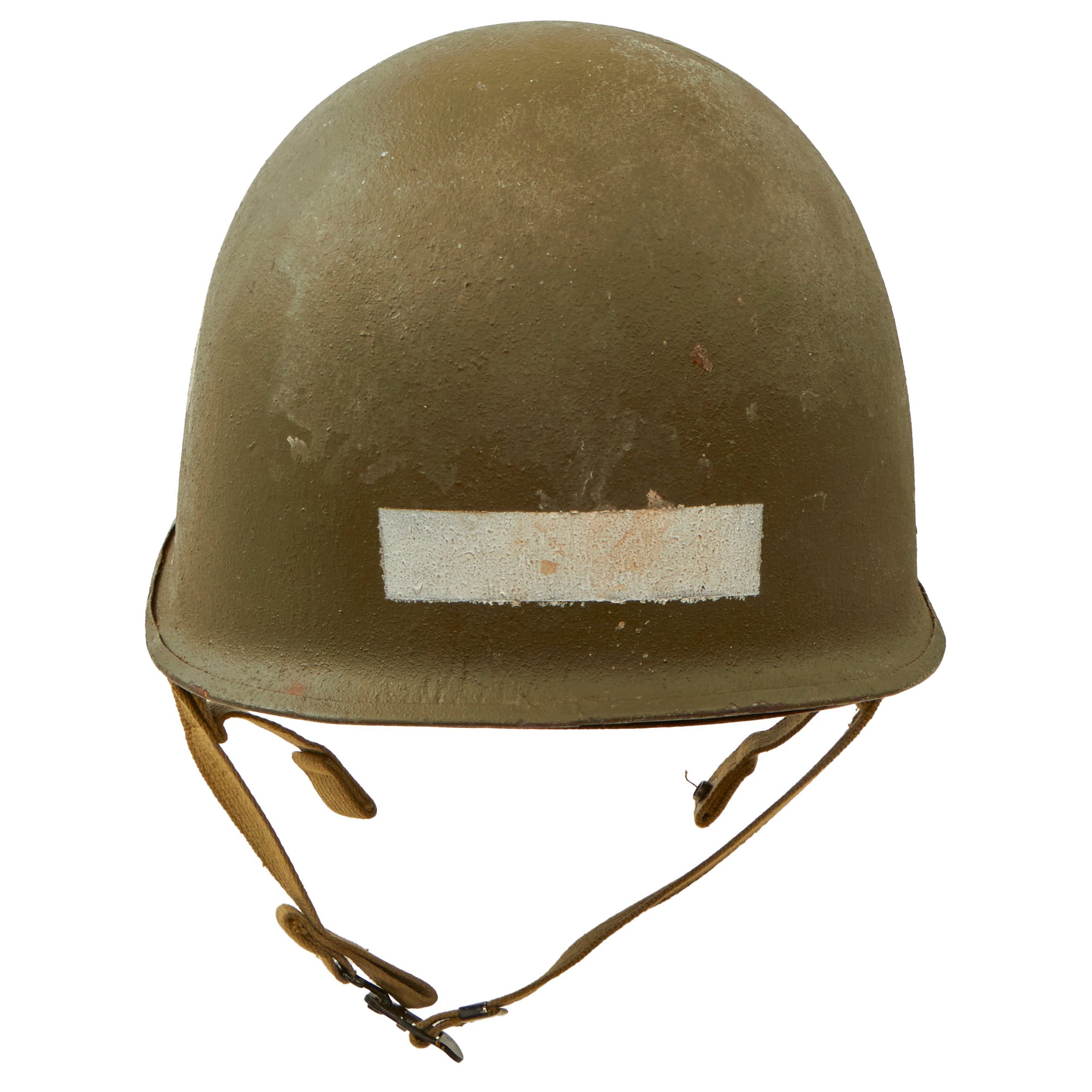 Original Item: Only One Available. This is a lovely, complete example of a famed 101st Airborne Division, 506th Parachute Infantry Regiment marked helmet. The helmets we normally encounter are the reconditioned Vietnam era M1 helmets, however, this was made from a late WWII shell with an original liner by Seaman’s. We were told that this helmet was used in Band of Brothers, and matches similar examples that have been sold on the market, but we have no documentation to certify this claim.