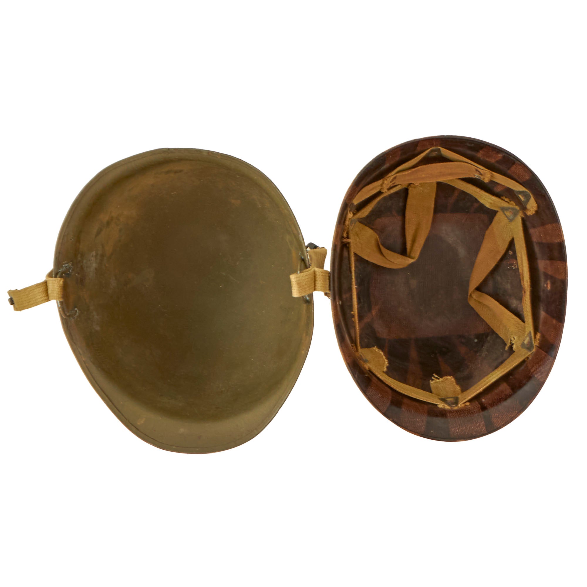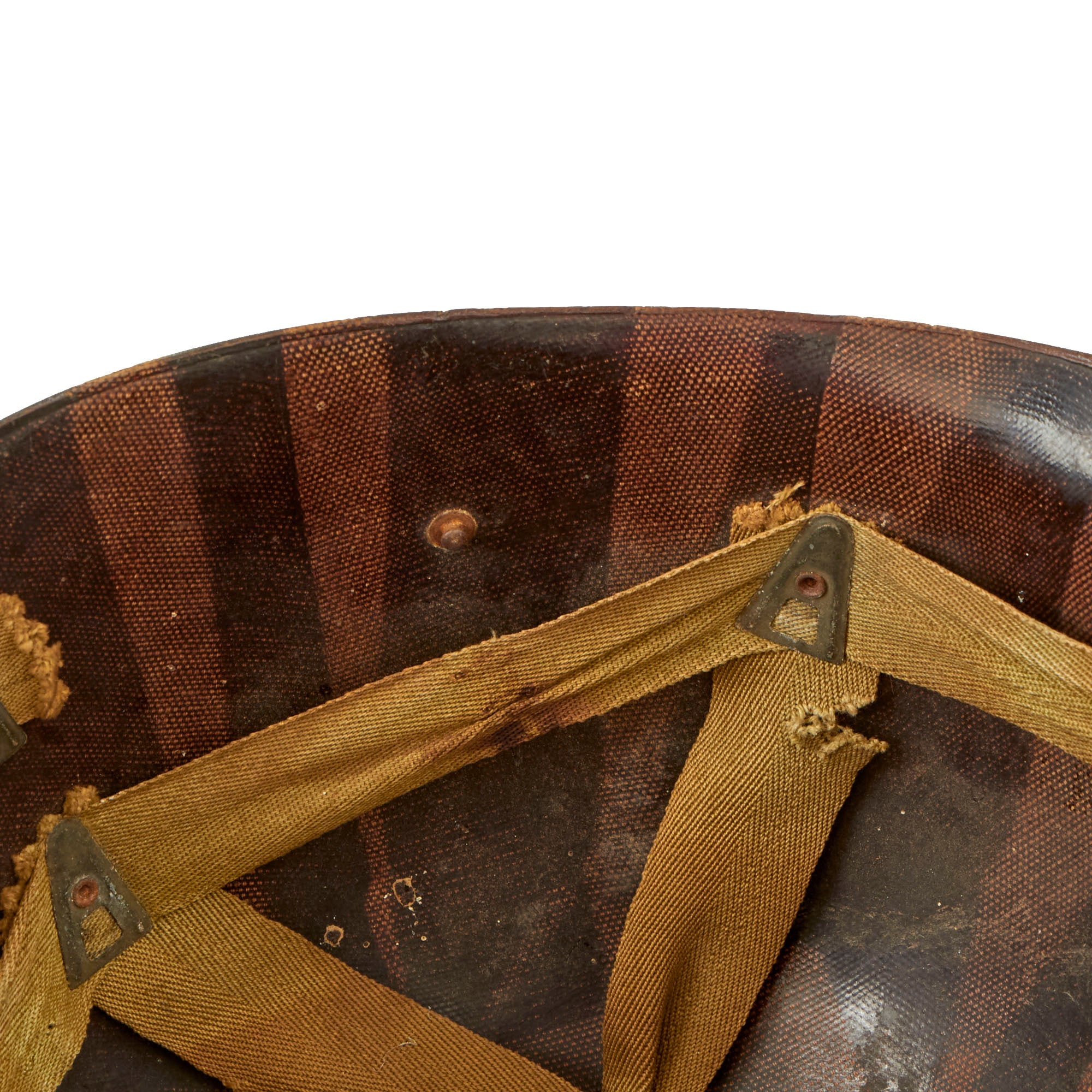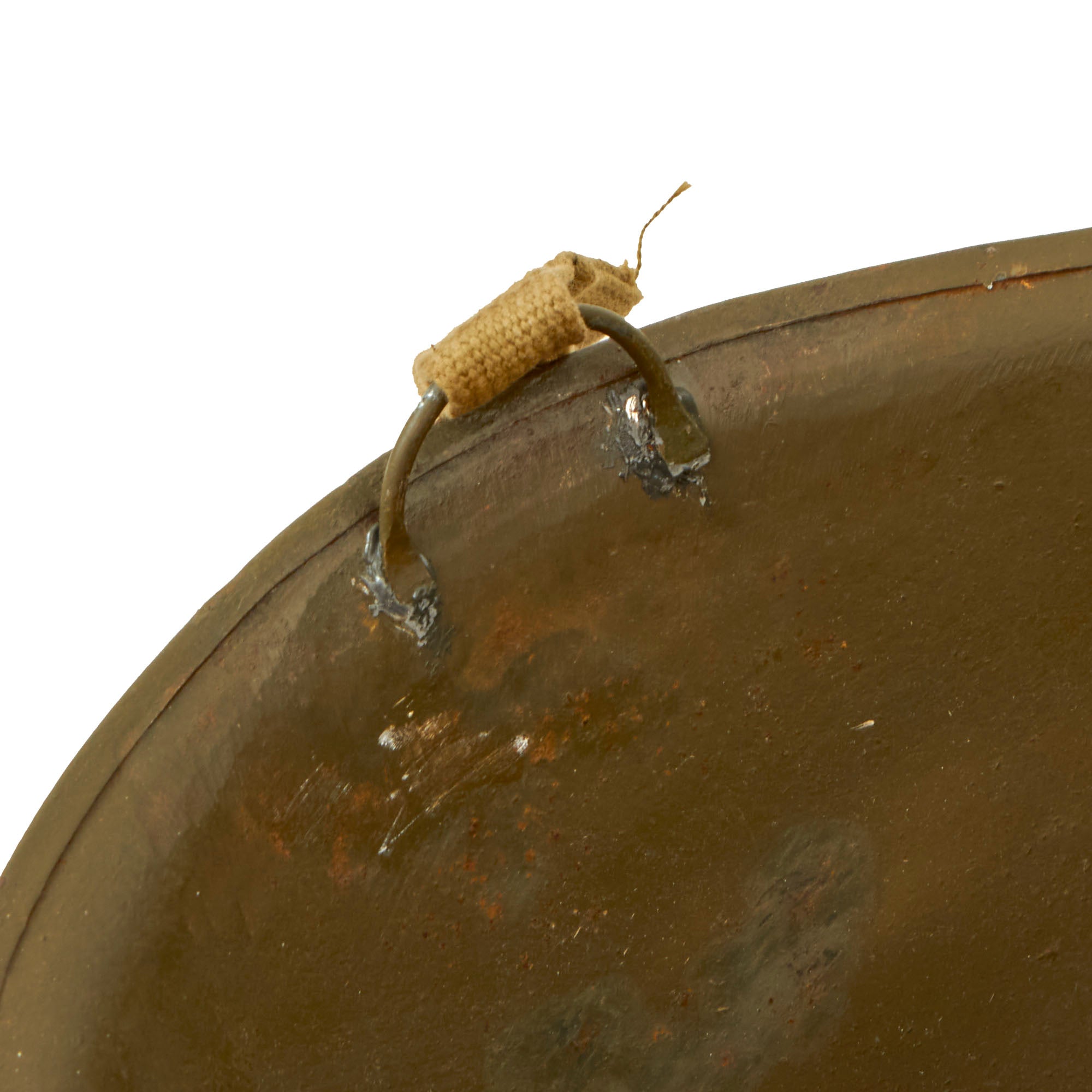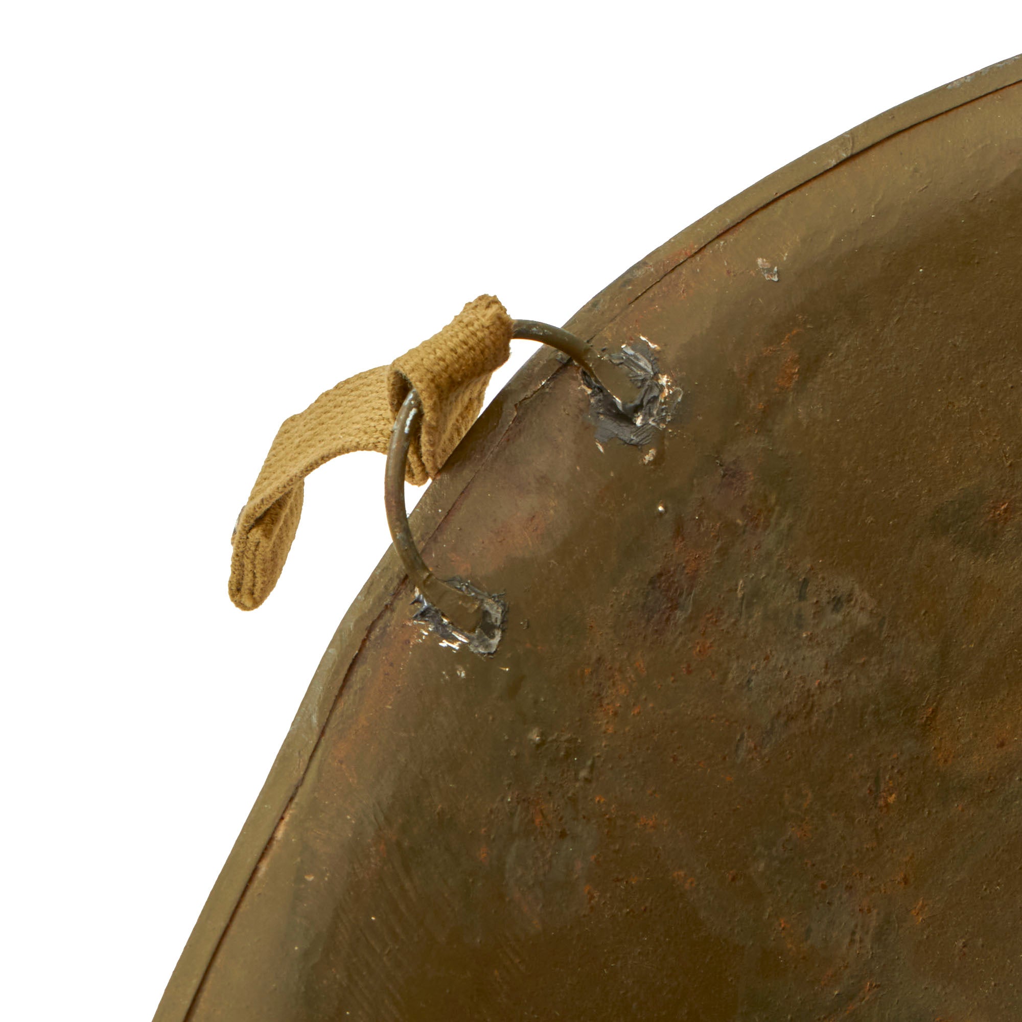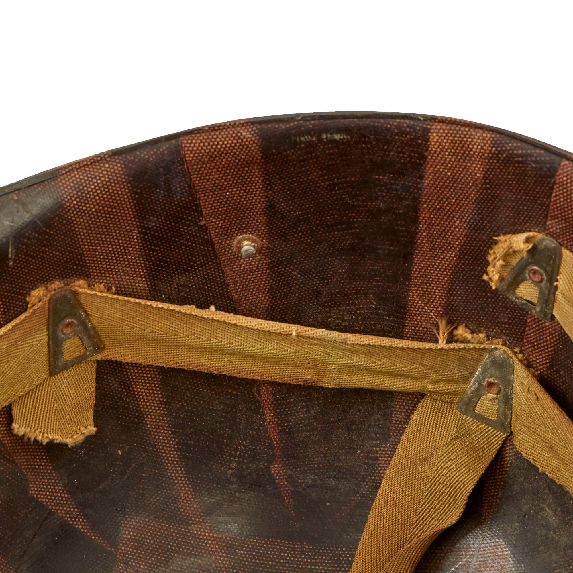 The liner is correct high pressure WWII issue and stamped with a S for the SEAMAN PAPER COMPANY. Manufactured in Chicago, Illinois this "high pressure" manufactured M-1 helmet liner is identified by an embossed "S" in the crown. Seaman Paper Company started delivery to the US Army in September 1942. They produced approximately between 2,000,000 - 4,000,000 M-1 helmet liners and discontinued production around August 17, 1945 when the war ended. The liner is missing the majority of the suspension and the entire sweatband.