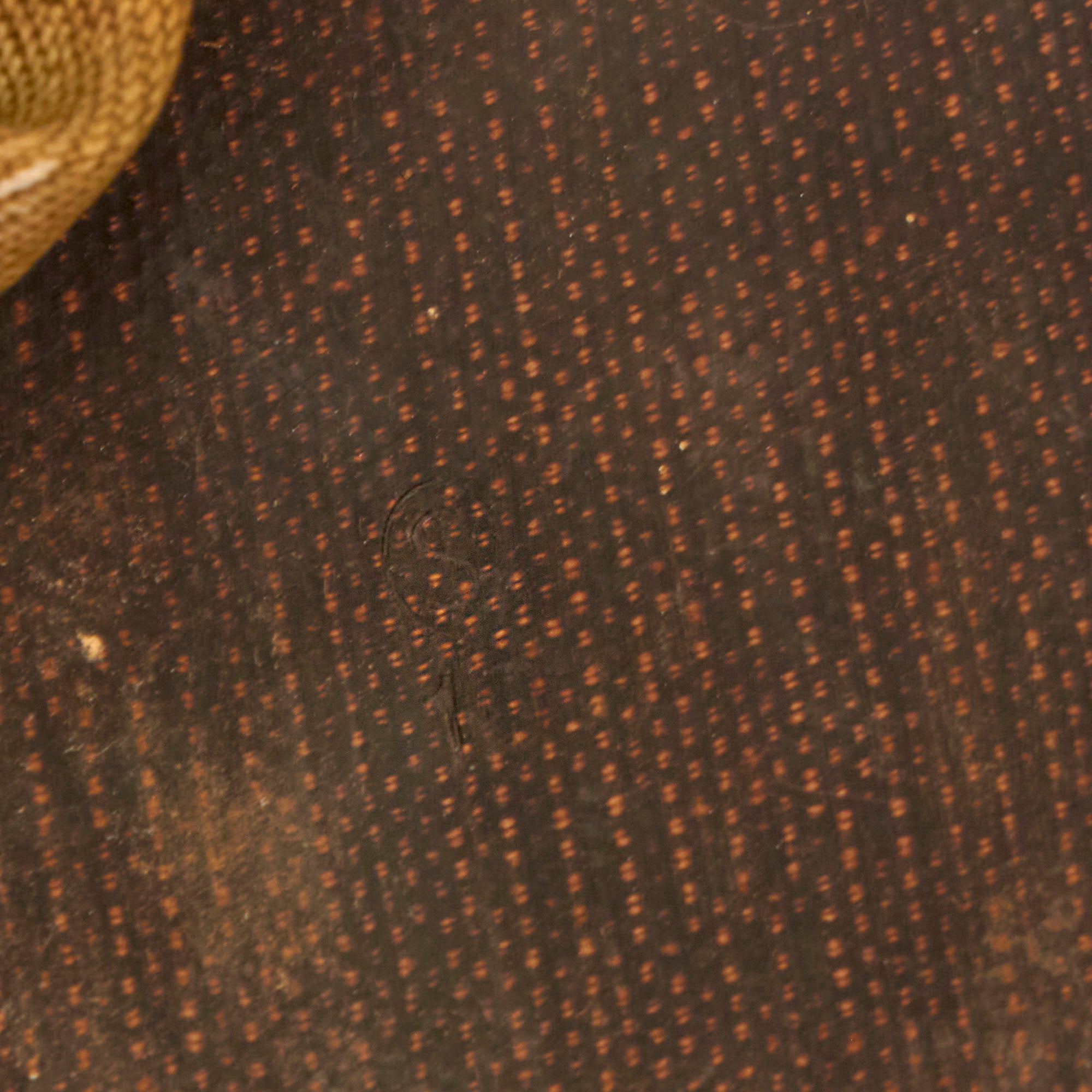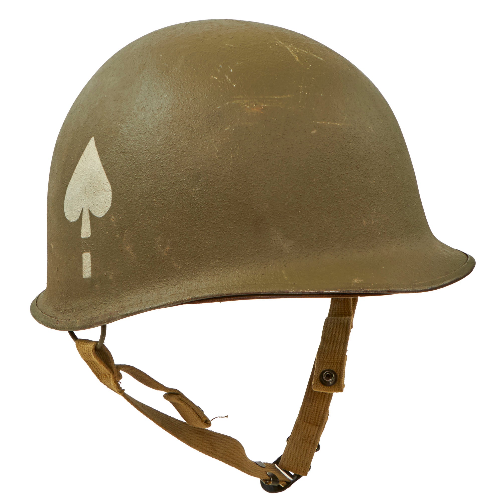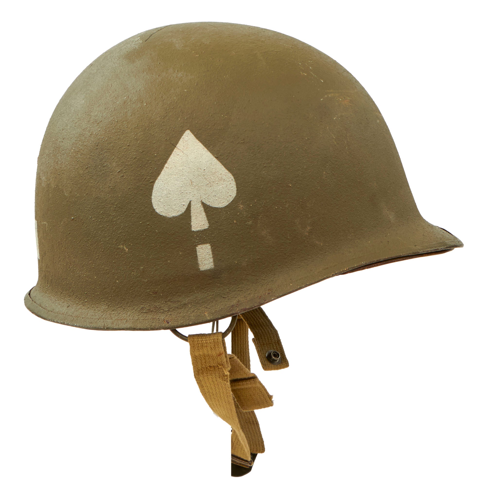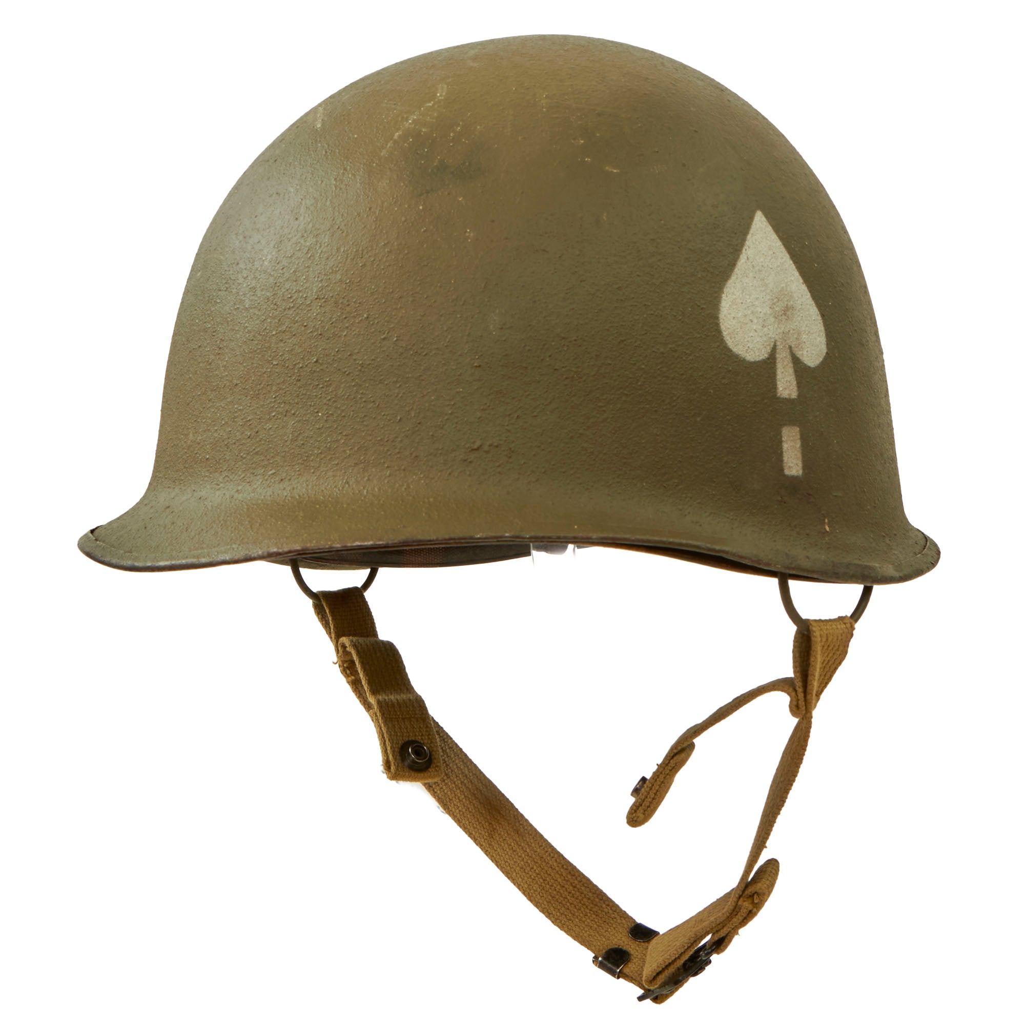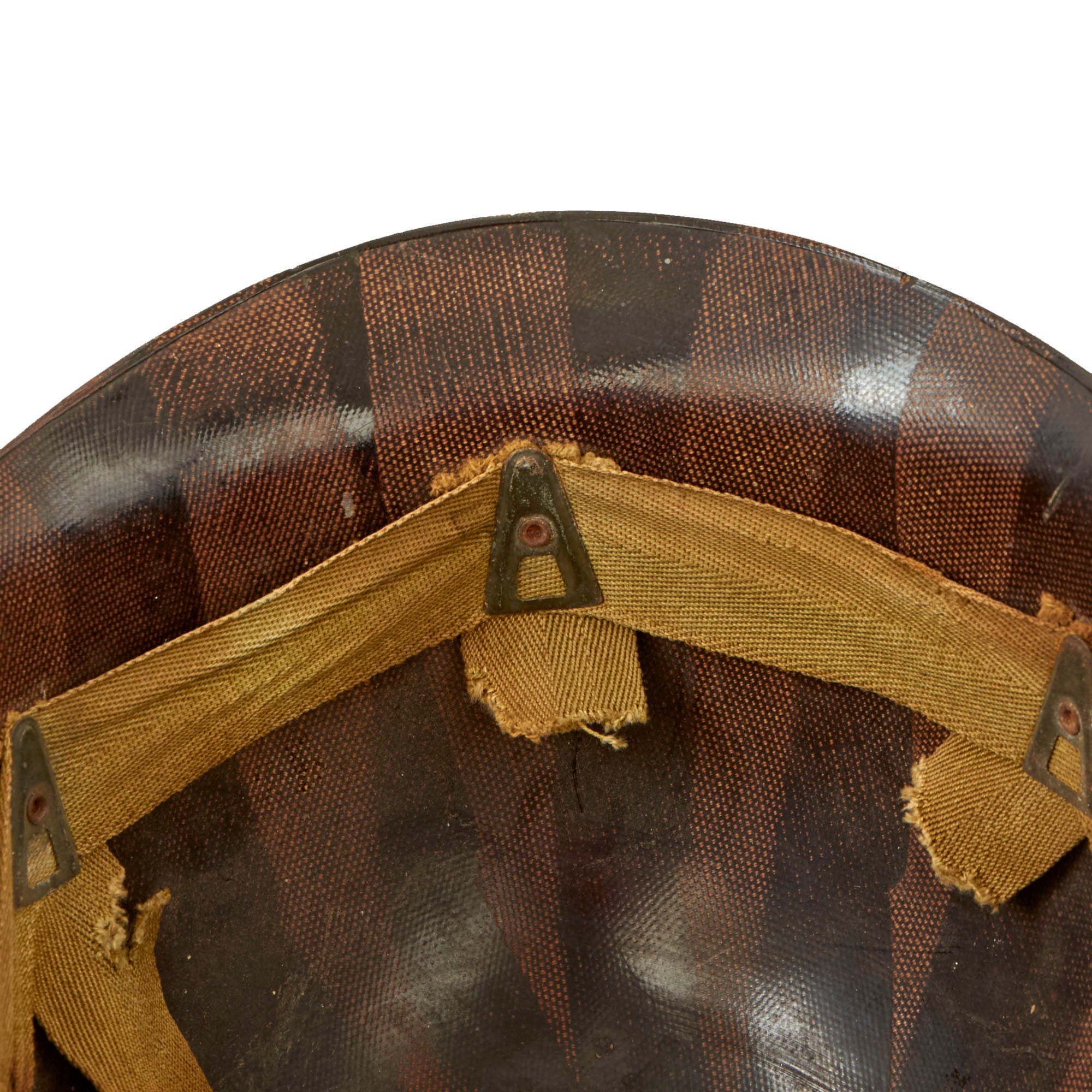 The liner is correct high pressure WWII issue and stamped with a S for the SEAMAN PAPER COMPANY. Manufactured in Chicago, Illinois this "high pressure" manufactured M-1 helmet liner is identified by an embossed "S" in the crown. Seaman Paper Company started delivery to the US Army in September 1942. They produced approximately between 2,000,000 - 4,000,000 M-1 helmet liners and discontinued production around August 17, 1945 when the war ended. The liner is missing the majority of the suspension and the entire sweatband.