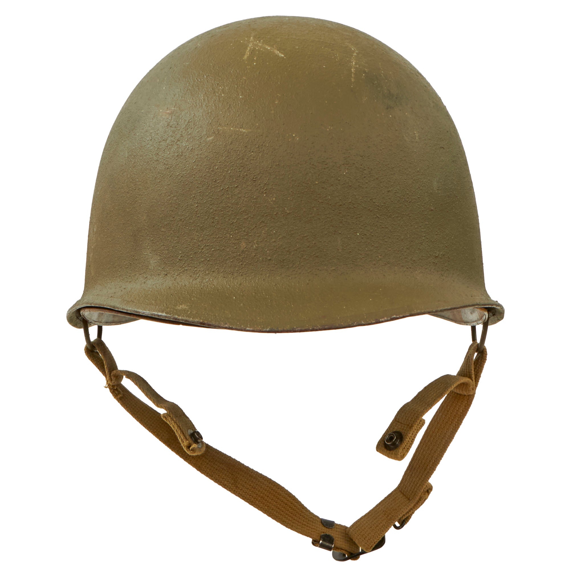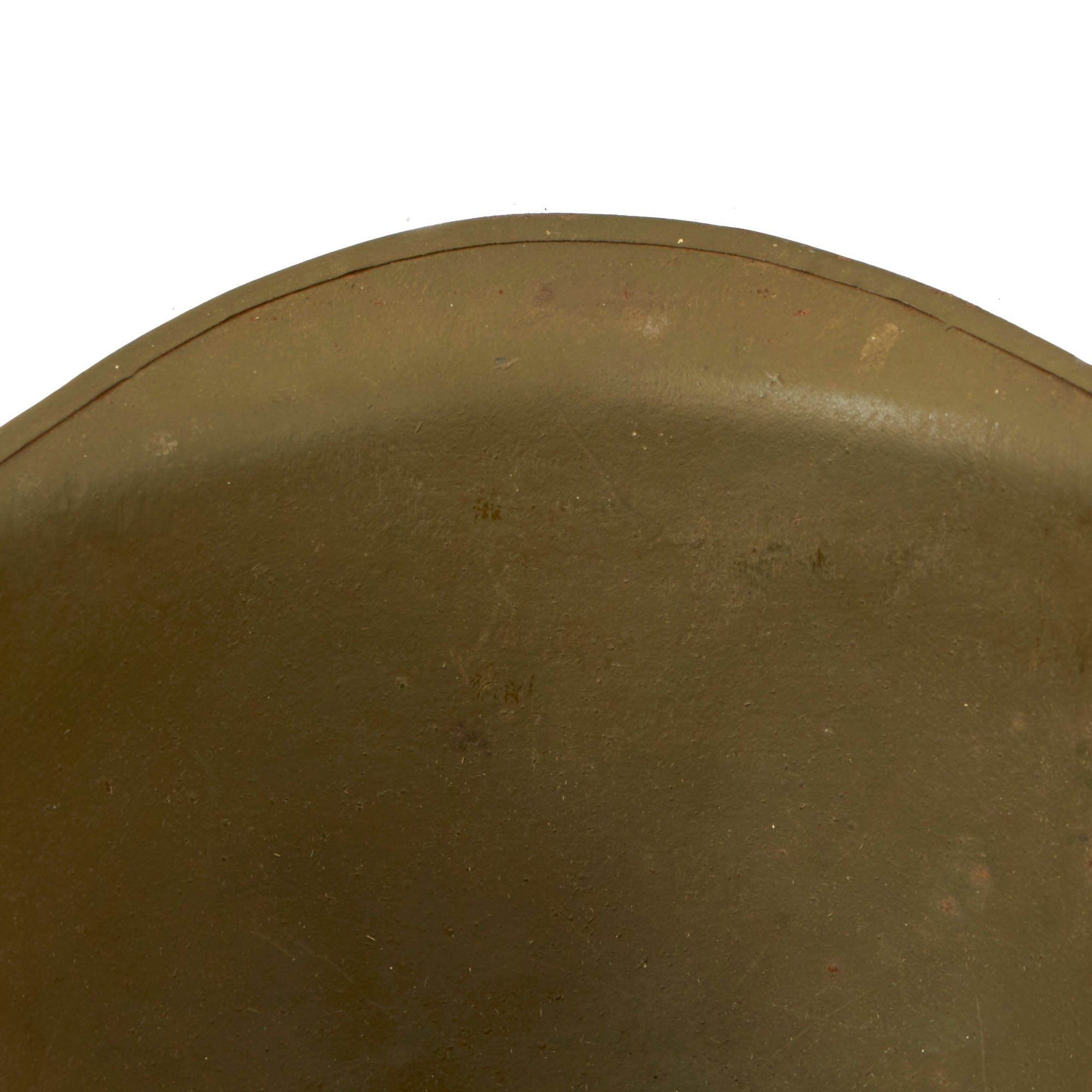The early M-1 helmet shells had a set of fixed (static) chinstrap loops called "bales" and a stainless steel rim. These rims were both rust resistant and had "non-magnetic qualities" that reduced the chance of error readings when placed around certain sensitive equipment (such as a compass). In October 1943, issues with the fixed bales breaking off resulted in a change to the "swivel bales" that this helmet has. In 1944, to deal with paint wearing off the very shiny stainless steel rim, the material was changed to manganese steel in October, and then the seam moved to the rear in November.