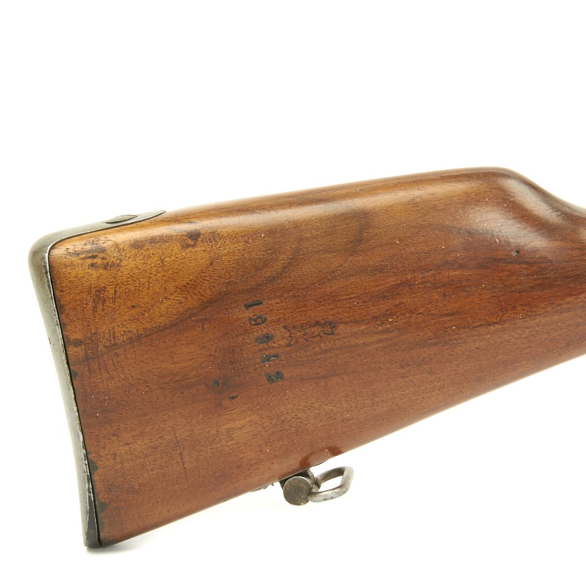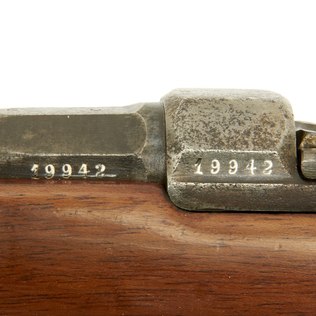 This particular M1869 "Aptiertes" Werder Rifle is really nice and appears to have all matching Serial Numbers of 19942, located on the barrel, receiver, stock, and action. It has the correct Mauser style rear sight and short barrel knoxform, indicating it was converted to take the M71 cartridge, but was not later re-barreled to the n.M specification. The rifle comes with it's original Chassepot/Gras type nose cap and ramrod. Interestingly we are told that there is a join in the fore stock under the middle band indicating that this rifle ended up as an Allied War Souvenir at the end of WW1 and was transported home in a kit bag. Clearly it saw little or no active service, as the bore is in excellent bright condition, with clear lands and grooves.