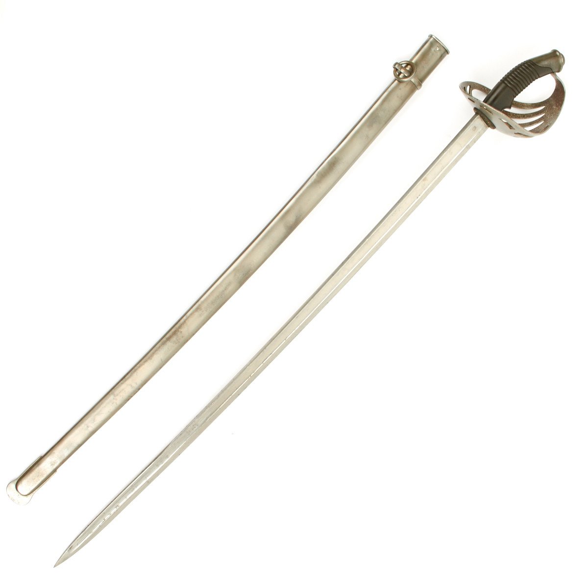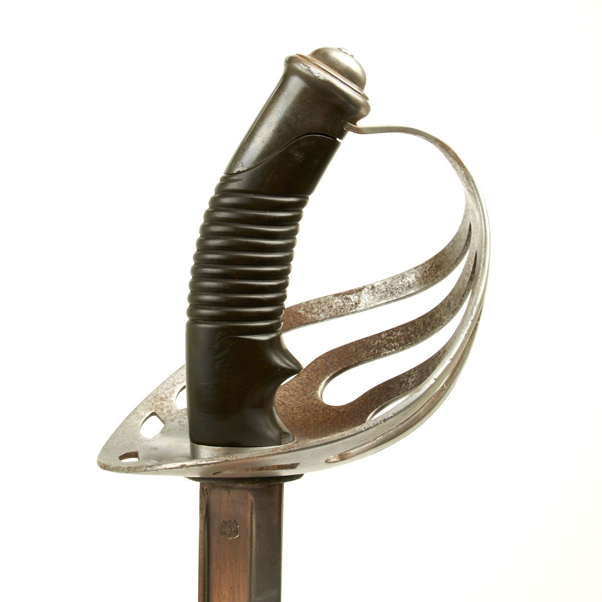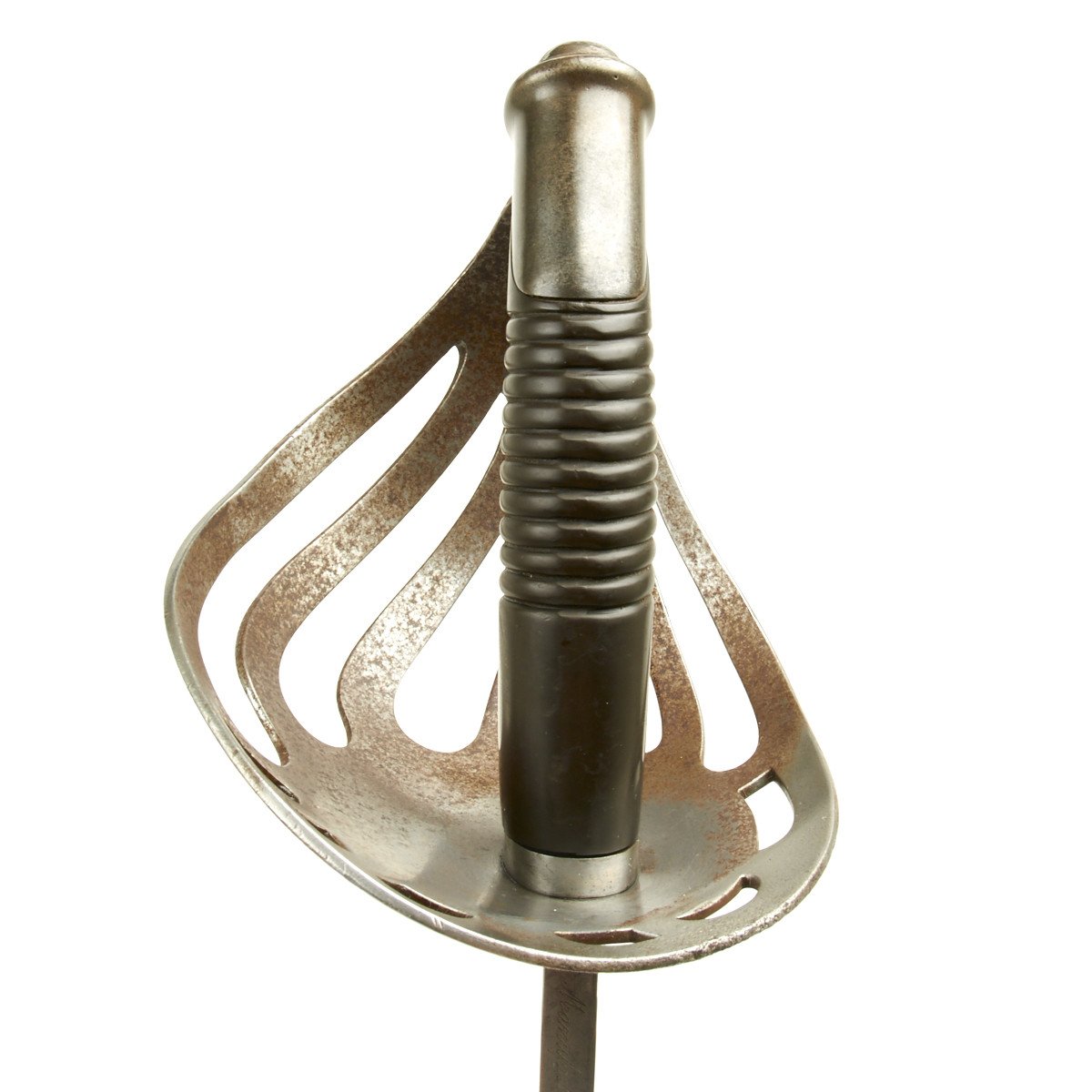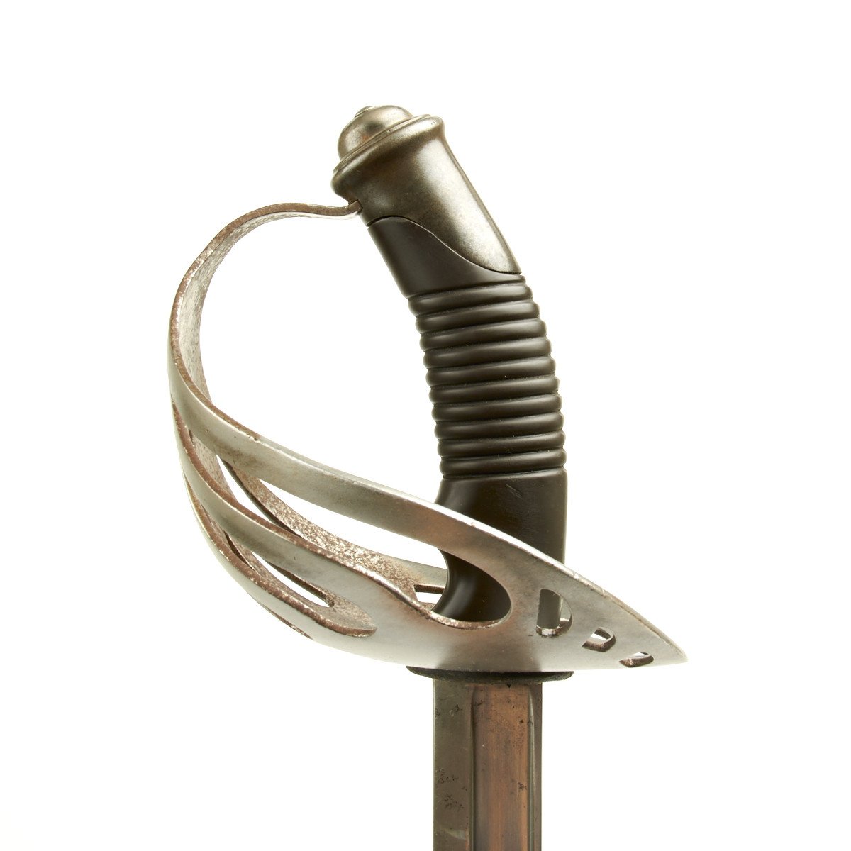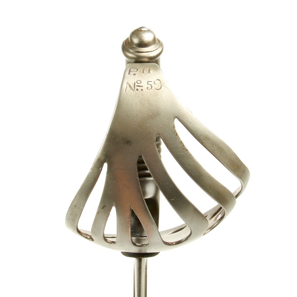 This is a most spindled looking sword with a huge slotted bowl steel hand guard. The grip is made of molded bakelite, very popular at the turn of the century.