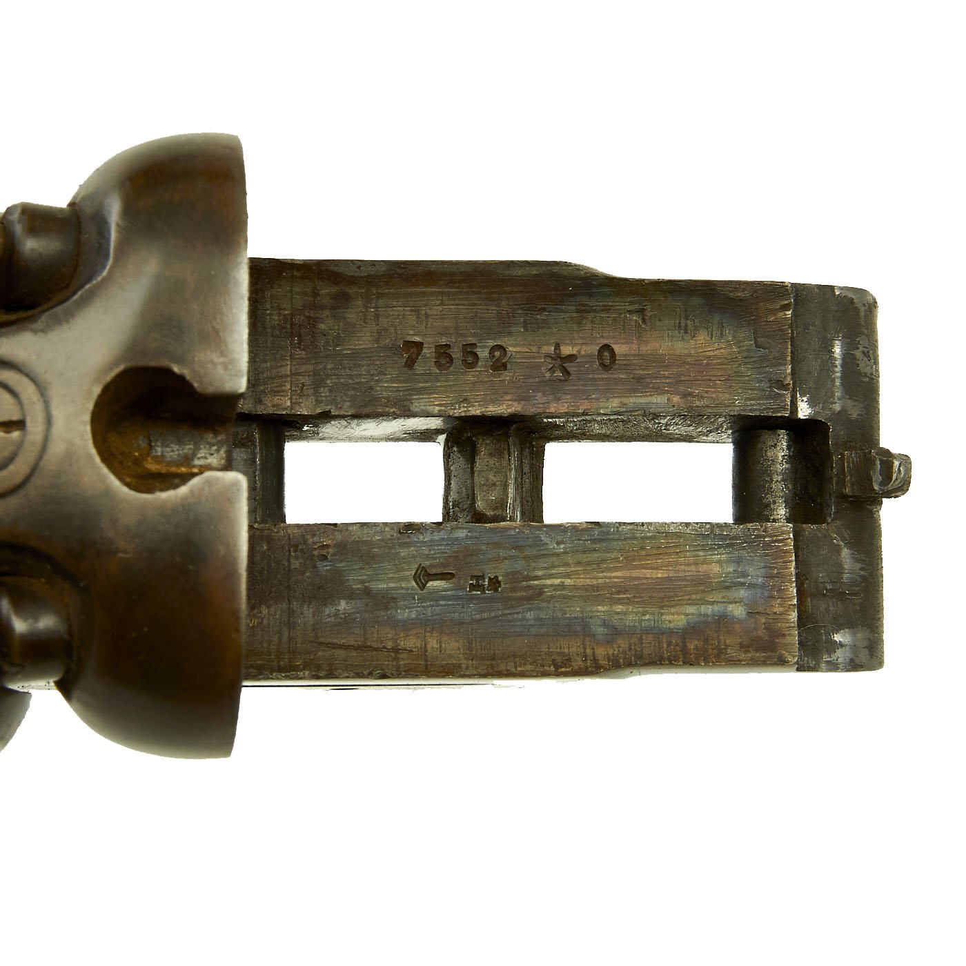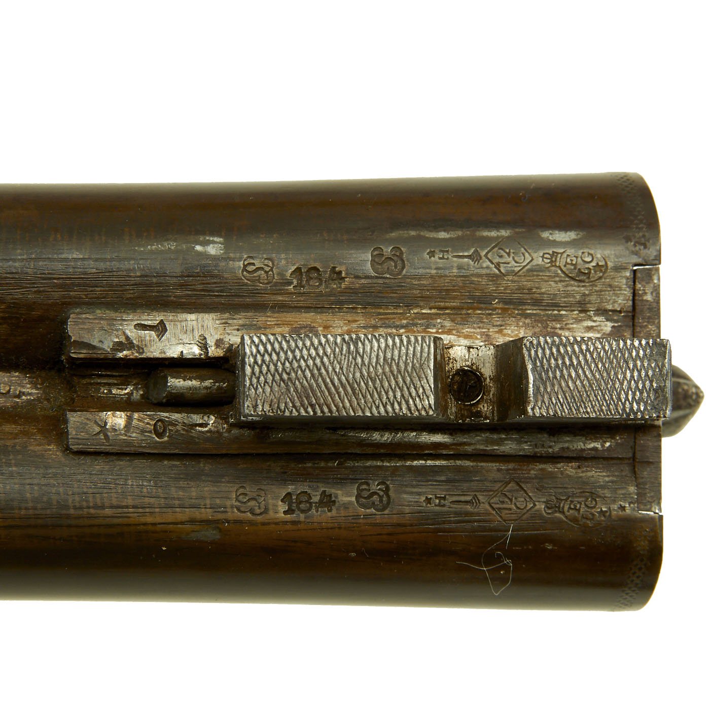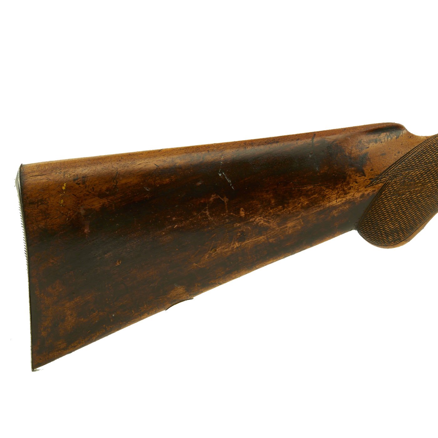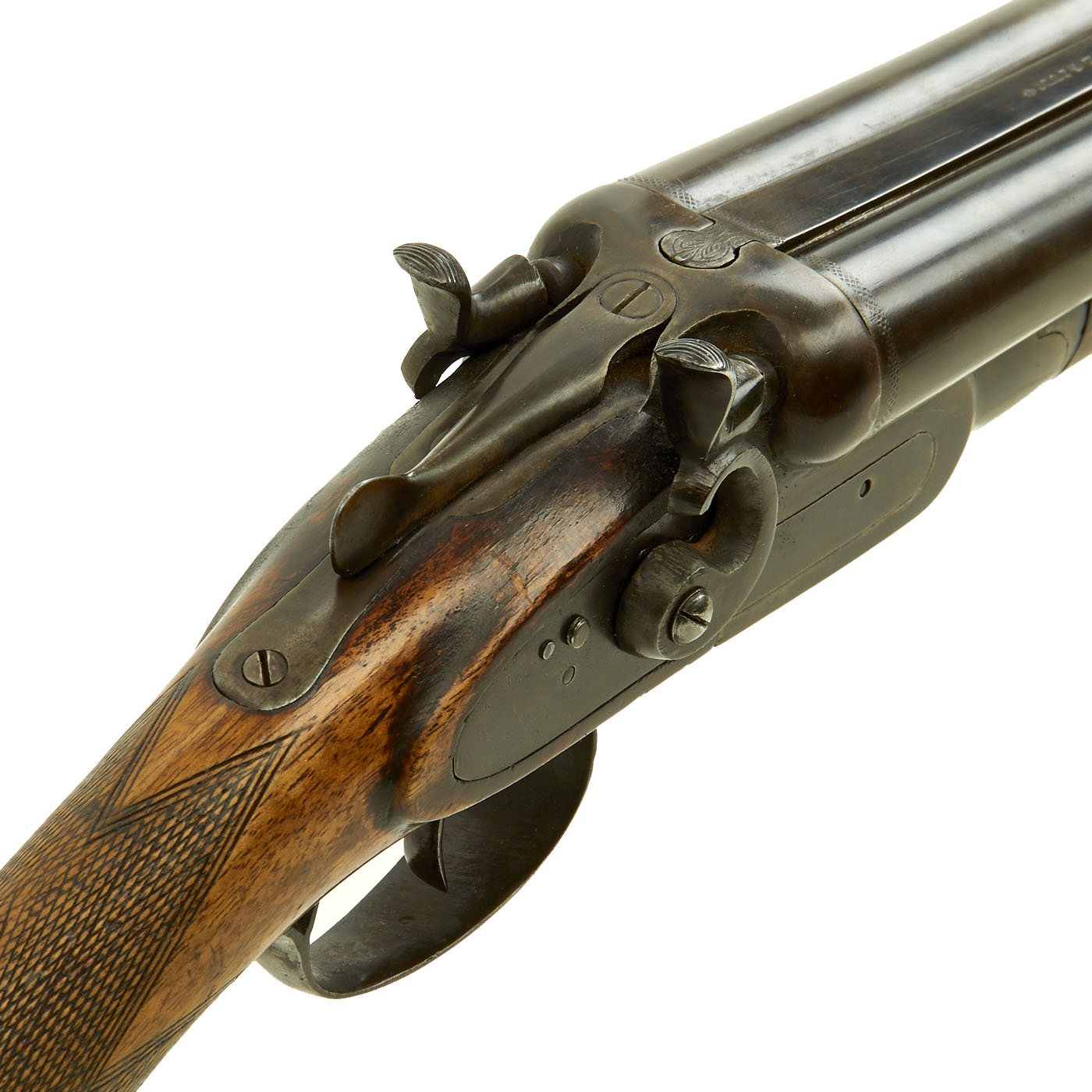 Removing the forestock allows the barrels to be removed from the receiver. This reveals the markings of both the "Tower of Liège" proof mark as well as E / L G / * in a "Crowned" oval, indicating manufacture and inspection in Liège, Belgium. The serial number 7552 is marked on all three parts of the shotgun. There are additional proofs and other markings giving further specifications on the barrels, such as gauge, choke, etc. Really a well marked gun in great display condition.