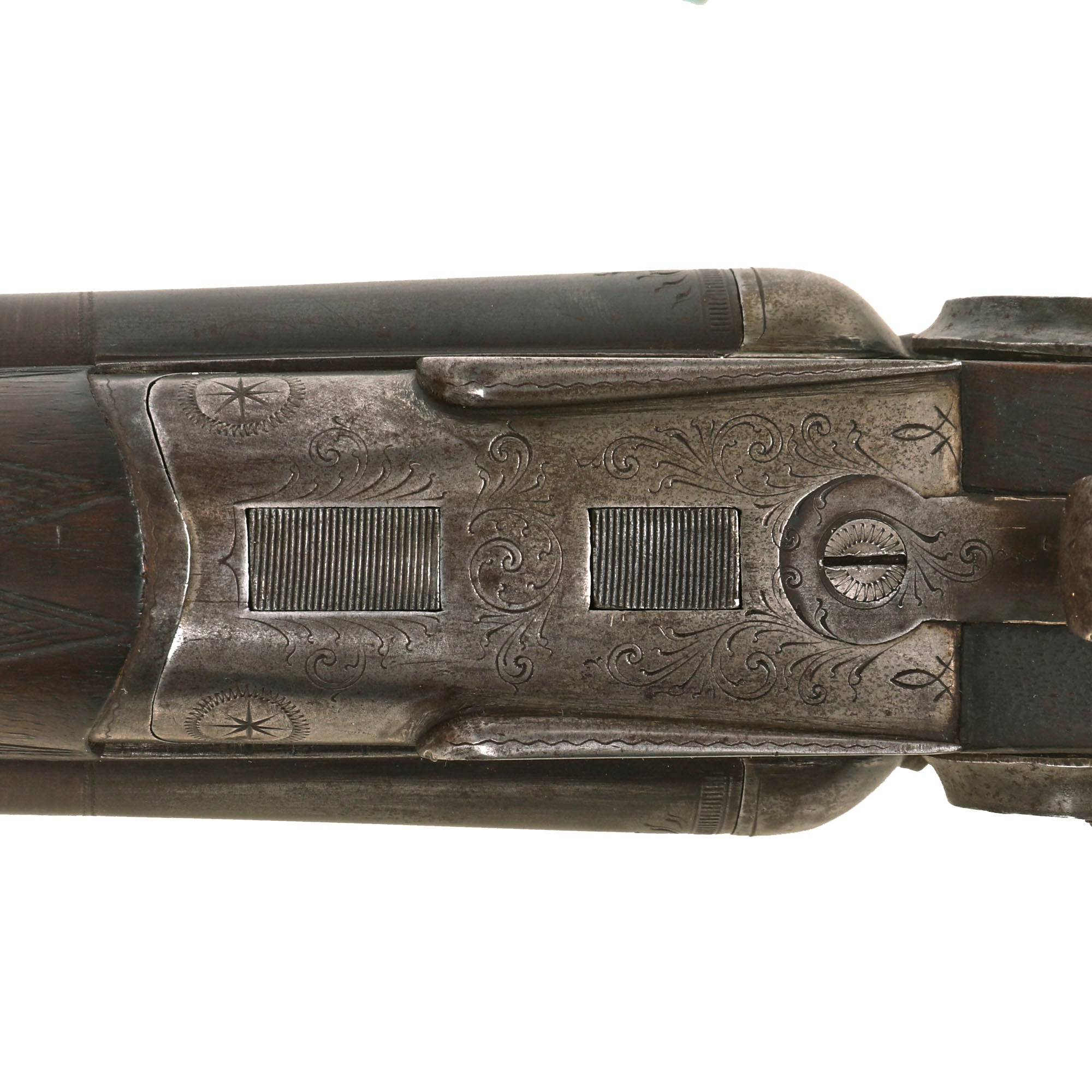 This DOUBLE BARREL 12 gauge Hammer Shotgun presents fantastically, showing a lovely patina of age, but still retaining much of the original beauty. Originally intended for hunting and home defense these saw a lot of use on the Frontier and were supplied to both Stage Coach Lines and Railroads. It features a lovely "pistol grip" rear stock and detachable fore stock, both of which have some lovely checkering in the grip area. The metalwork shows lovely line and floral engraving throughout, which is tastefully done giving a more sleek look.