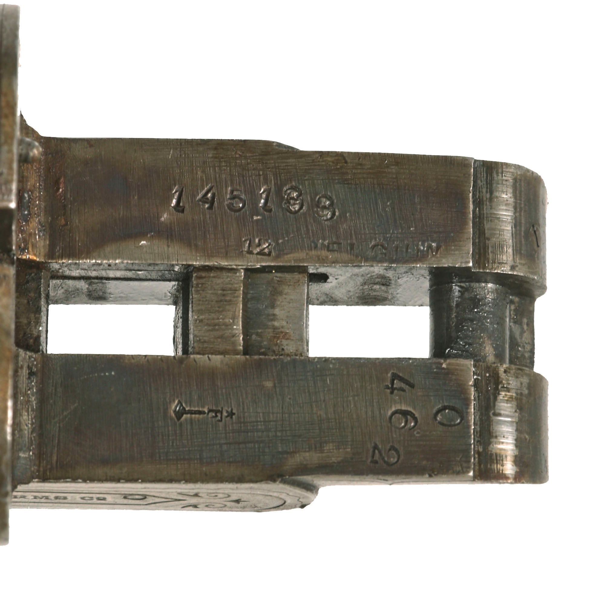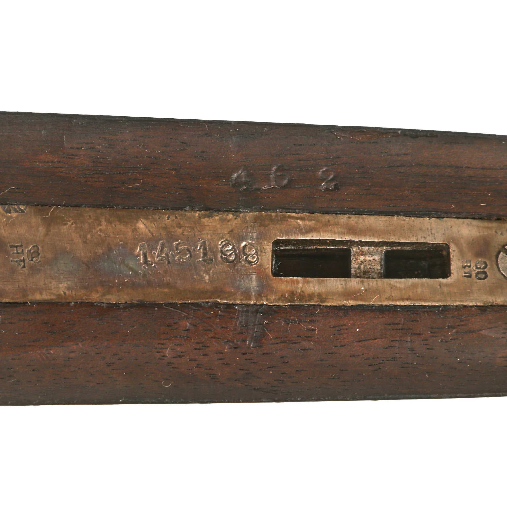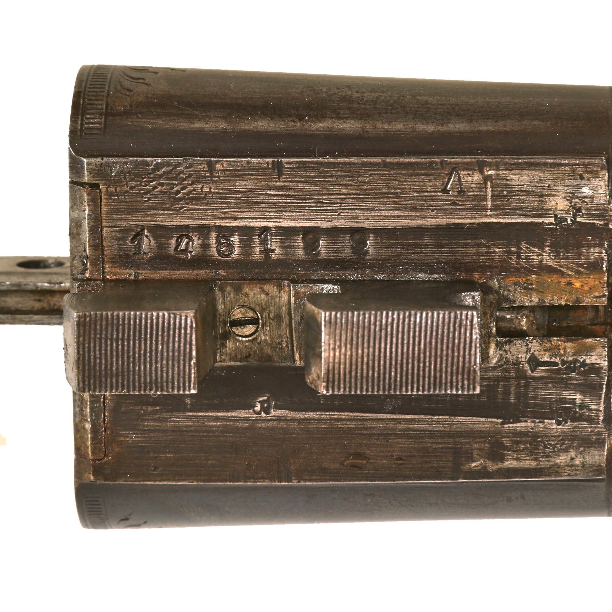 The shotgun is marked with "ALL MATCHING" serial number 145199 on the bottom of the barrel rib, the bottom of the chamber end of he barrel assembly, the top of the table, and on the attachment hardware of the fore stock. There are also additional number stamps on various components, most likely matching numbers for assembly.