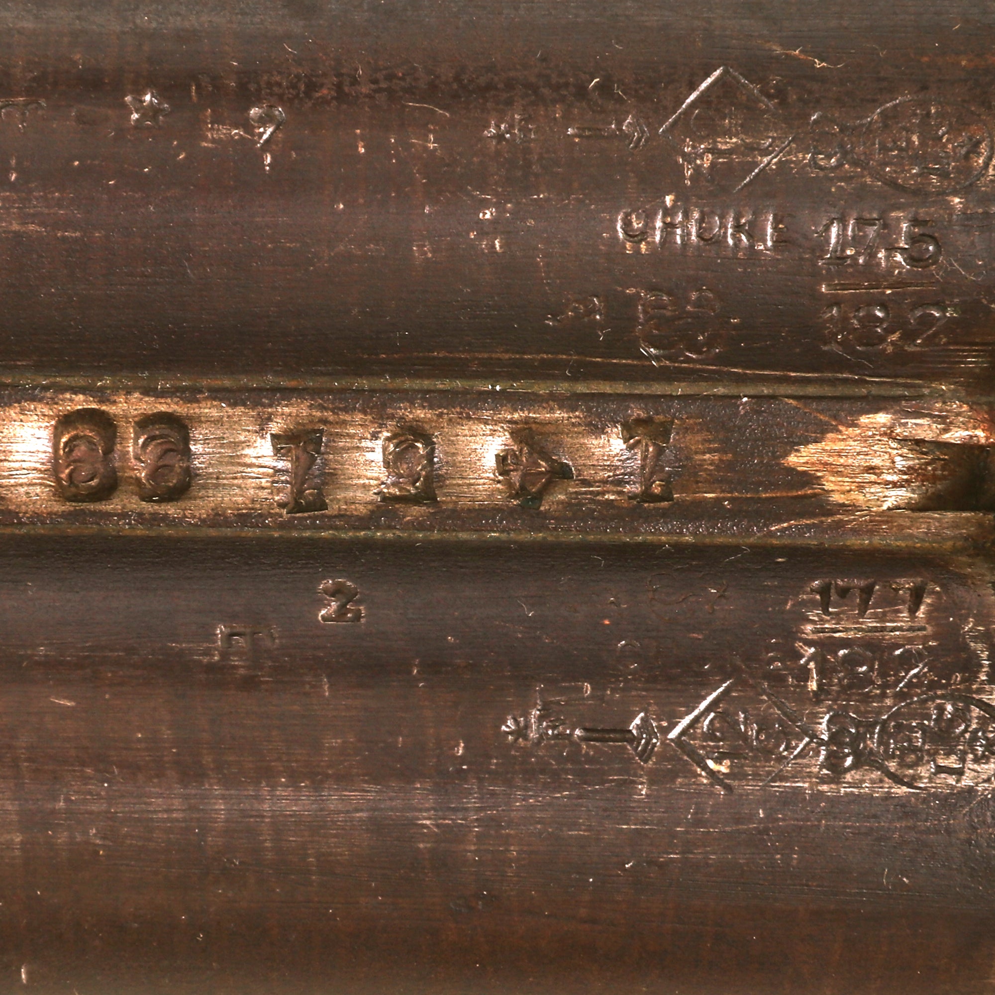 Removing the forestock allows the barrels to be removed from the receiver. This reveals the markings of both the E / L G / * in a "Crowned" oval on the end of both barrels, indicating manufacture and inspection in Liège, Belgium after 1891. This proof had been introduced for exported arms to comply with new proof laws in Germany. There are also various single letter inspector proofs, as well as the "Perron" or Tower of Liège proof. Both barrels are marked with 12 / C in a diamond, indicating the 12 gauge chambering, and there is also CHOKE 17.5 / 18.2 on the left barrel and CHOKE 17.7 / 18.2, indicating that the barrels are "choked" with a narrow area in the bore, which helped with the spread of the shot. This was a very modern design at the time, and also meant that the gun should never be shot with ball ammunition, which would blow it apart. The "water table" of the shotgun breech area is also marked with the "Perron" or Tower of Liège on the right side, and has some additional proof marks as well.