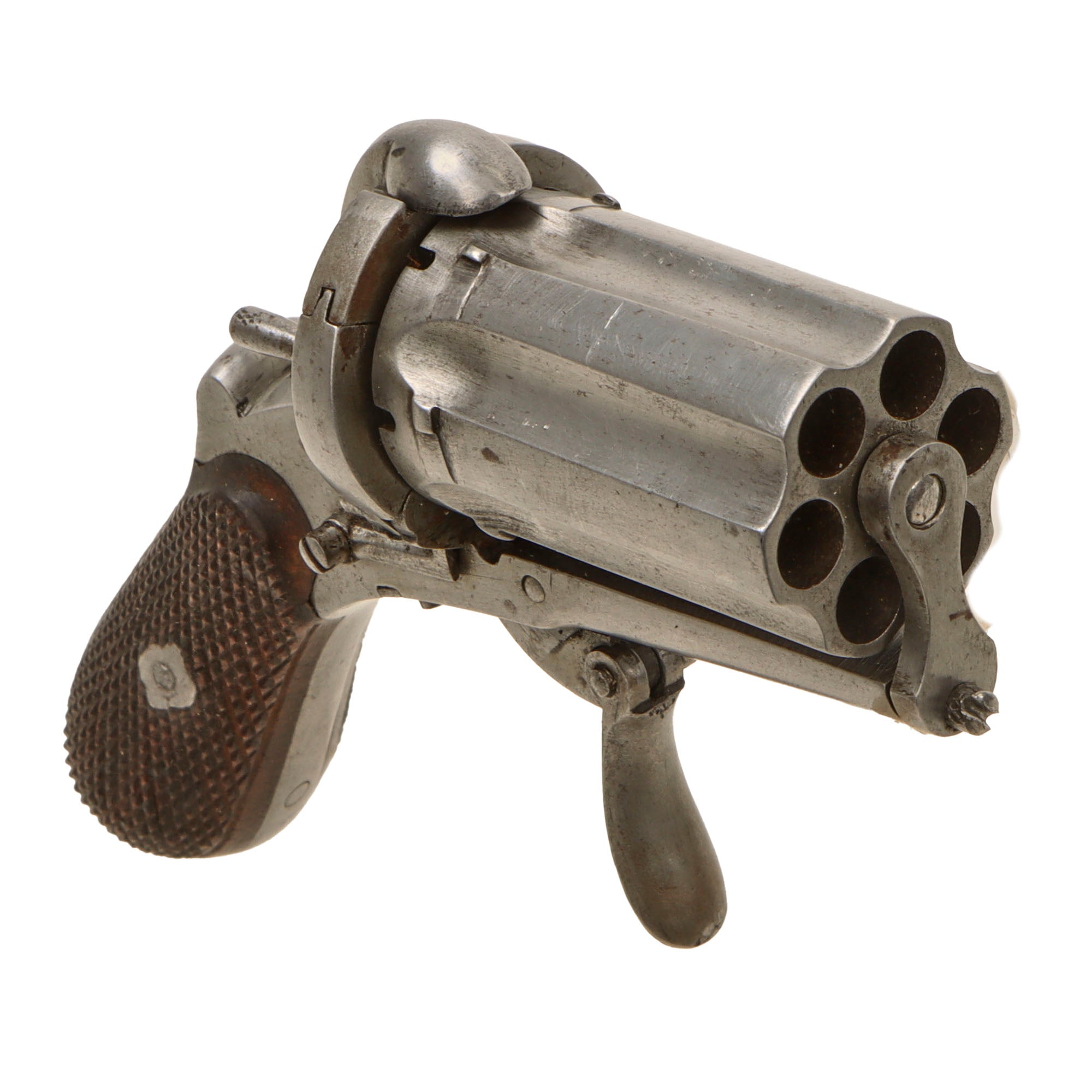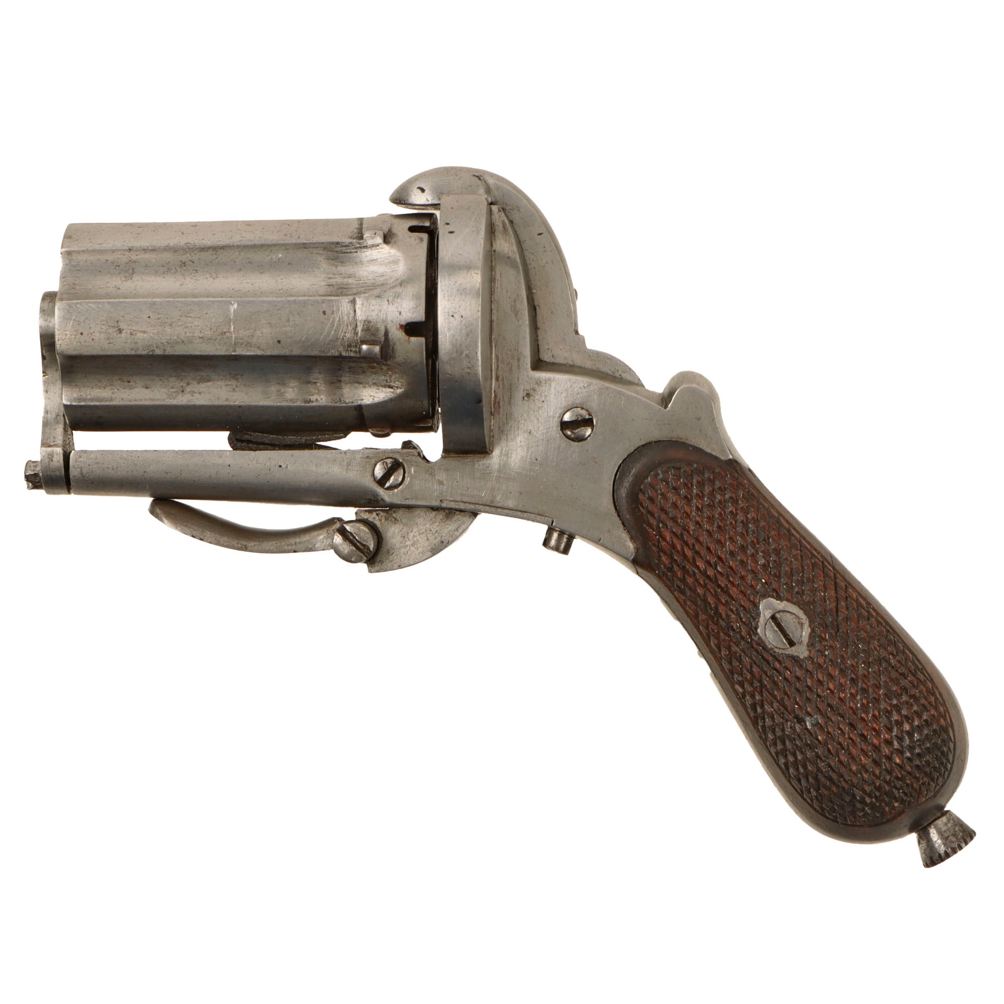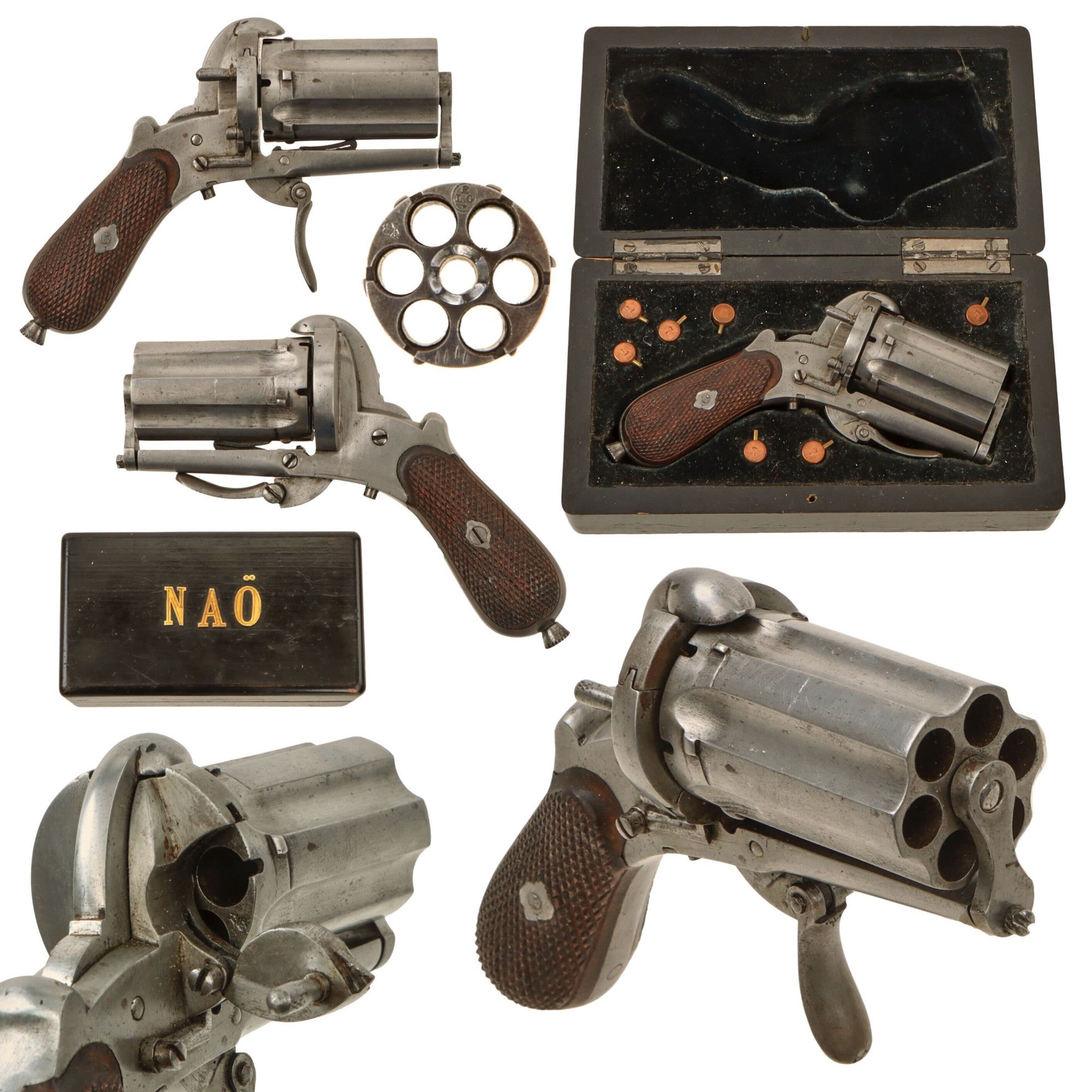 Original item. Only One Available. This is a very nice Belgian Pinfire Pocket Pepperbox revolver in the relatively small 7mm pinfire cartridge, complete in its original case with some inert cartridges. It is made very much in the French style, and many French makers had these made under contract in the gun-making city of Liège, Belgium. Made around 1850, revolvers such as these were principally supplied to the Parisian Market from where many were shipped to the United States before the Civil War. Intended for personal protection the revolver has a folding trigger for easy concealment. Some were well decorated on the exterior, however this one is plain, intended more for utility than for show.