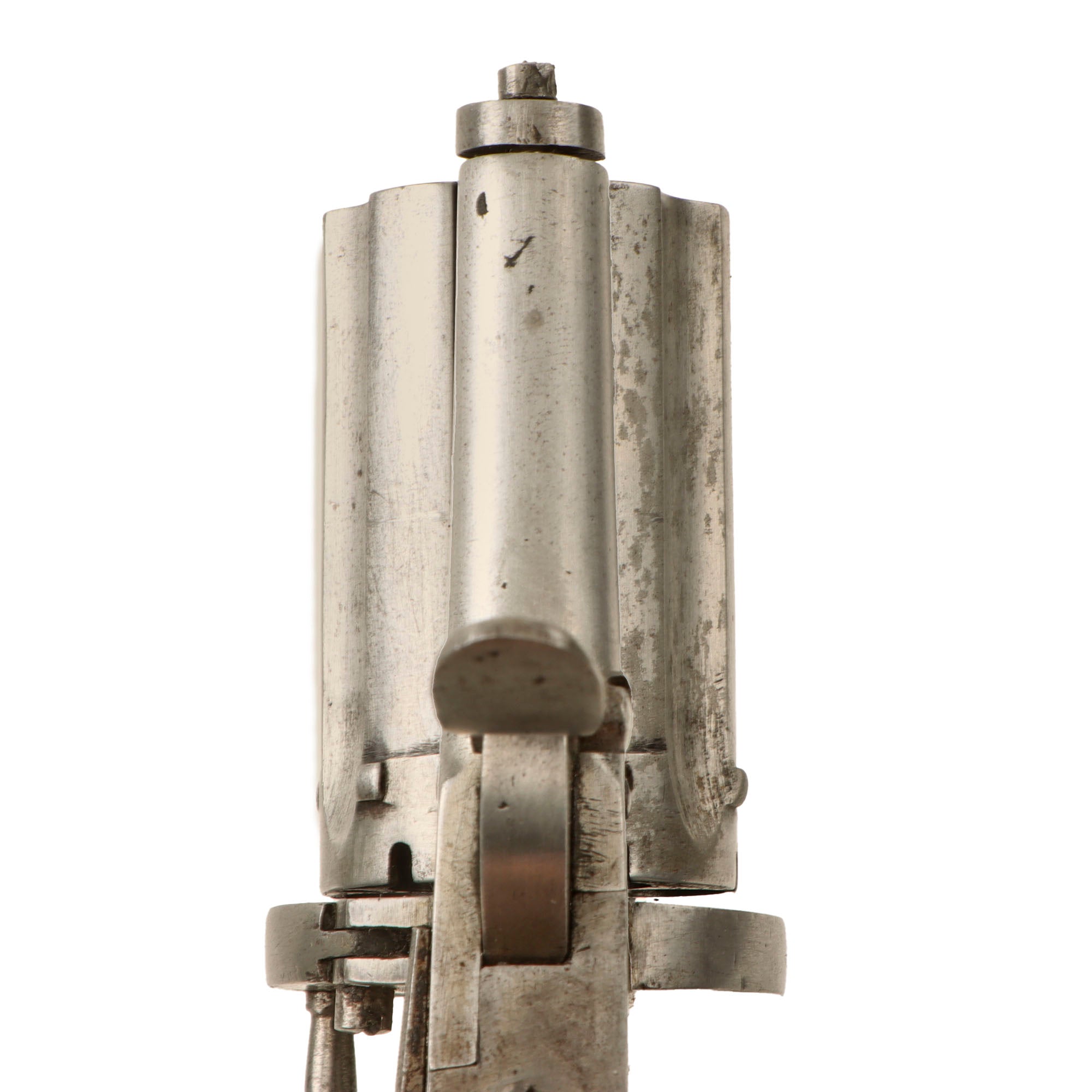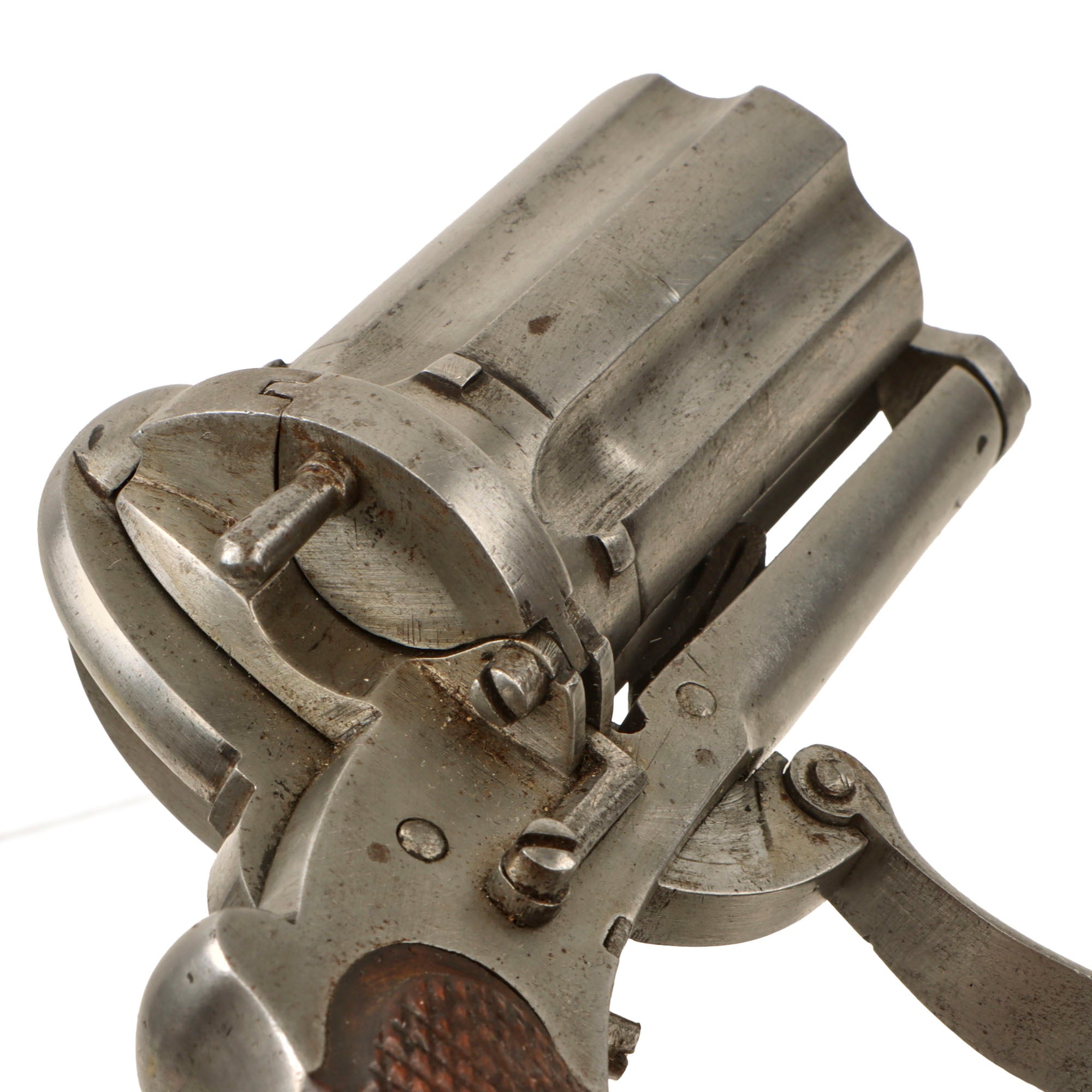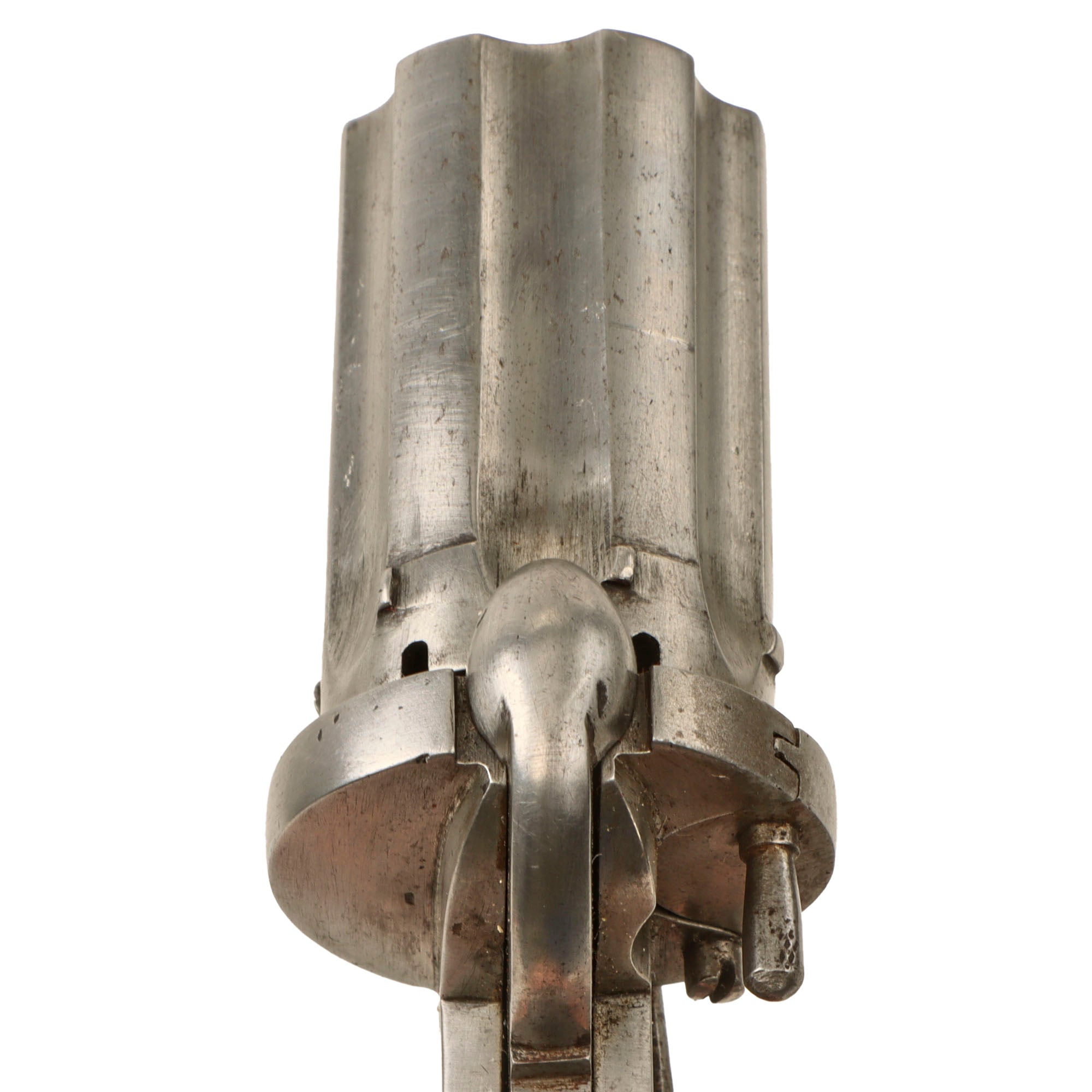 Original item. Only One Available. This is a very nice Belgian Pinfire Pocket Pepperbox revolver in the relatively small 7mm pinfire cartridge, complete in its original case with some inert cartridges. It is made very much in the French style, and many French makers had these made under contract in the gun-making city of Liège, Belgium. Made around 1850, revolvers such as these were principally supplied to the Parisian Market from where many were shipped to the United States before the Civil War. Intended for personal protection the revolver has a folding trigger for easy concealment. Some were well decorated on the exterior, however this one is plain, intended more for utility than for show.