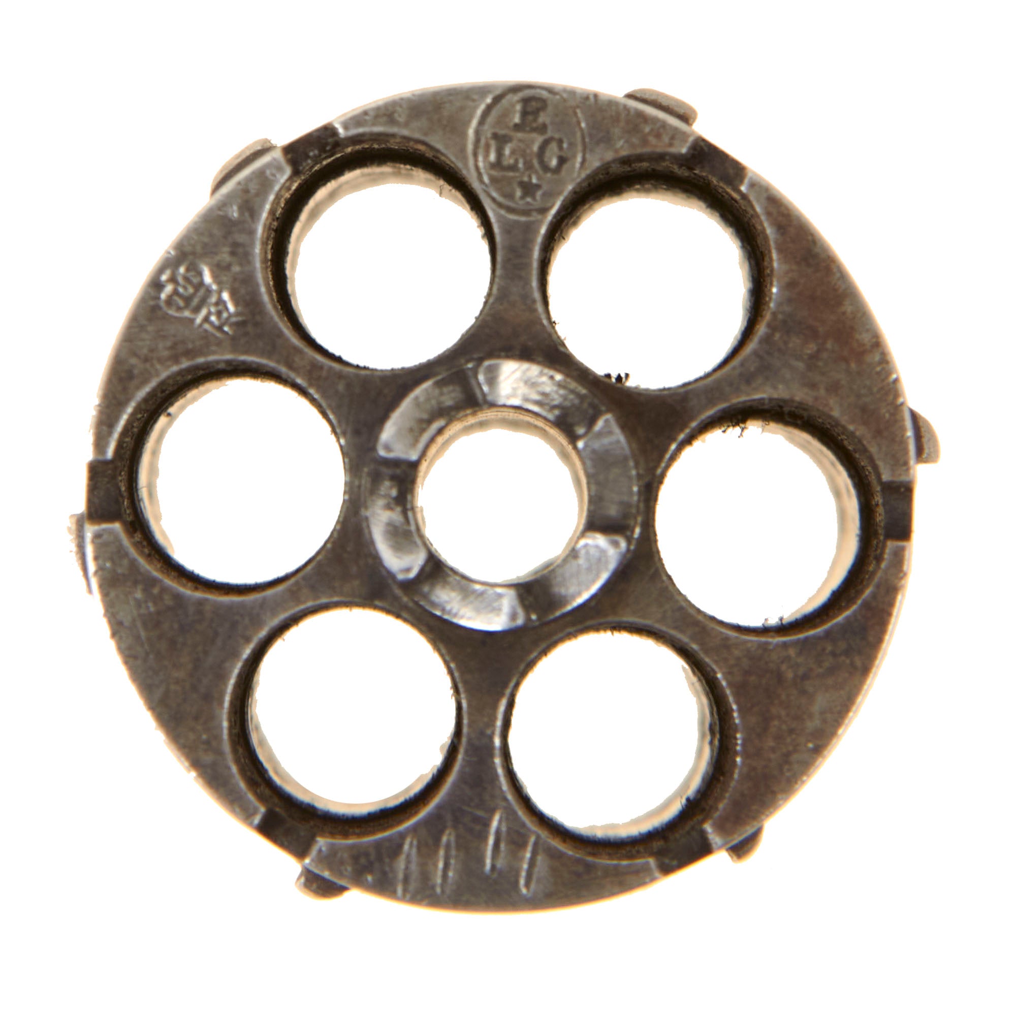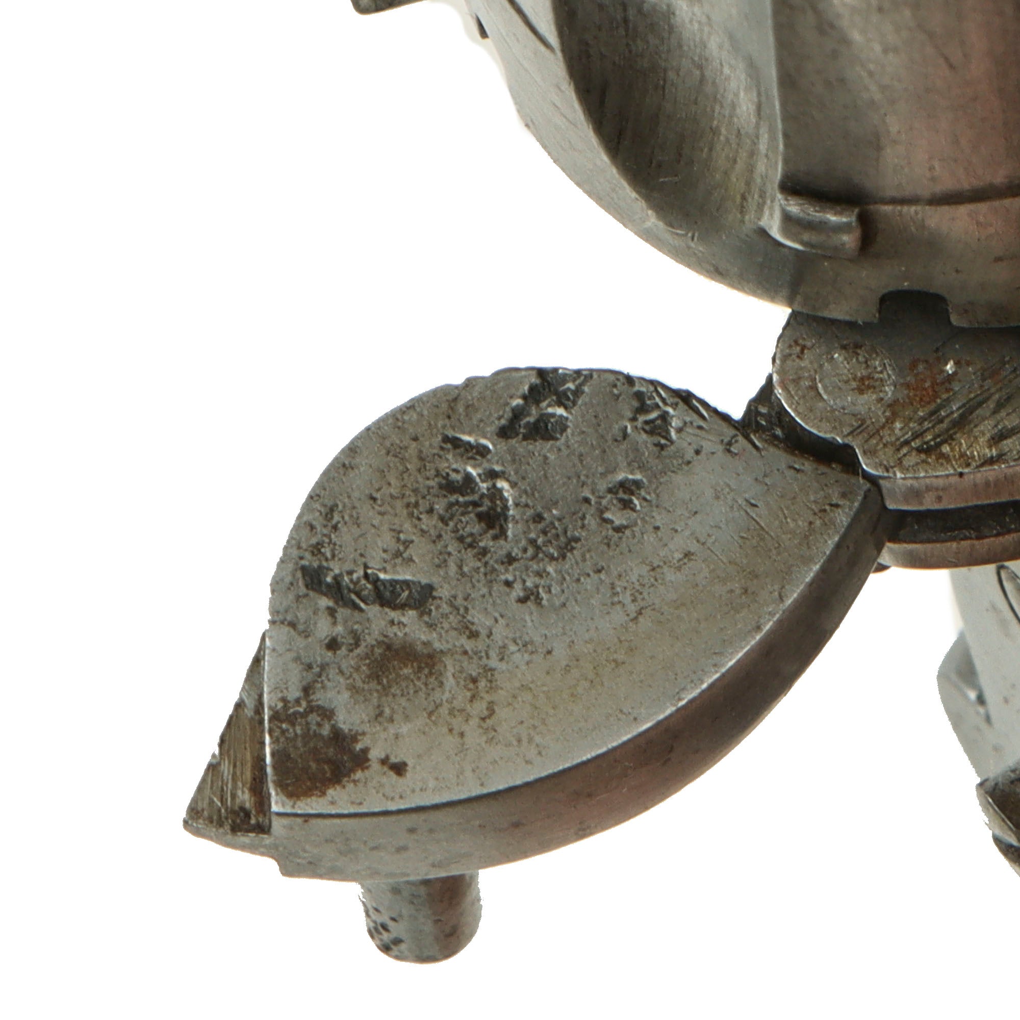 This pepperbox, like most, functions in double action only, with good indexing and a crisp dry fire. The trigger return spring is however a bit weak, so it needs to be moved forward manually for the action to reset. We checked the bores, and they are smooth bore, showing light wear and oxidation. This was a revolver that definitely did see use during its lifetime.