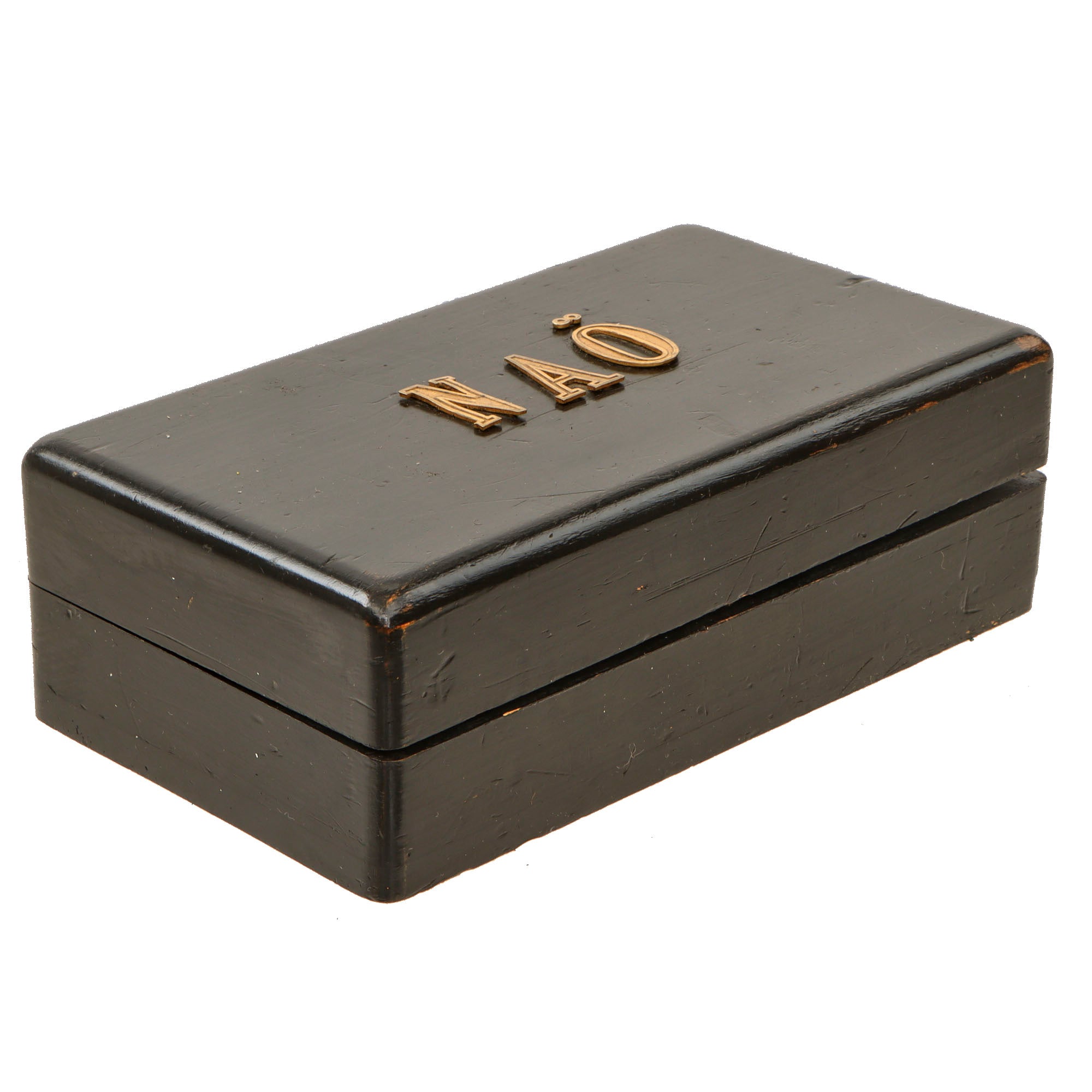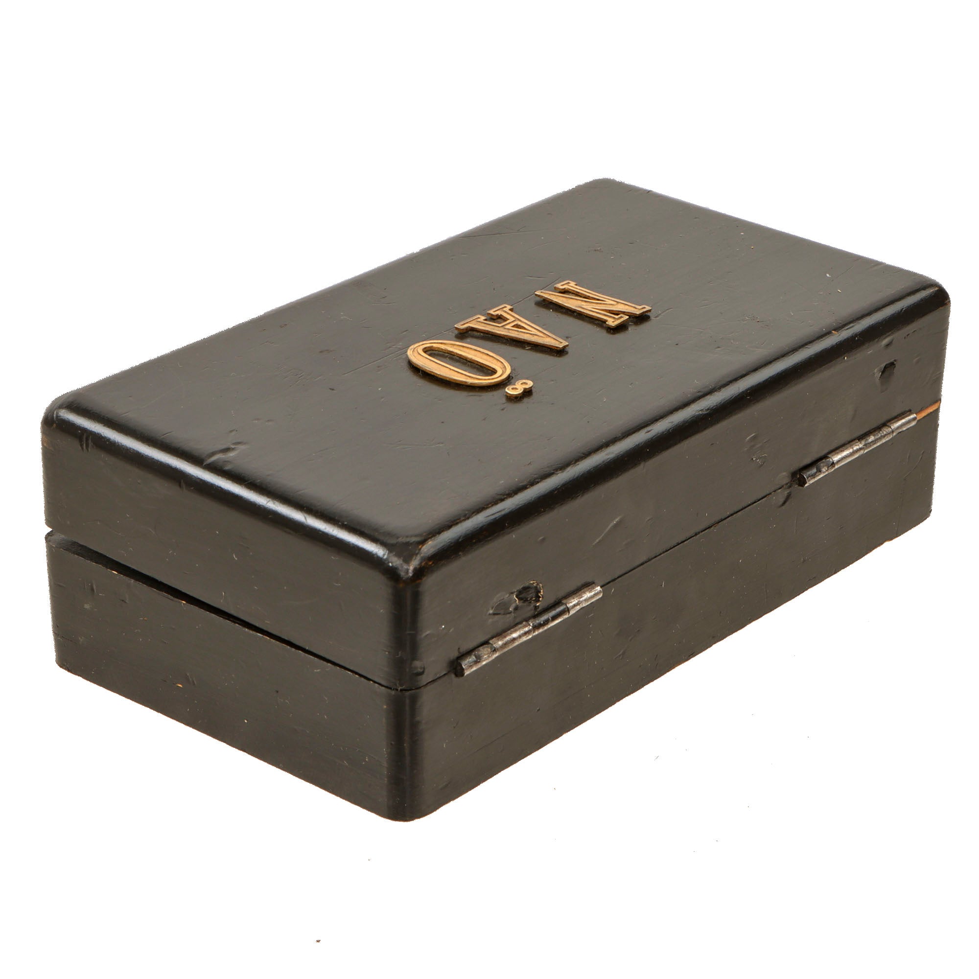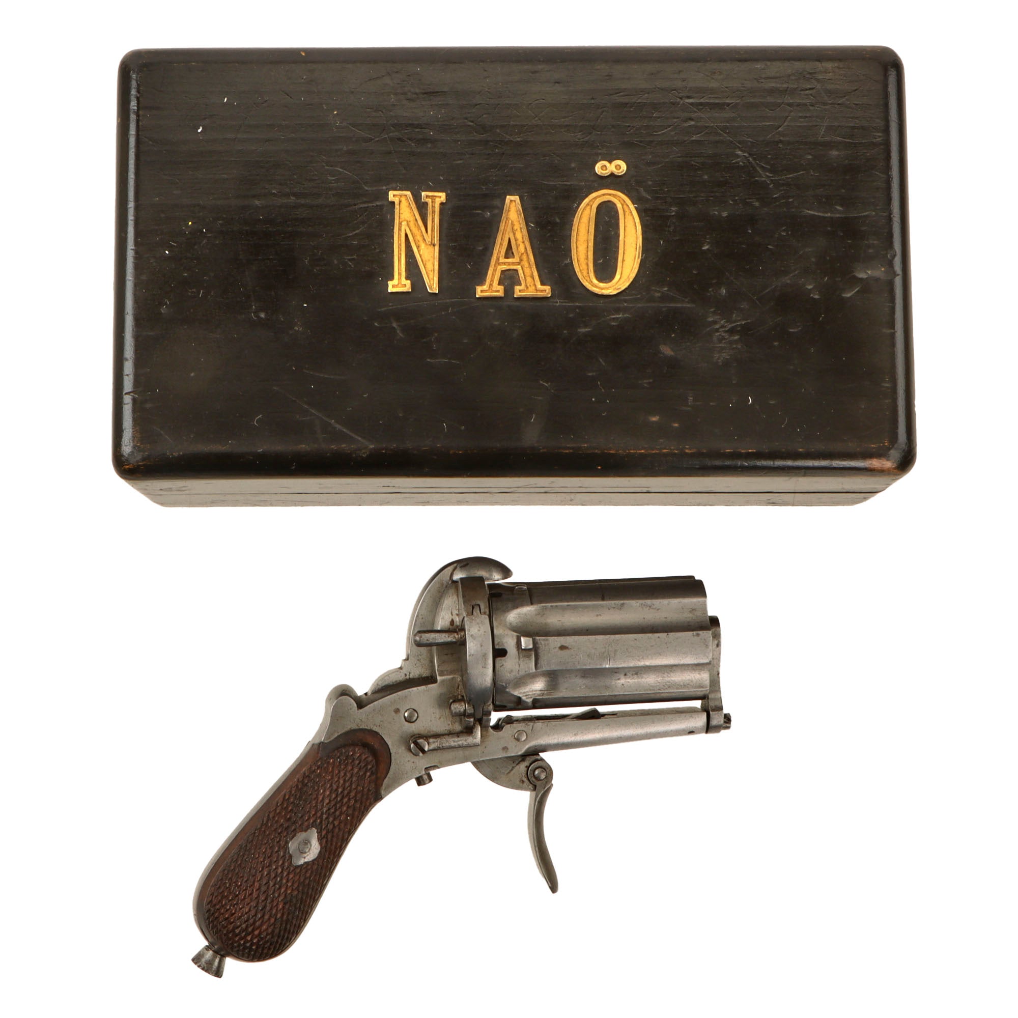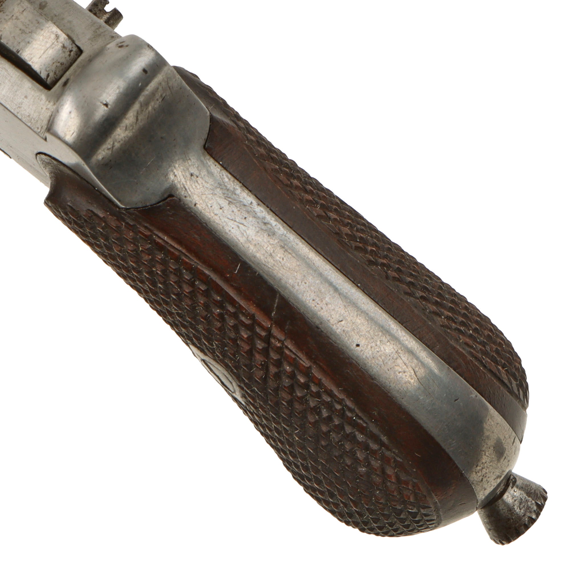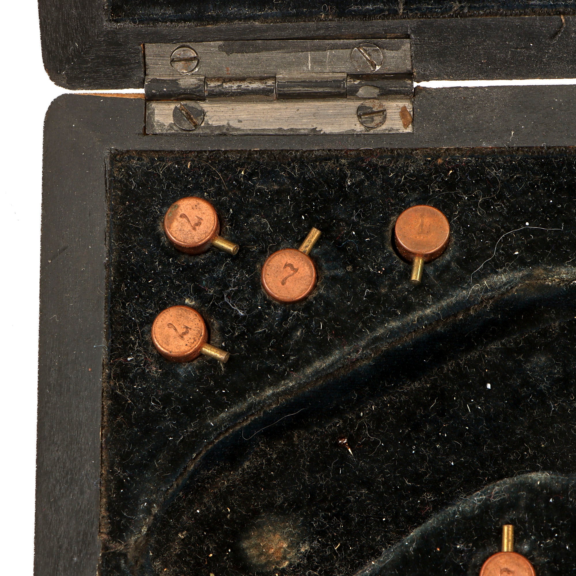 The pistol was made in the Belgian Gunmaking city of Liège, where many operations were making guns under contract to French makers. The rear of the cylinder / barrel is marked with the E / L G / * in an oval marking proof from Liège, along with a CROWN / K proof and some other markings. The front has an additional CROWN / S marking, and we did not see any other markings present on the revolver. It comes in a lovely wooden case measuring approximately 6 1/2"W x 3 5/8"D x 2", which has the initials N A Ö on the top. The inside is lined in black velvet plush material, and also is inlet for the included seven inert pinfire cartridges. These are all marked 7 on the bottom, indicating the size.