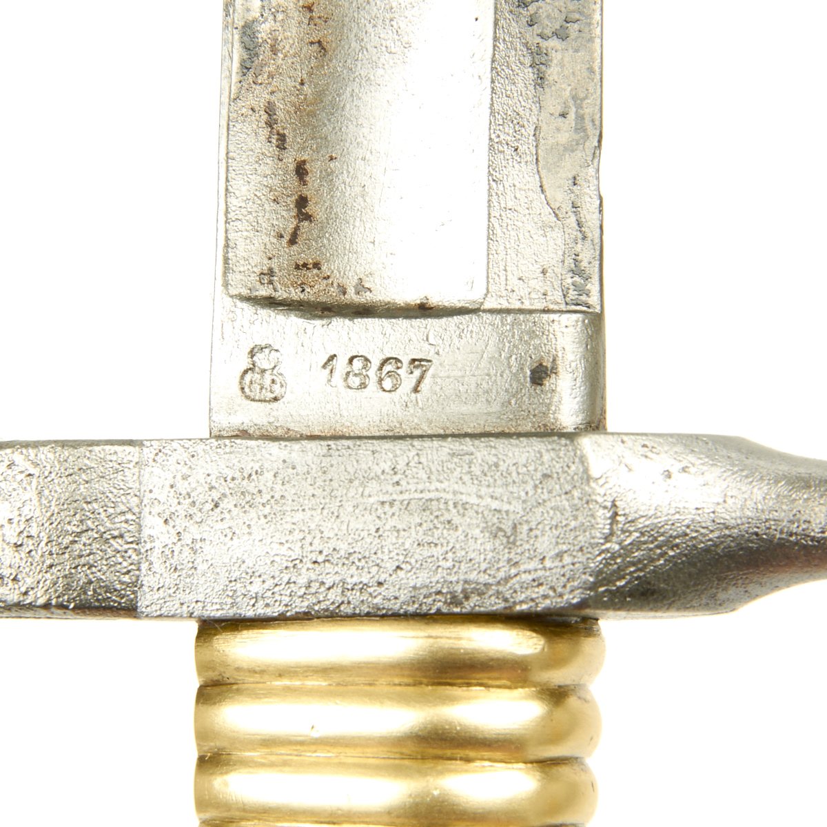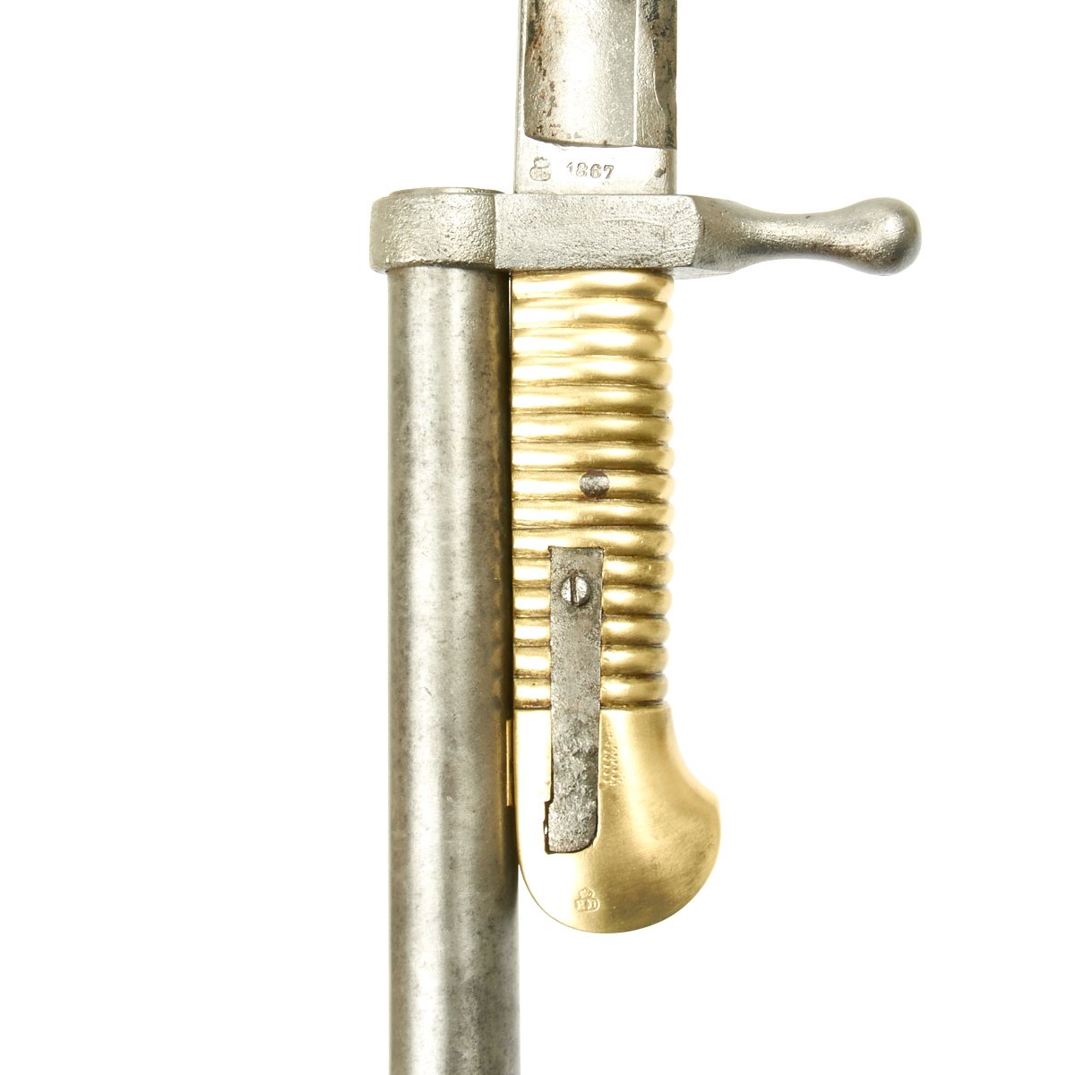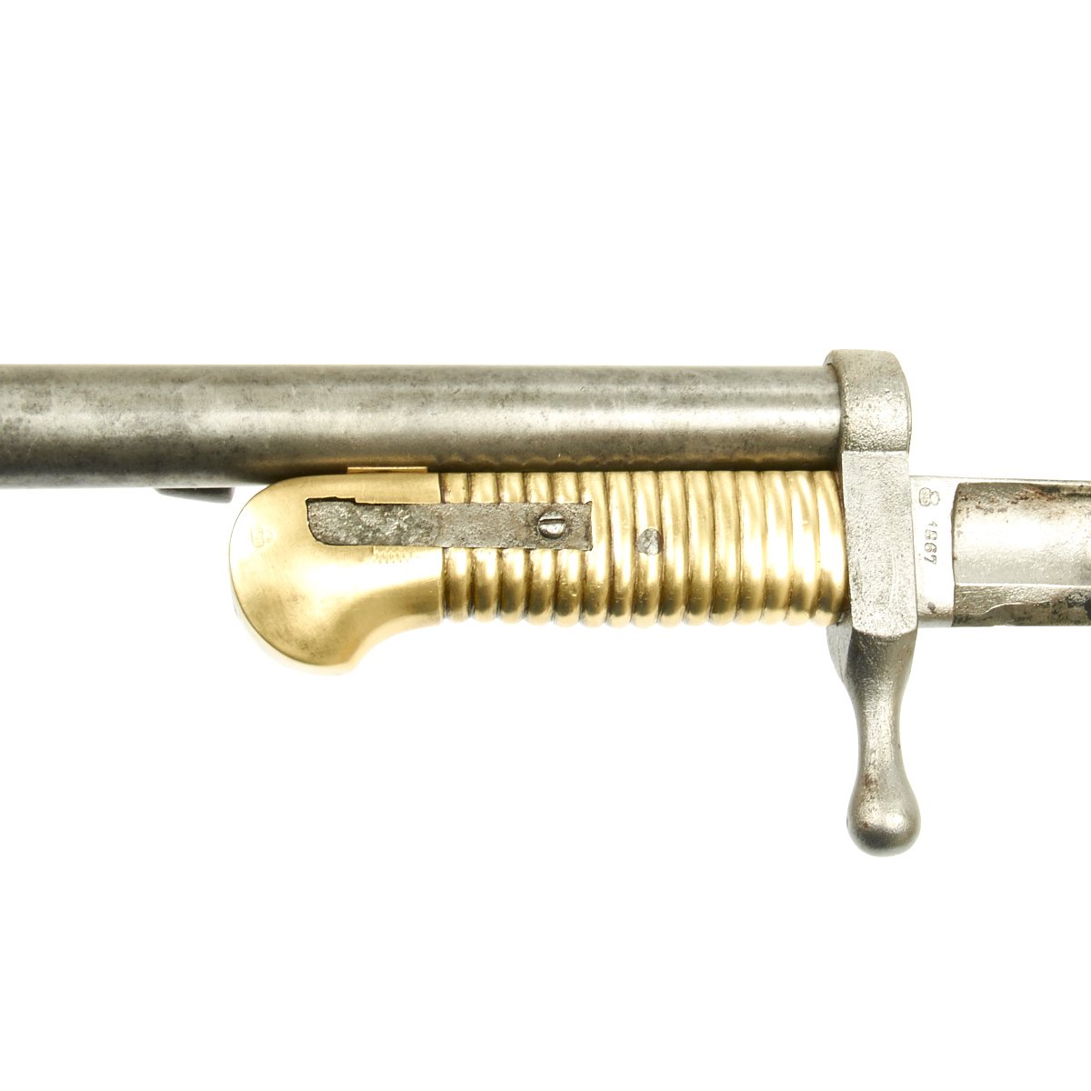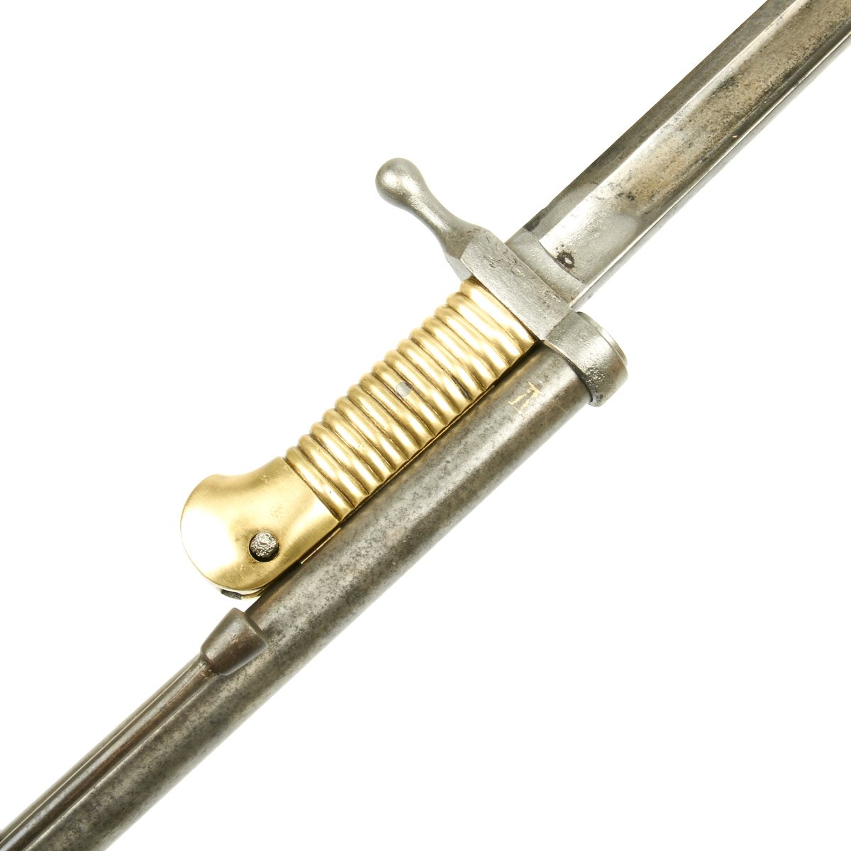 These Short Muskets were intended for Artillery units, which preferred shorter muskets as they tended to be of less interference when manning a Cannon. However this really put Artillerymen at a great disadvantage with the loss of reach when combating Enemy Cavalry hand to hand. As a result "long" bayonets were introduced to extend the soldier's reach. The "Sword Bayonets" were virtual full sidearms in themselves and in this instance measured 32" overall with extending blade of 27". Complete with steel cross guard and ribbed brass hilt. A most impressive bayonet and very rare to find at all. Our example is proof marked and DATED 1867 just before Belgium and the rest of Europe moved over to Breach Loaders.