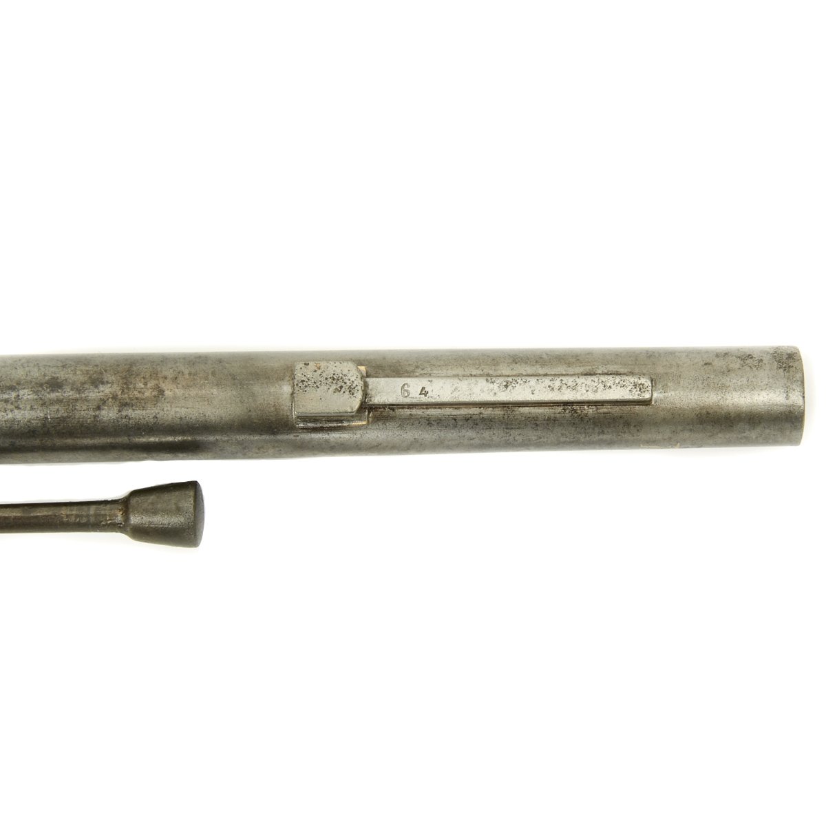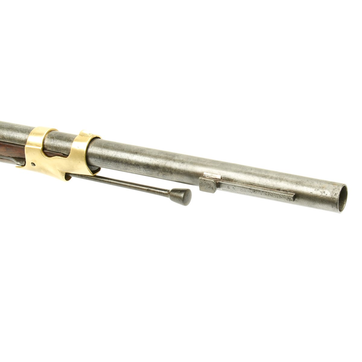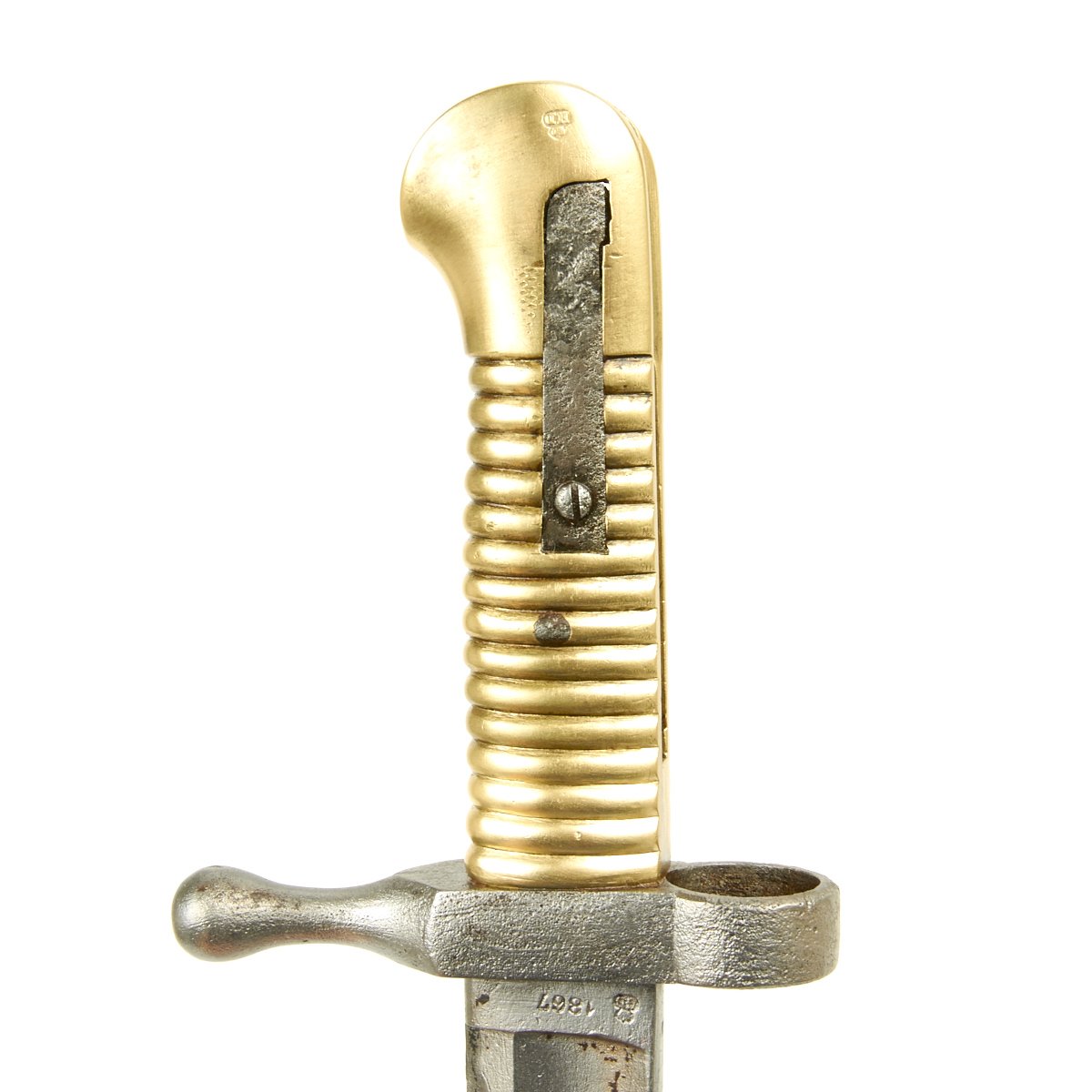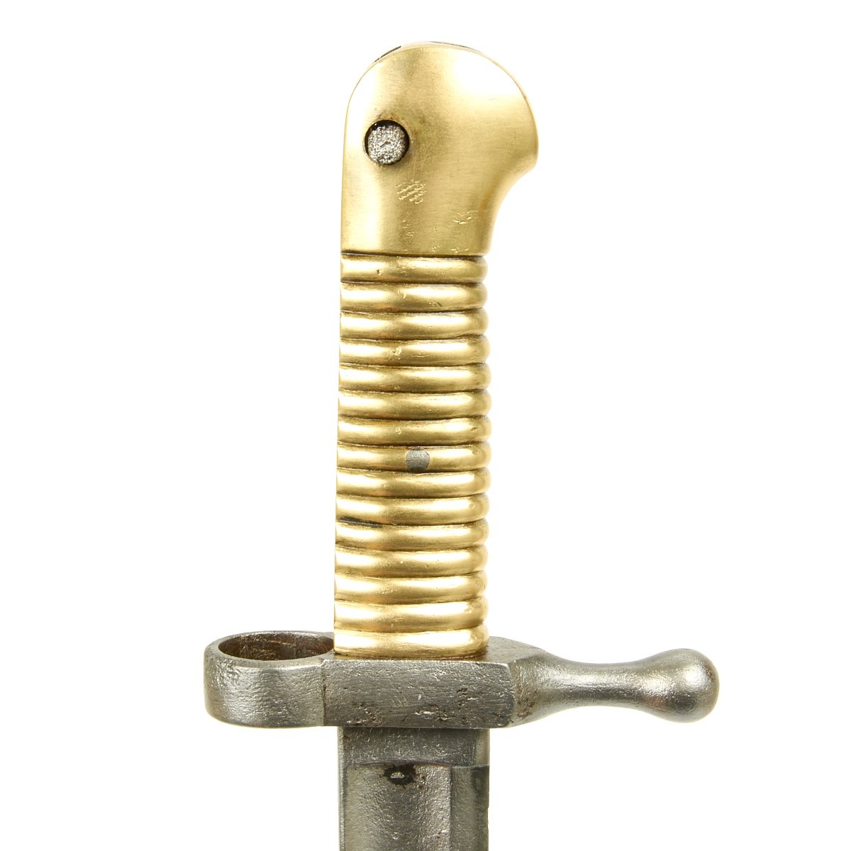 These Short Muskets were intended for Artillery units, which preferred shorter muskets as they tended to be of less interference when manning a Cannon. However this really put Artillerymen at a great disadvantage with the loss of reach when combating Enemy Cavalry hand to hand. As a result "long" bayonets were introduced to extend the soldier's reach. The "Sword Bayonets" were virtual full sidearms in themselves and in this instance measured 32" overall with extending blade of 27". Complete with steel cross guard and ribbed brass hilt. A most impressive bayonet and very rare to find at all. Our example is proof marked and DATED 1867 just before Belgium and the rest of Europe moved over to Breach Loaders.