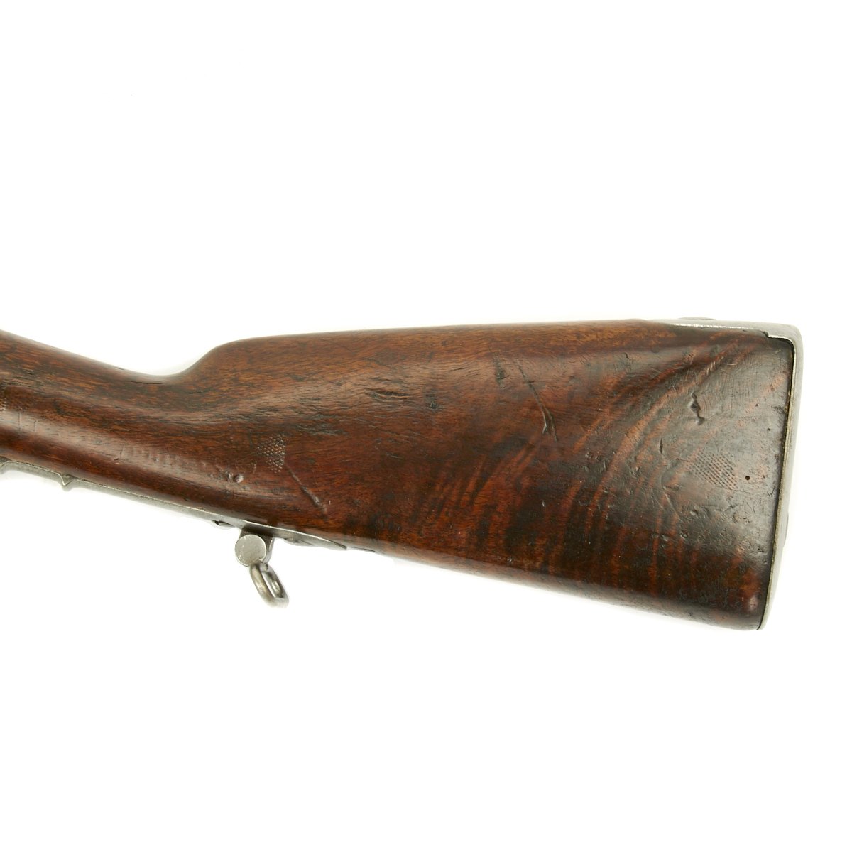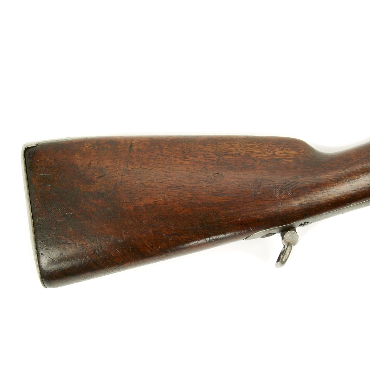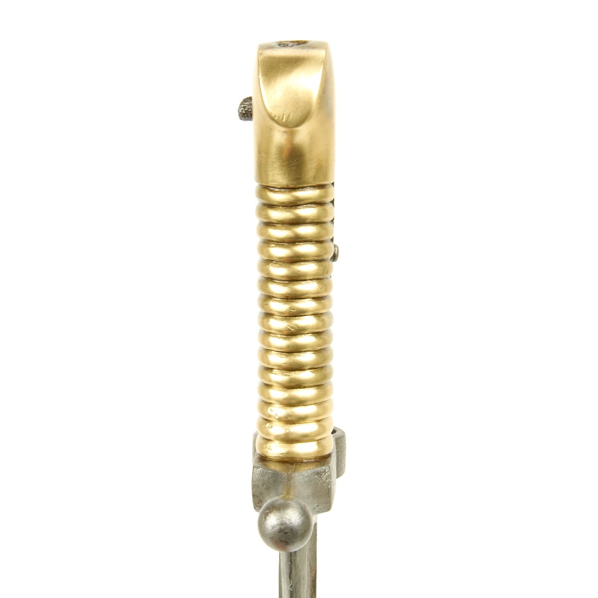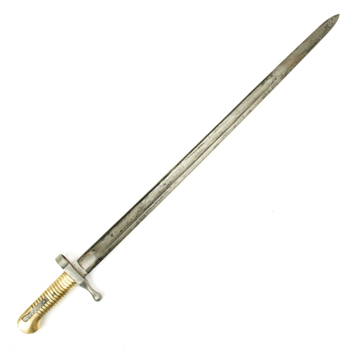 These Short Muskets were intended for Artillery units, which preferred shorter muskets as they tended to be of less interference when manning a Cannon. However this really put Artillerymen at a great disadvantage with the loss of reach when combating Enemy Cavalry hand to hand. As a result "long" bayonets were introduced to extend the soldier's reach. The "Sword Bayonets" were virtual full sidearms in themselves and in this instance measured 32" overall with extending blade of 27". Complete with steel cross guard and ribbed brass hilt. A most impressive bayonet and very rare to find at all. Our example is proof marked and DATED 1867 just before Belgium and the rest of Europe moved over to Breach Loaders.