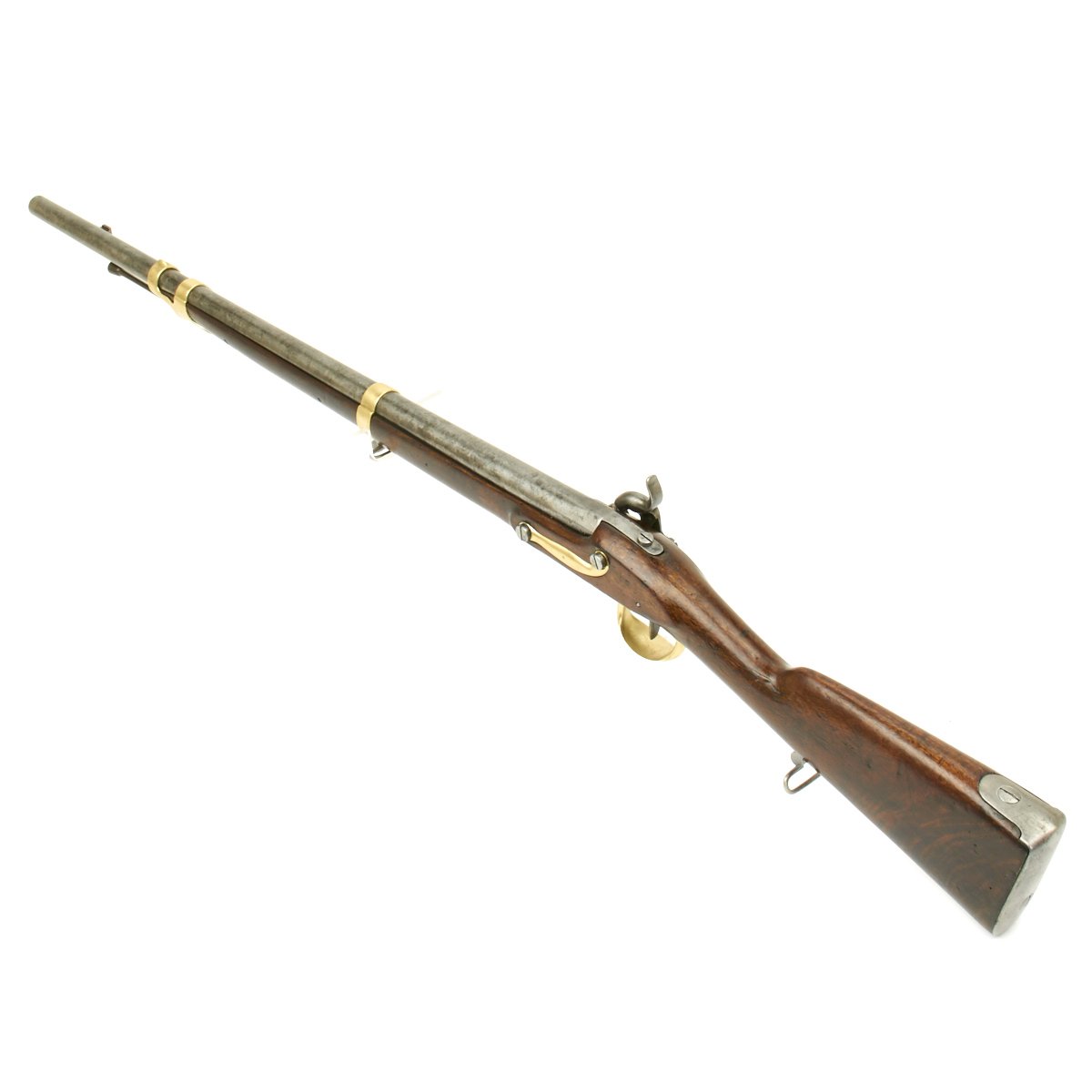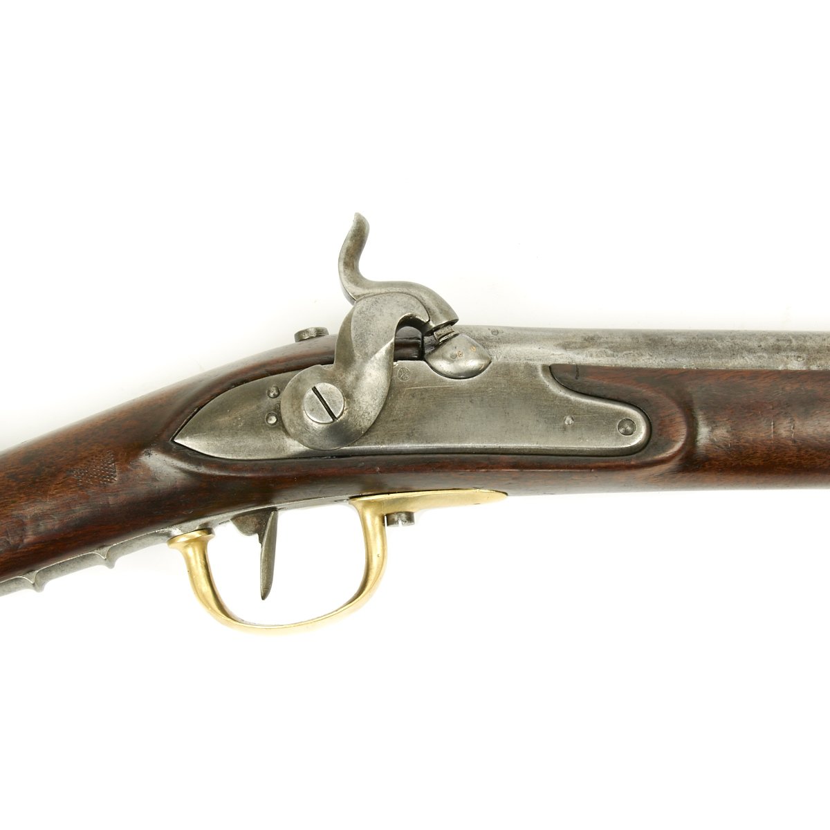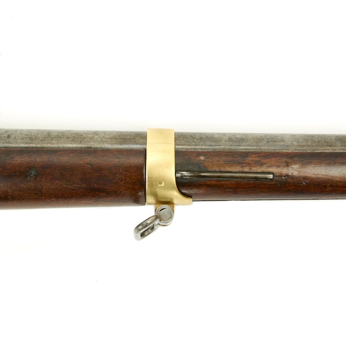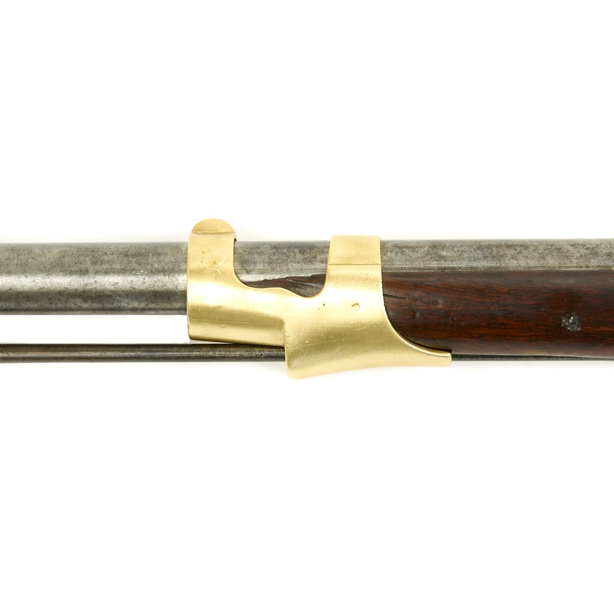 Original Item. Only one set available. This is most interesting, these short muskets come along from time to time, but this very long brass-hilted sword bayonet has always been like Hen's teeth. Both lock and barrel retain their original Arsenal stamps, as do all of the steel and brass fittings. Overall this short musket is in a very very good display condition. All steel butt plate with brass trigger guard, side plate and the center band and nose band all polished. No other markings on front of lock, the 30" barrel of musket bore with bayonet stand to the right hand side, which is marked 64. Overall length is 45 inches.