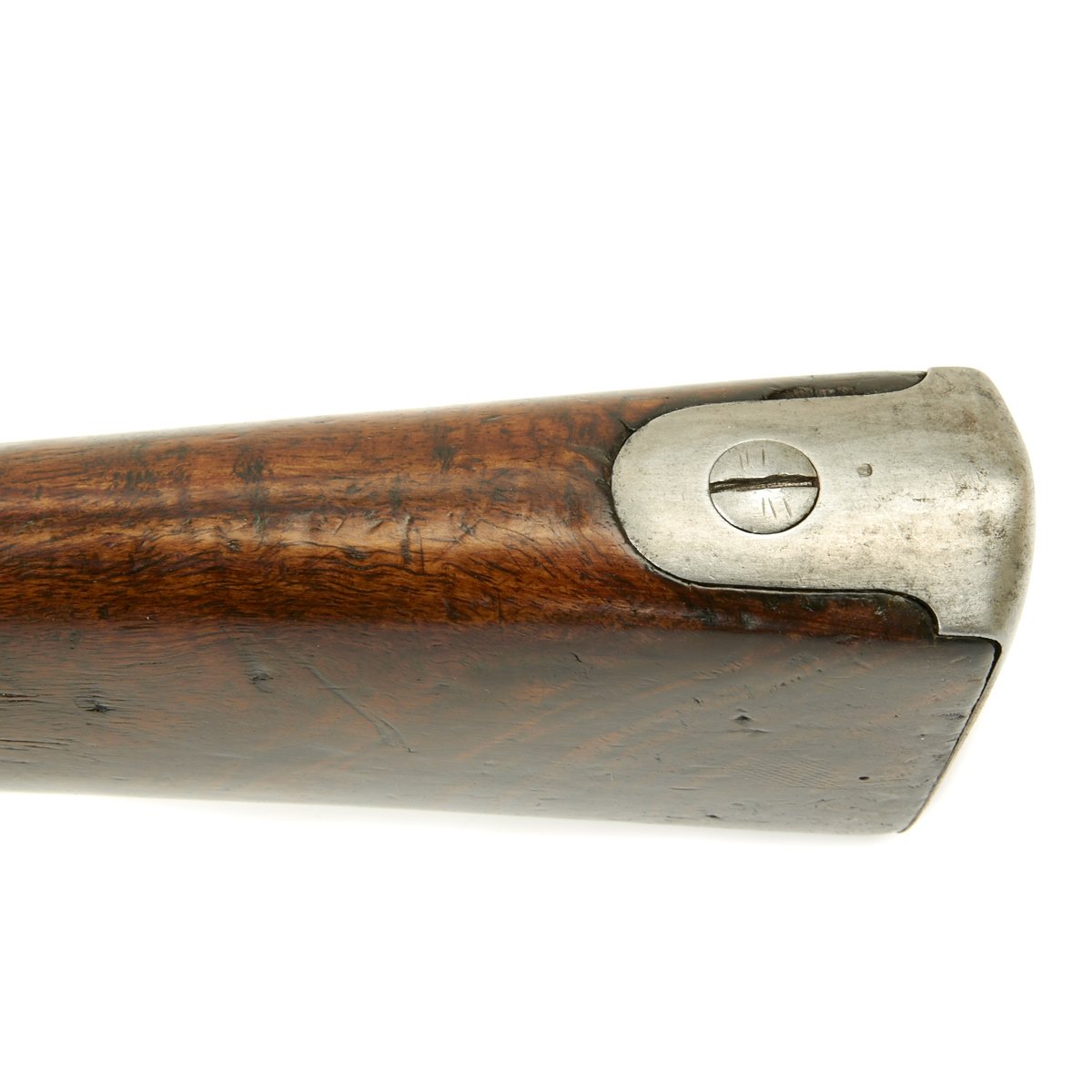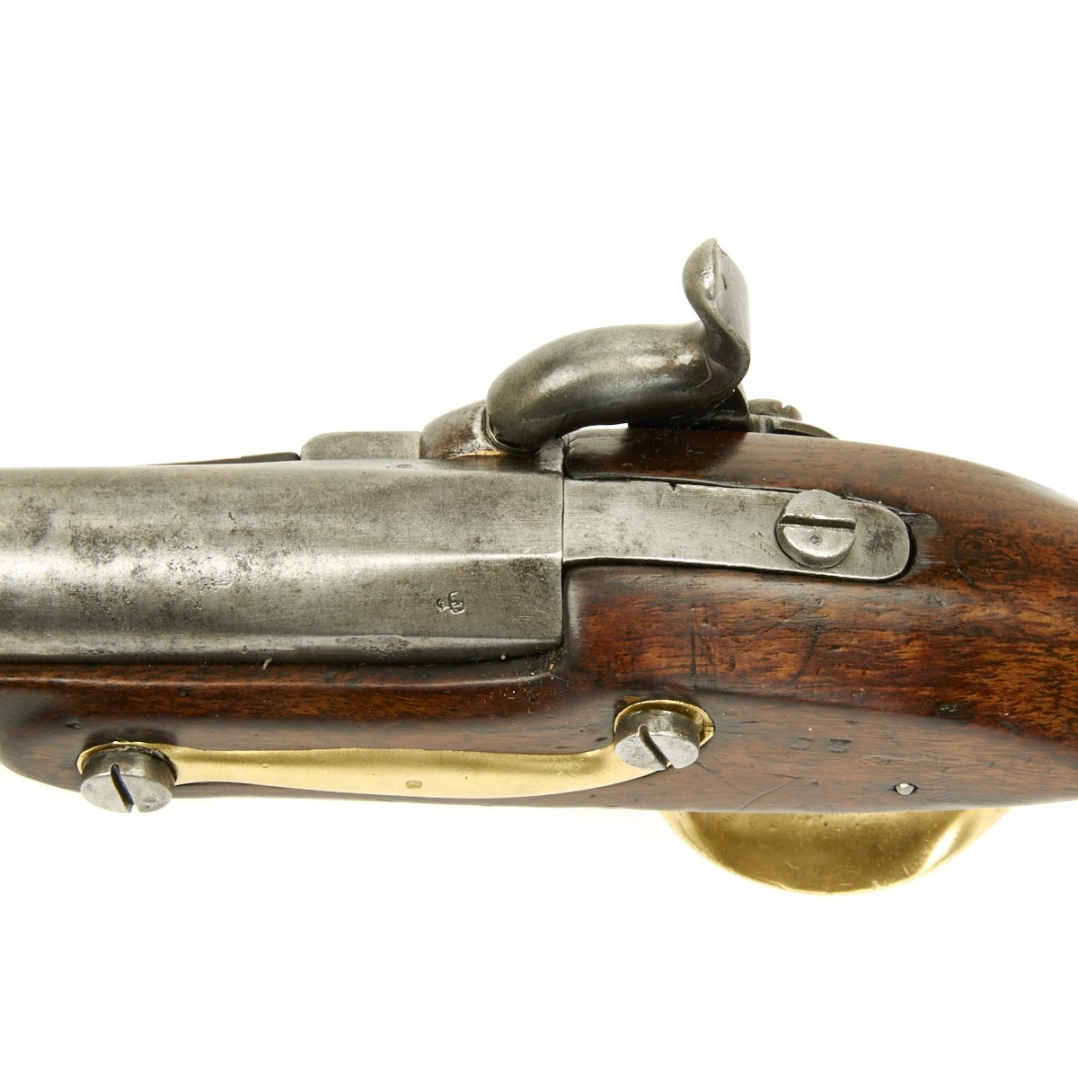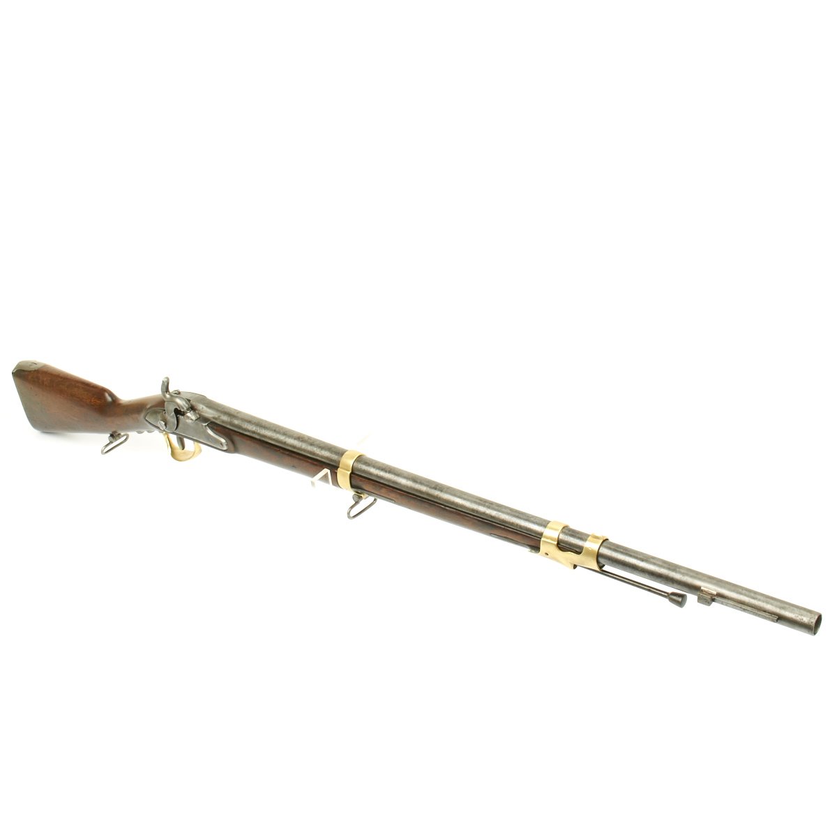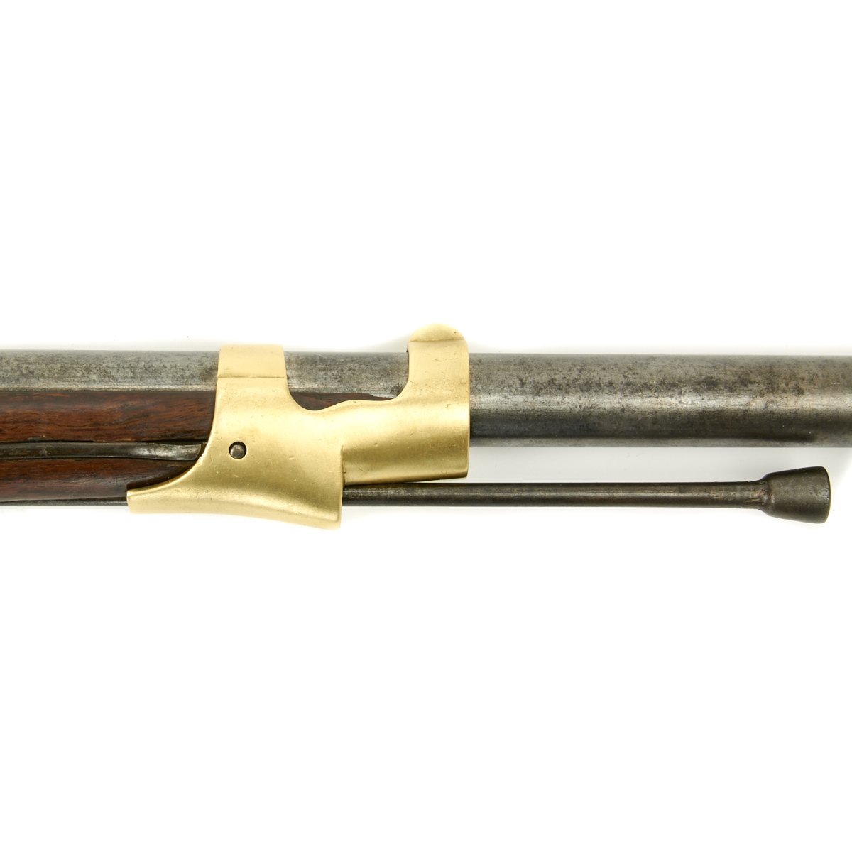 Original Item. Only one set available. This is most interesting, these short muskets come along from time to time, but this very long brass-hilted sword bayonet has always been like Hen's teeth. Both lock and barrel retain their original Arsenal stamps, as do all of the steel and brass fittings. Overall this short musket is in a very very good display condition. All steel butt plate with brass trigger guard, side plate and the center band and nose band all polished. No other markings on front of lock, the 30" barrel of musket bore with bayonet stand to the right hand side, which is marked 64. Overall length is 45 inches.