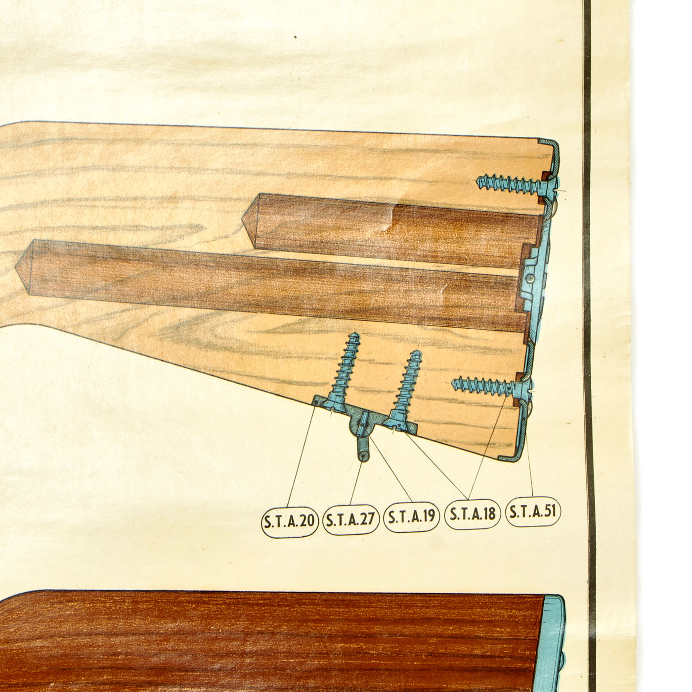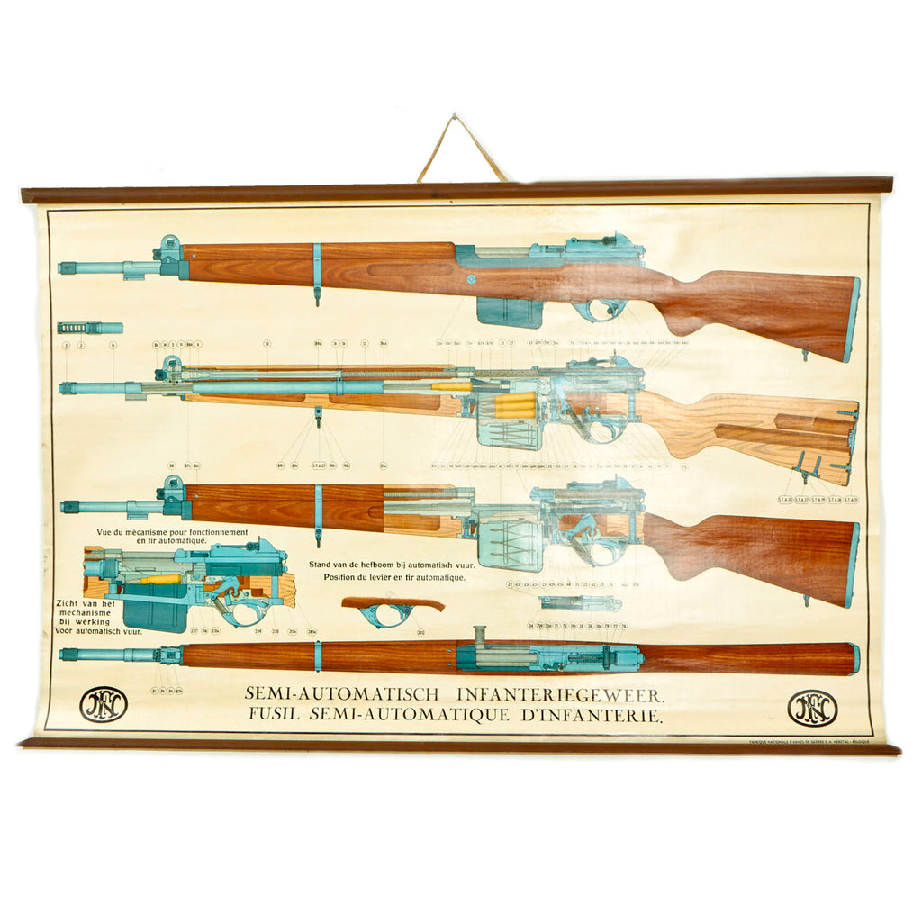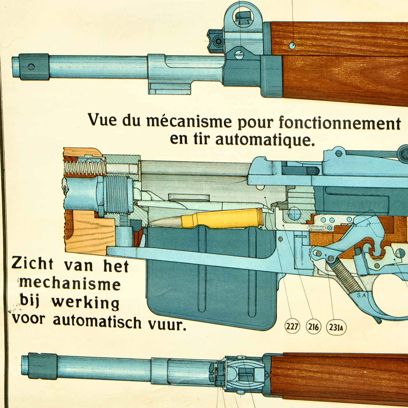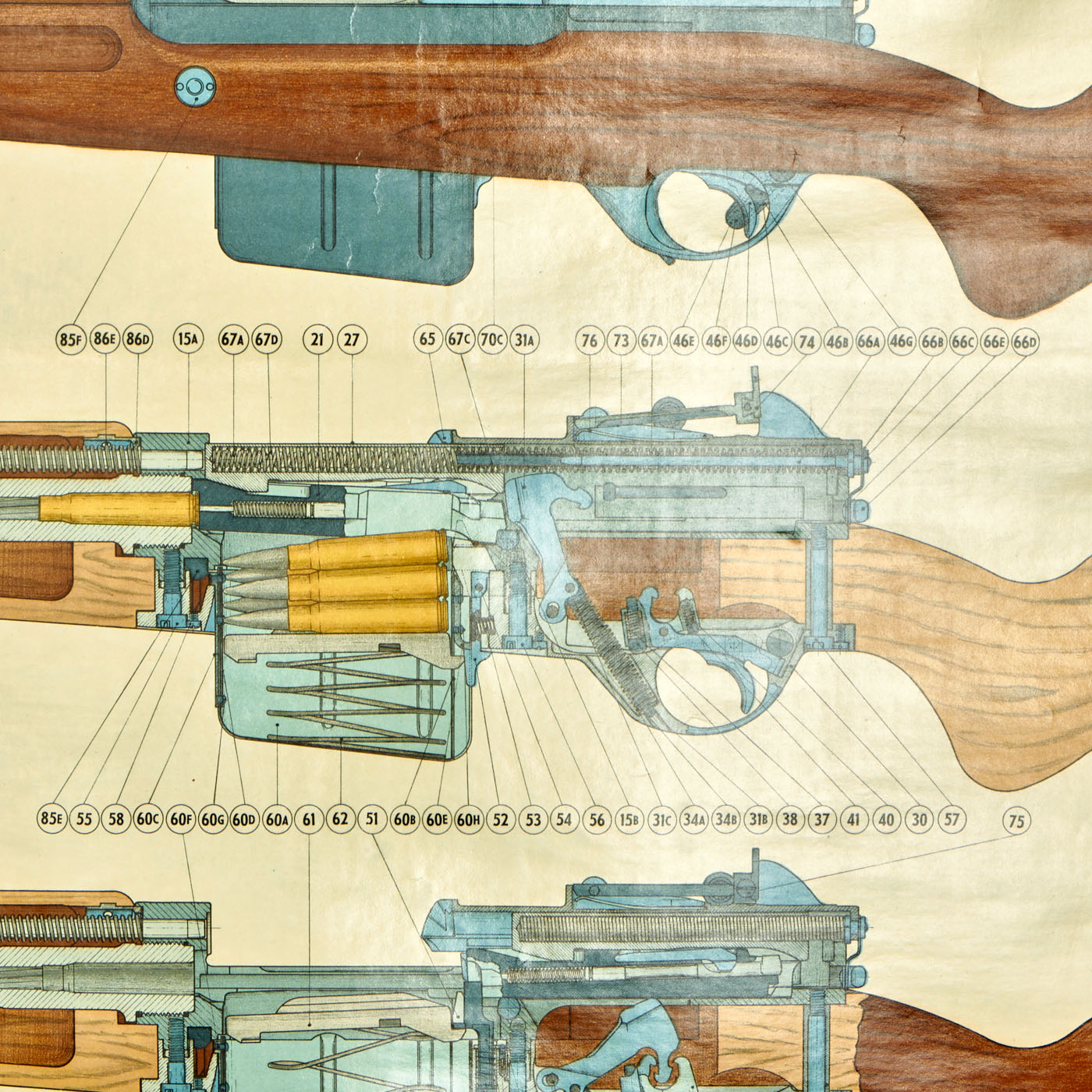 The poster is what you would have seen in a classroom environment upon receiving this “new” rifle. The images shown are solid views as well as cutaway views so you can better understand the rifle you were issued and how it functions. There are numbers located next to the various parts shown and this was more than likely used in conjunction with some sort of printed out list to help identify parts.