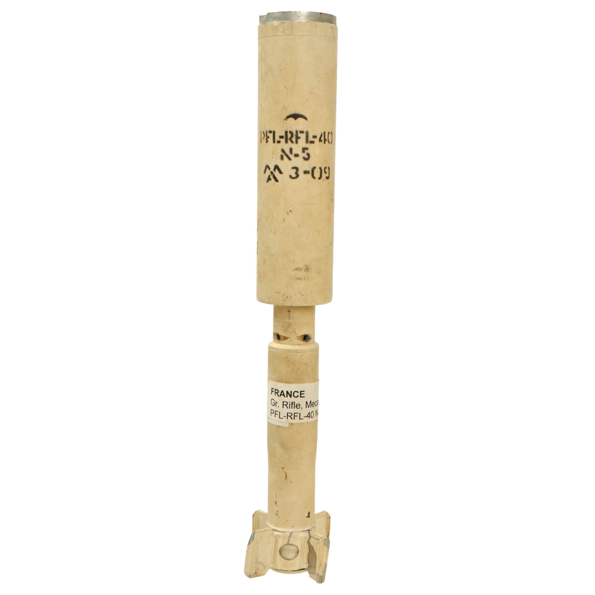The first grenade, which is Belgian, is an M259 rifle grenade, labeled PFL-RFL-40 N-5 3-09. It is a rifle-launched, parachute-illuminating, rifle grenade used for signaling and illumination. This example is missing the top cap, and has been completely emptied. This one has a paper label wrapped around the shaft reading FRANCE Gr. Rifle, Mecar PFL-RFL-40 N-5.