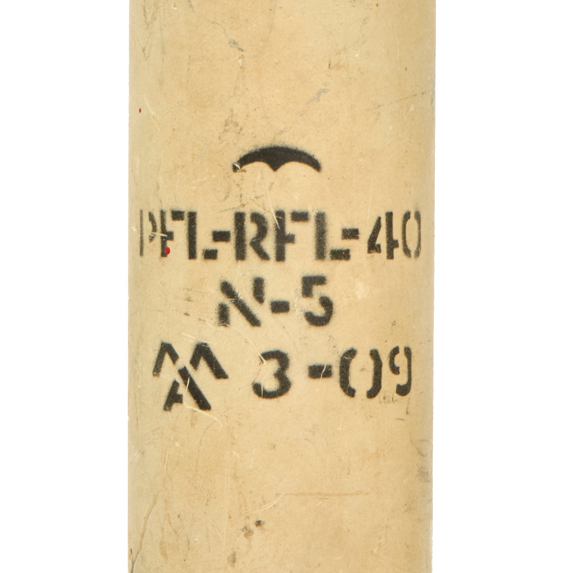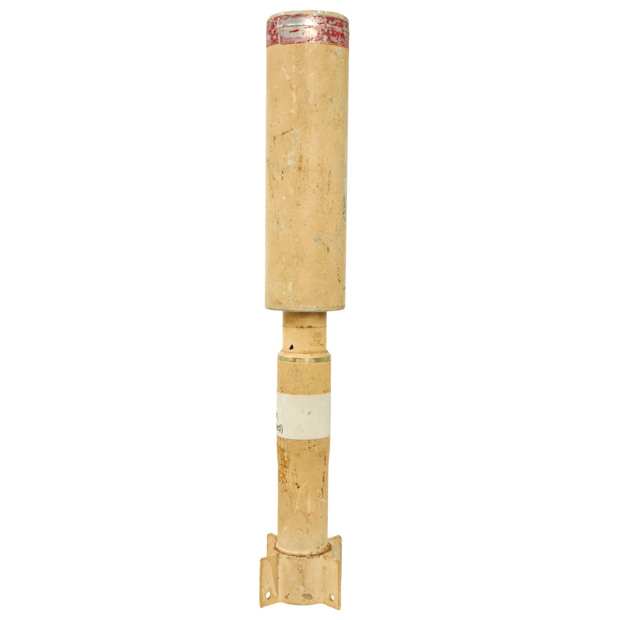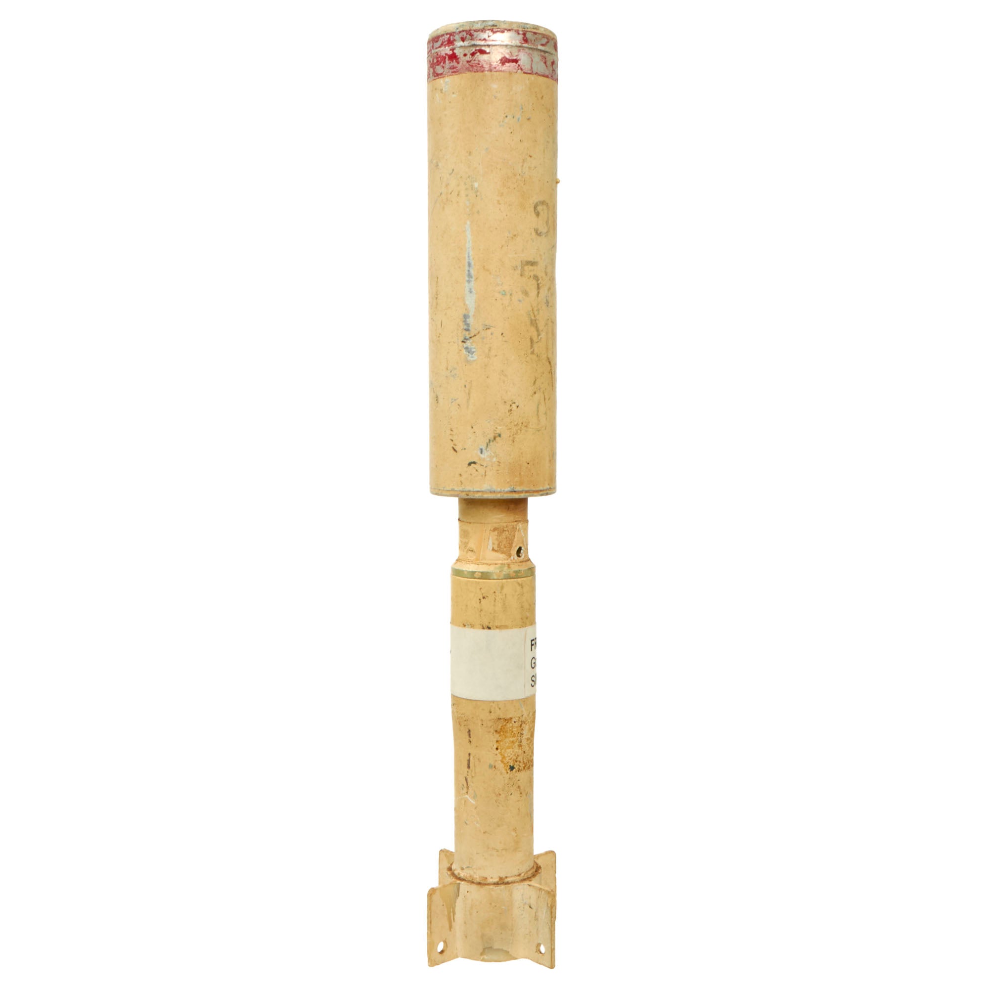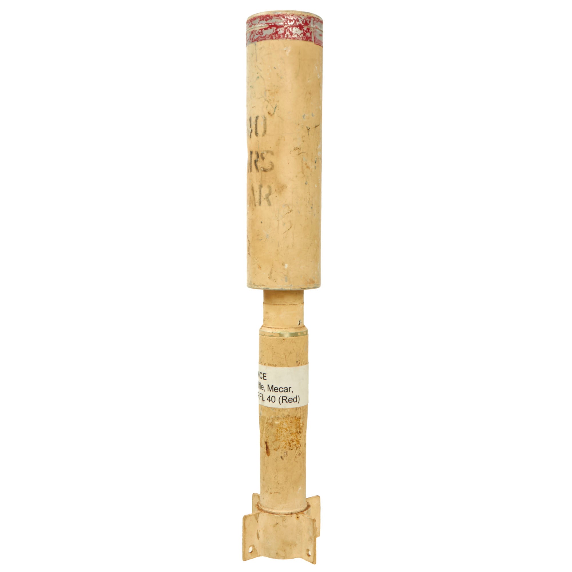 The rifle grenade measures approximately 11 ½” inches in length and is a 40mm type round. The round itself is a rifle launched flare, much like the HE rifle grenades, but this burns just like a flare shot from a signal pistol. The condition is very nice with all trail fins present. Much of the original paint is still present, as are the arsenal markings for MECAR.