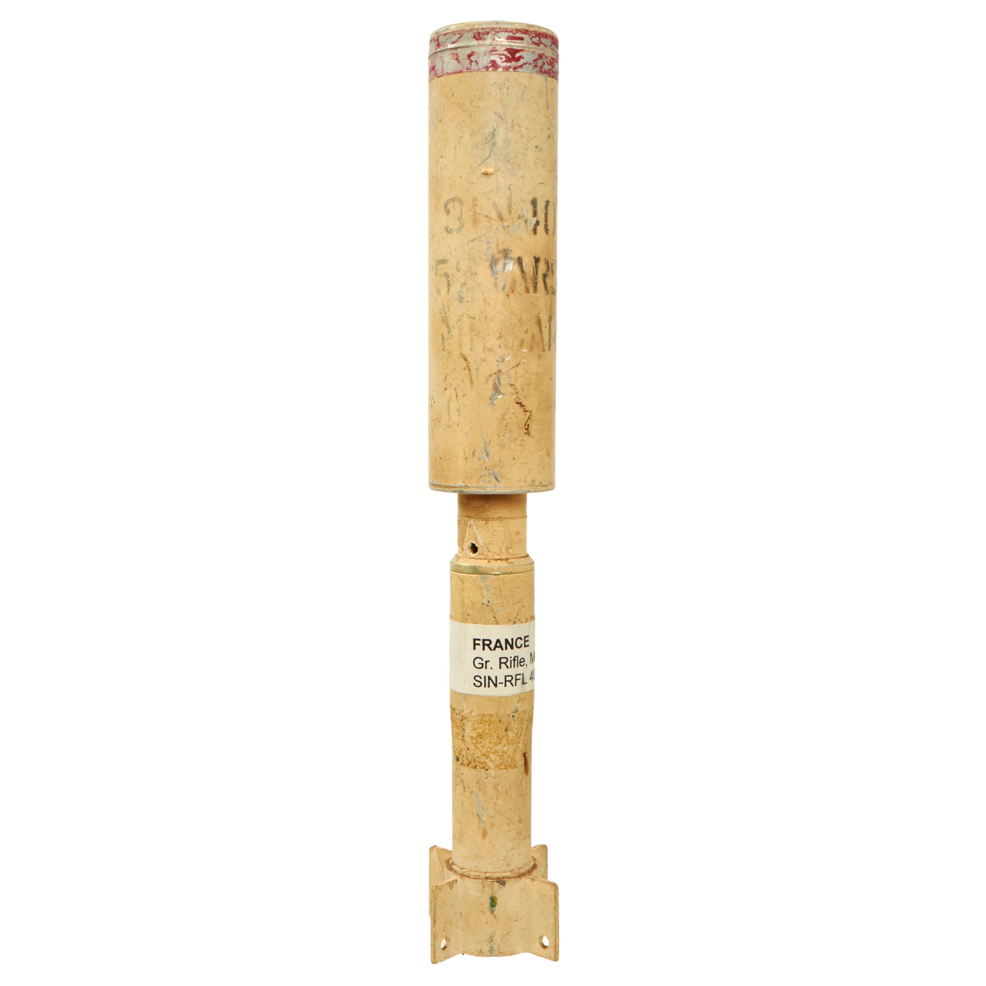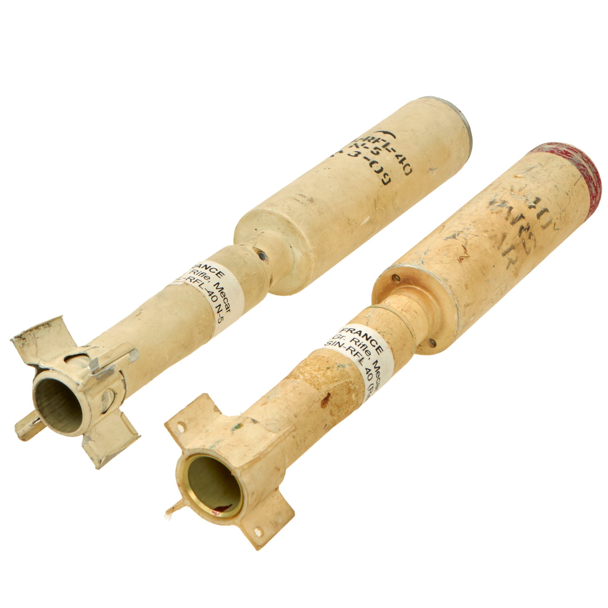 Original Items. Only One Available. This is a set of two inert illumination rifle grenades that came out of an old museum, still retaining their identification tags wrapped around the shaft. Despite both being labeled French, they are both Belgian. As with all deactivated ordnance, this item is not available for export.
