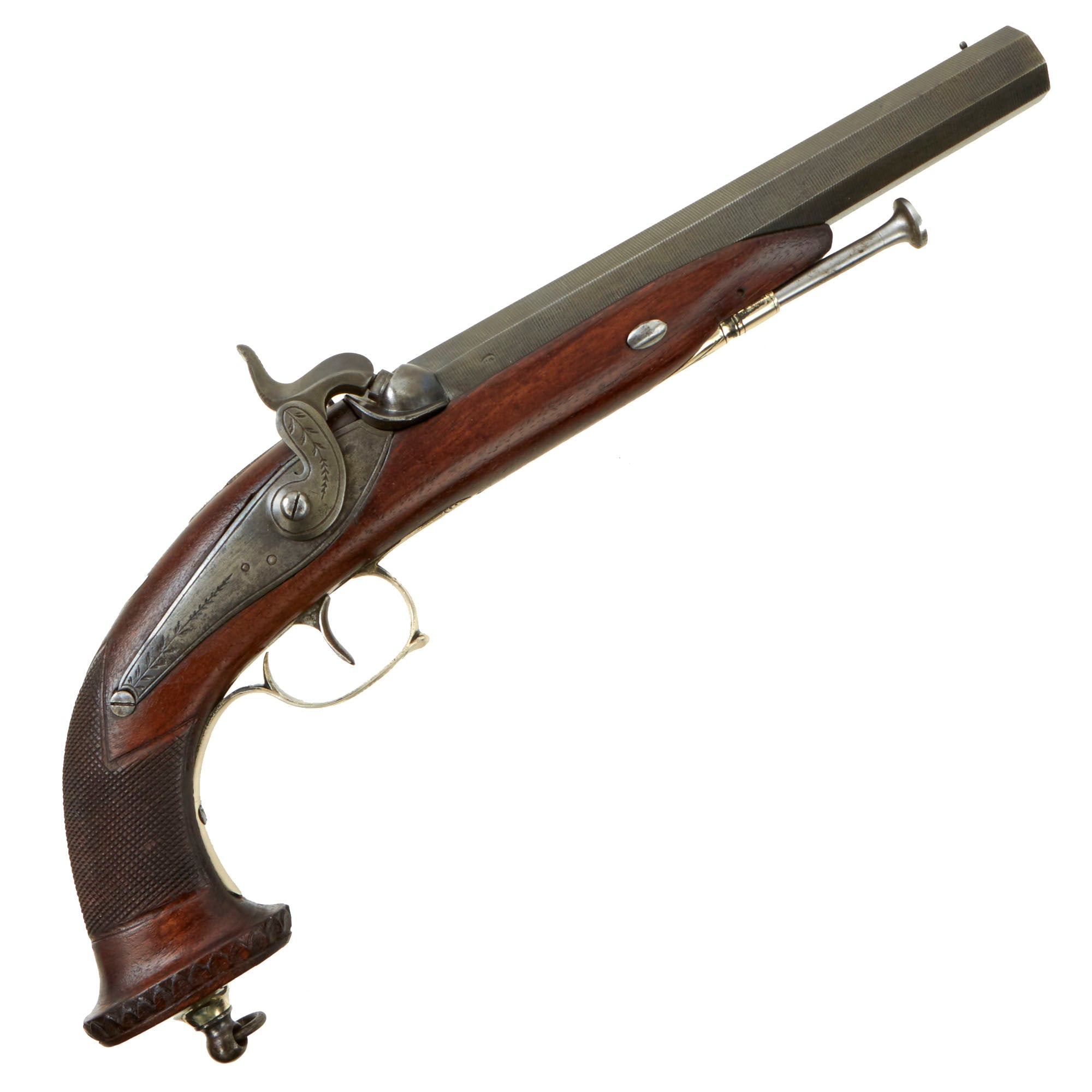 Original Item. Only One Available. This is a lovely Belgian percussion pistol, made very much in the French "Versailles" style, with a flat bottom flared grip, and some lovely engraved silver appointments. This style was developed by famed gunsmith Nicolas-Noël Boutet, and they were very popular during the Napoleonic Period with French officers. Even after the wars were over, the style remained very popular. This example was made in Liège, Belgium, a gunmaking center even today. It has an octagonal 8 1/4 inch barrel, which has very large 0.70" bore. The exterior has a lovely faux Damascus milled texture, which possibly was etched onto the barrel.
