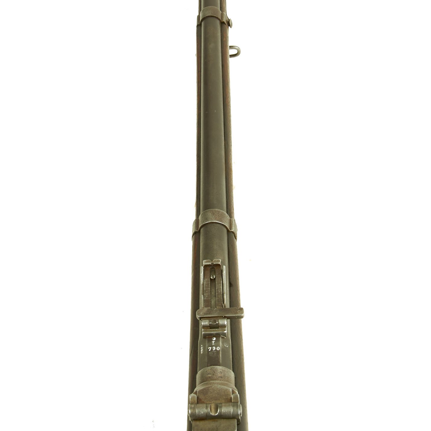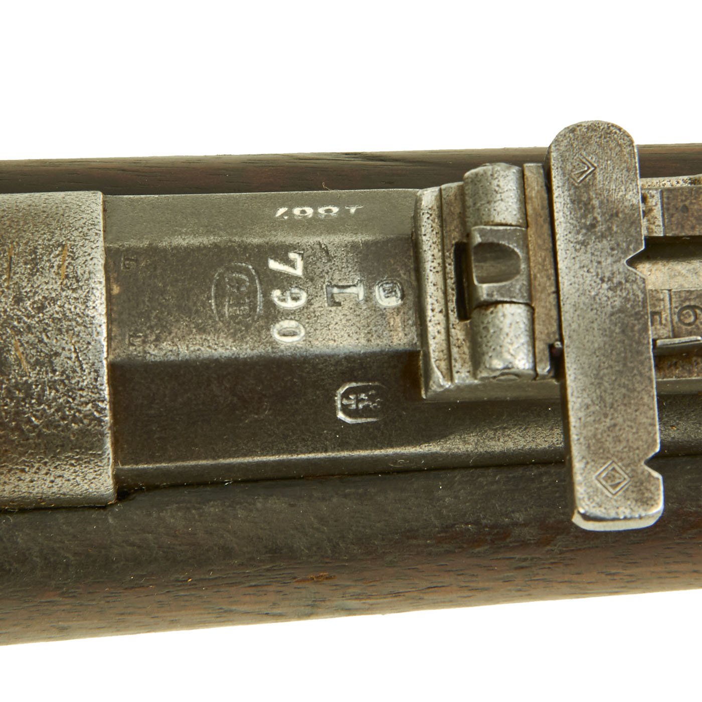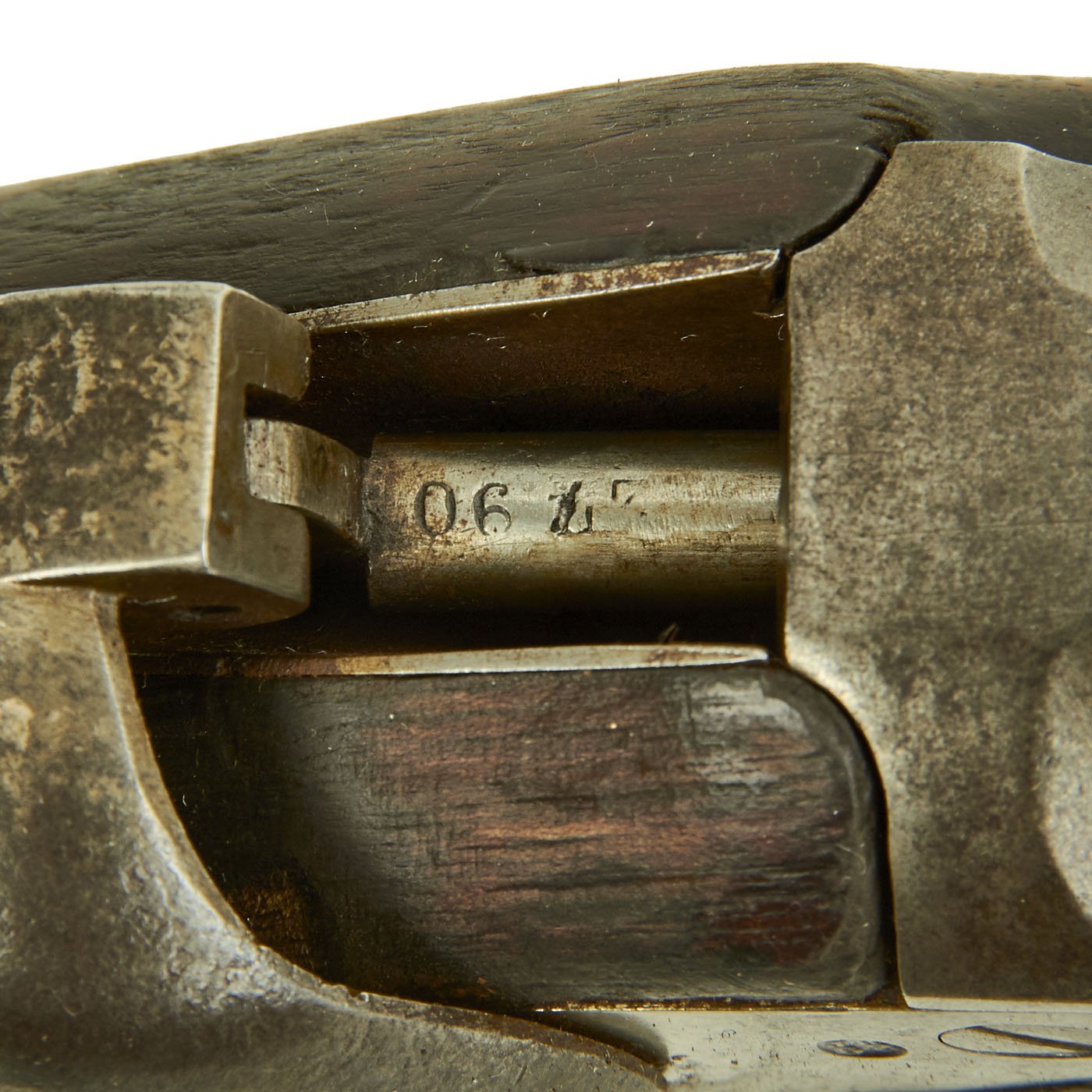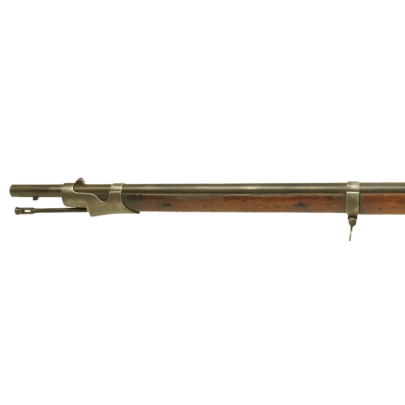 Our example is dated 1867 on the left side of the barrel nocks form, and has multiple proofs and inspection marks on the metal work. Serial number 790 is present on many of the components of the rifle, and the action functions correctly. The metal is in it's original steel color, the markings appear all to be present. The stock bears the usual scuffs and dents from military handling. The metalwork has an overall peppered patina, with light past pitting, which is a bit worse on the butt plate. The bore, on the other hand, is bright and shiny, with crisp lands and grooves. The rifle comes with its cleaning rod and is fully operational from what we can see.