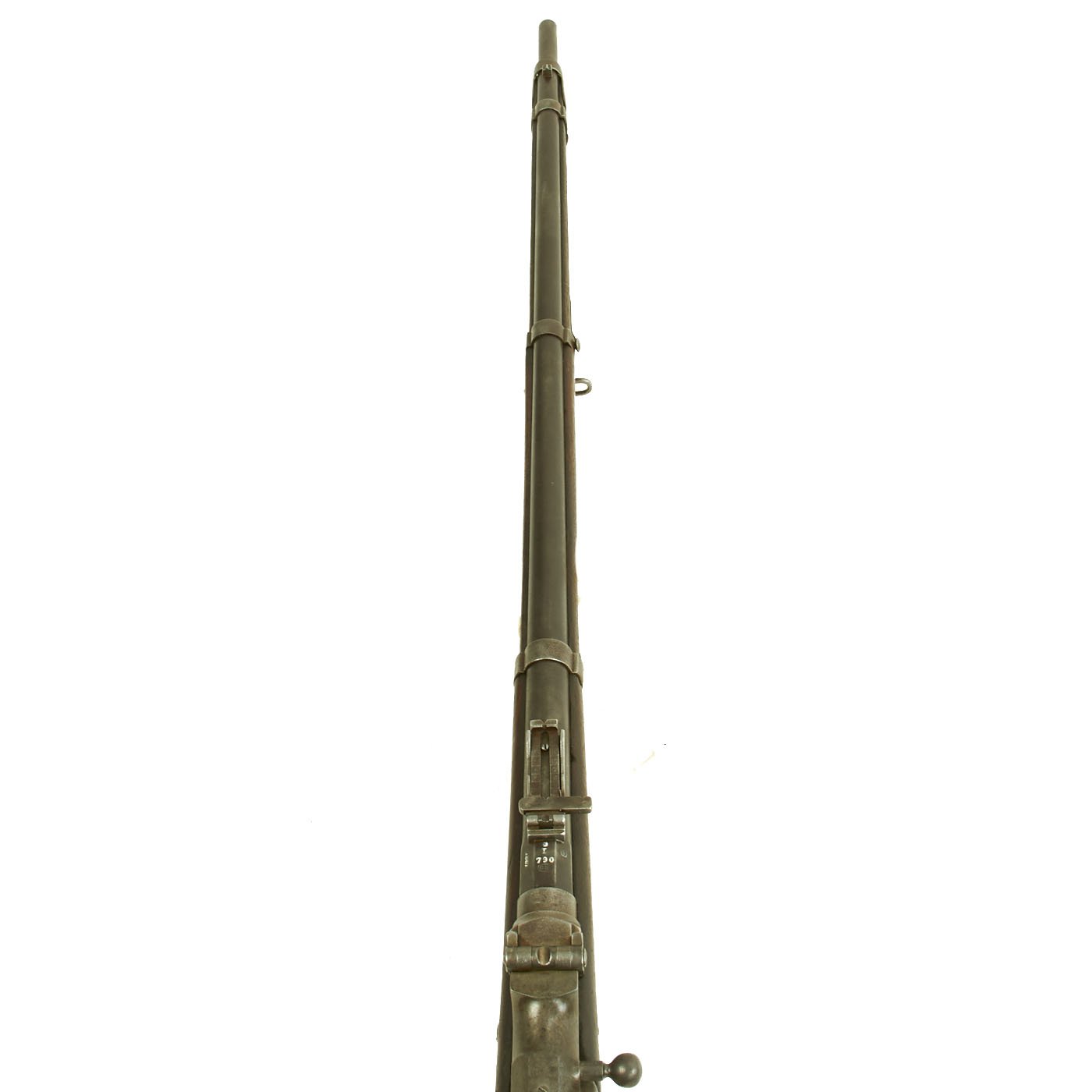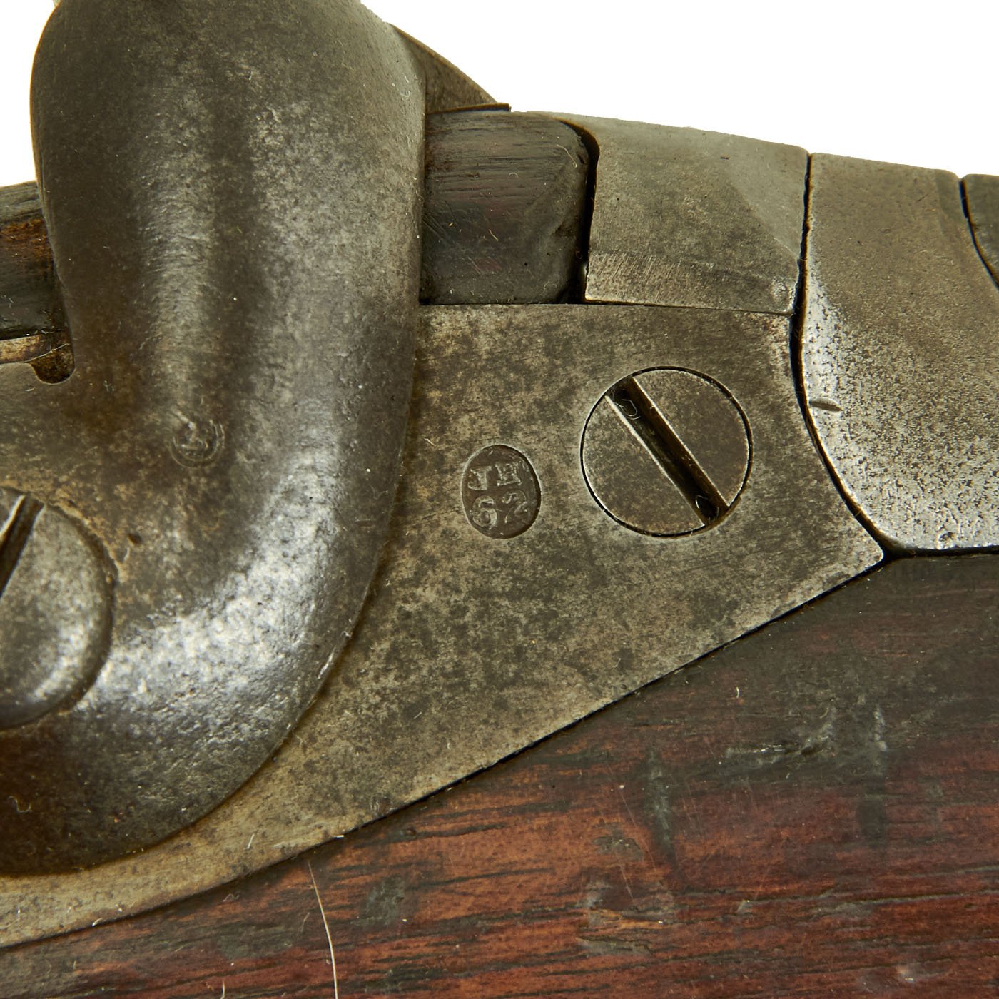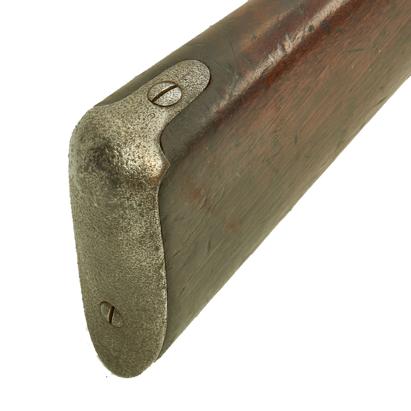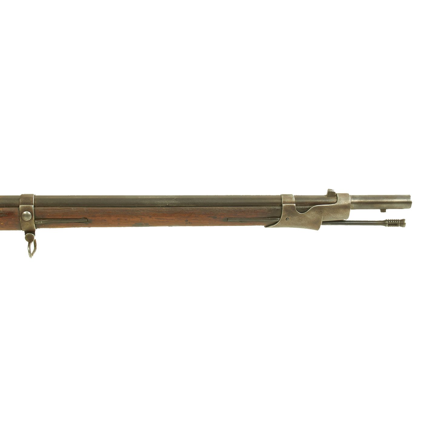 Our example is dated 1867 on the left side of the barrel nocks form, and has multiple proofs and inspection marks on the metal work. Serial number 790 is present on many of the components of the rifle, and the action functions correctly. The metal is in it's original steel color, the markings appear all to be present. The stock bears the usual scuffs and dents from military handling. The metalwork has an overall peppered patina, with light past pitting, which is a bit worse on the butt plate. The bore, on the other hand, is bright and shiny, with crisp lands and grooves. The rifle comes with its cleaning rod and is fully operational from what we can see.