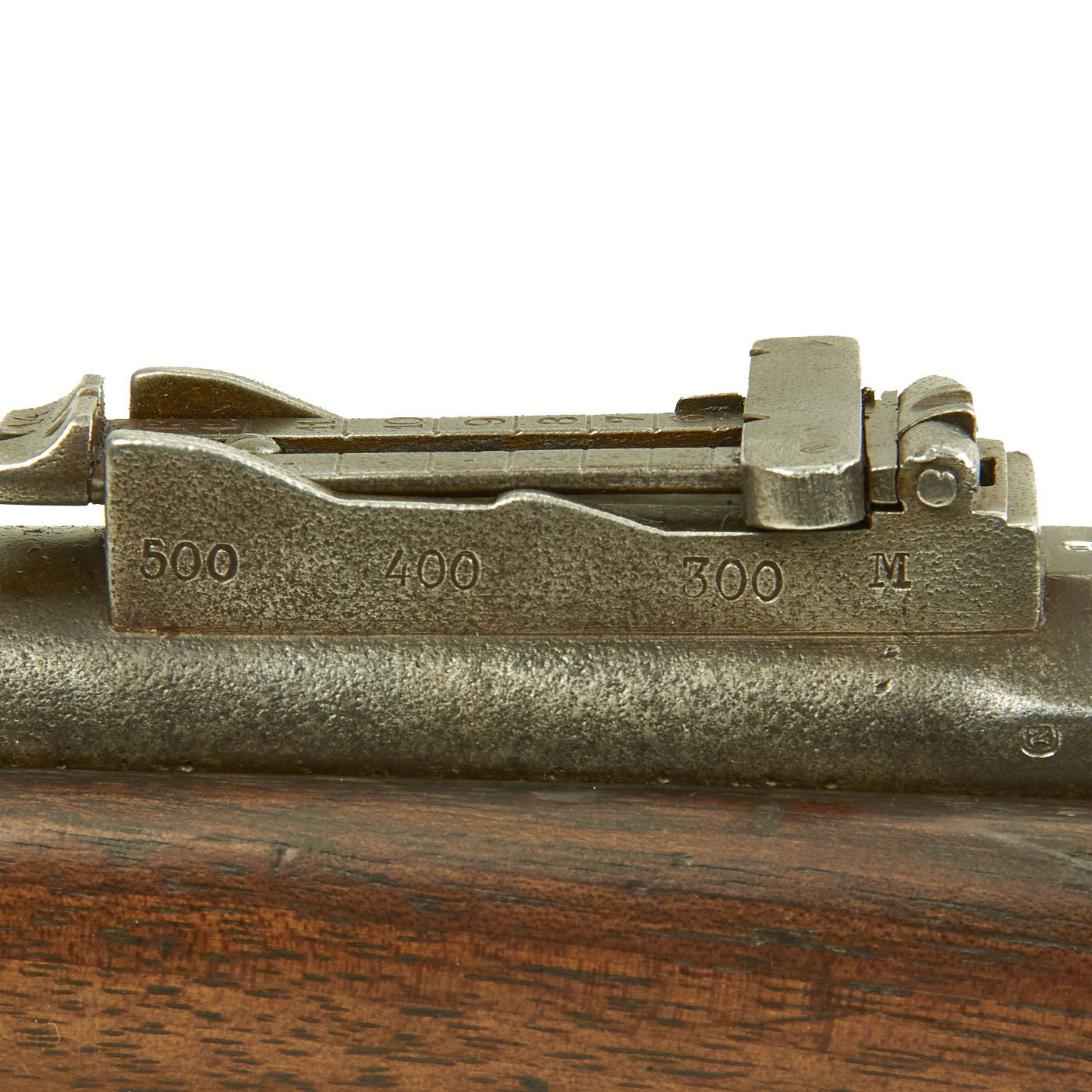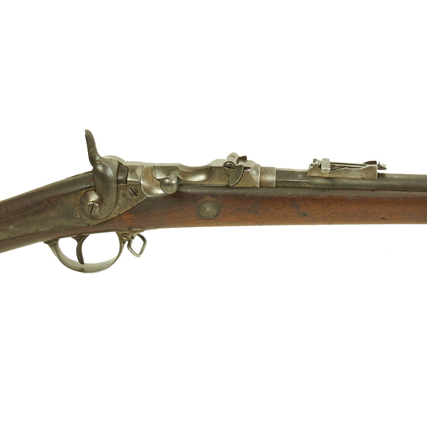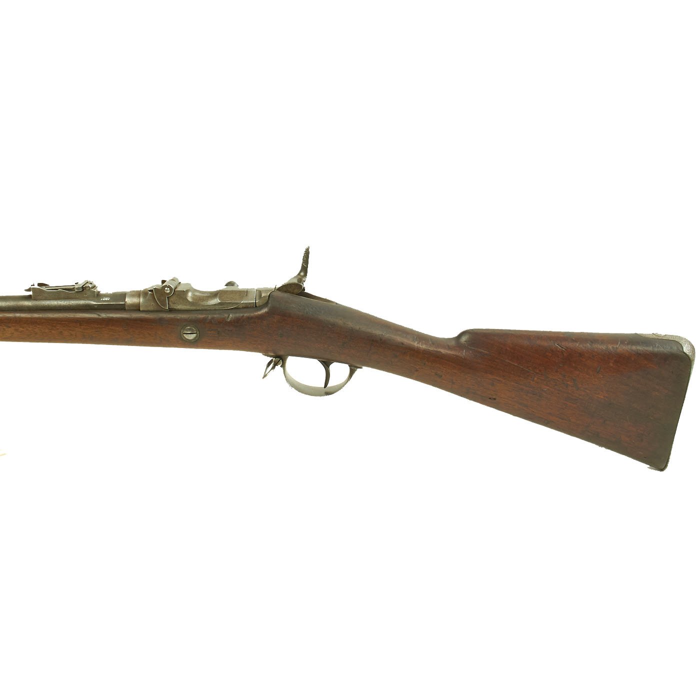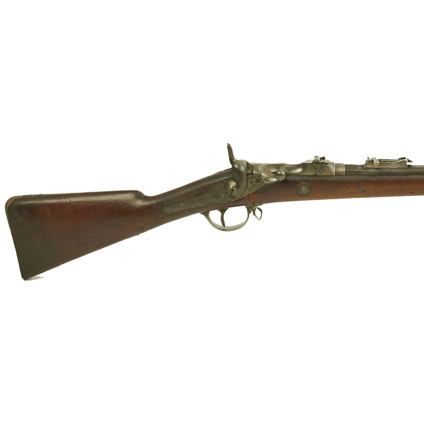 Our example is dated 1867 on the left side of the barrel nocks form, and has multiple proofs and inspection marks on the metal work. Serial number 790 is present on many of the components of the rifle, and the action functions correctly. The metal is in it's original steel color, the markings appear all to be present. The stock bears the usual scuffs and dents from military handling. The metalwork has an overall peppered patina, with light past pitting, which is a bit worse on the butt plate. The bore, on the other hand, is bright and shiny, with crisp lands and grooves. The rifle comes with its cleaning rod and is fully operational from what we can see.