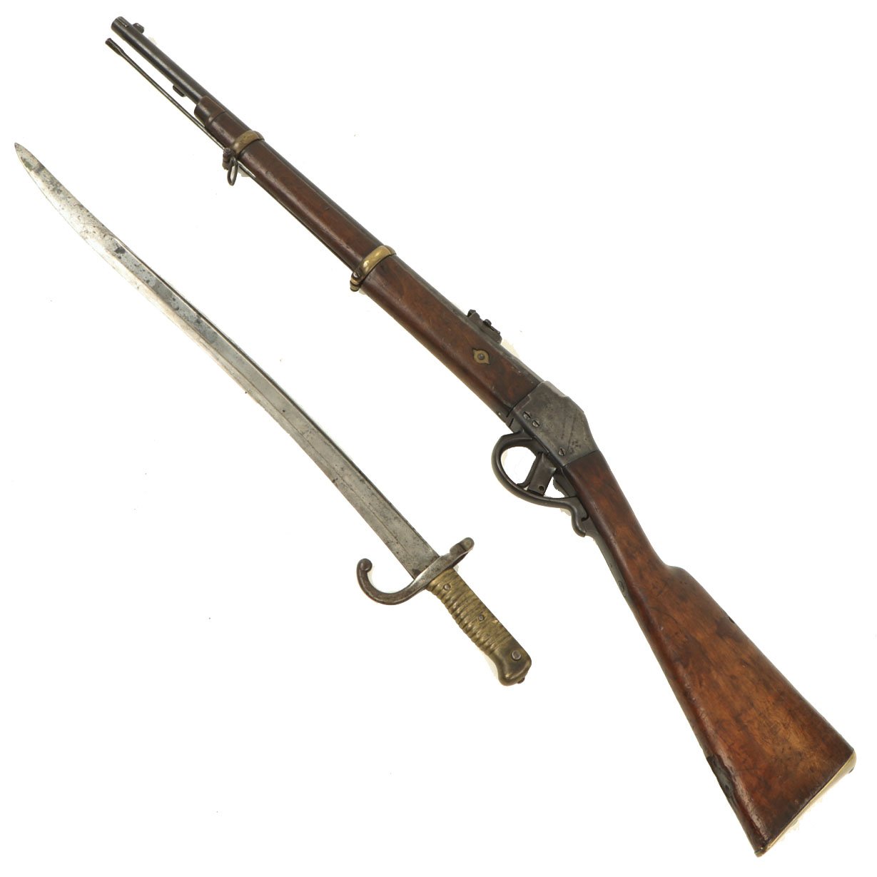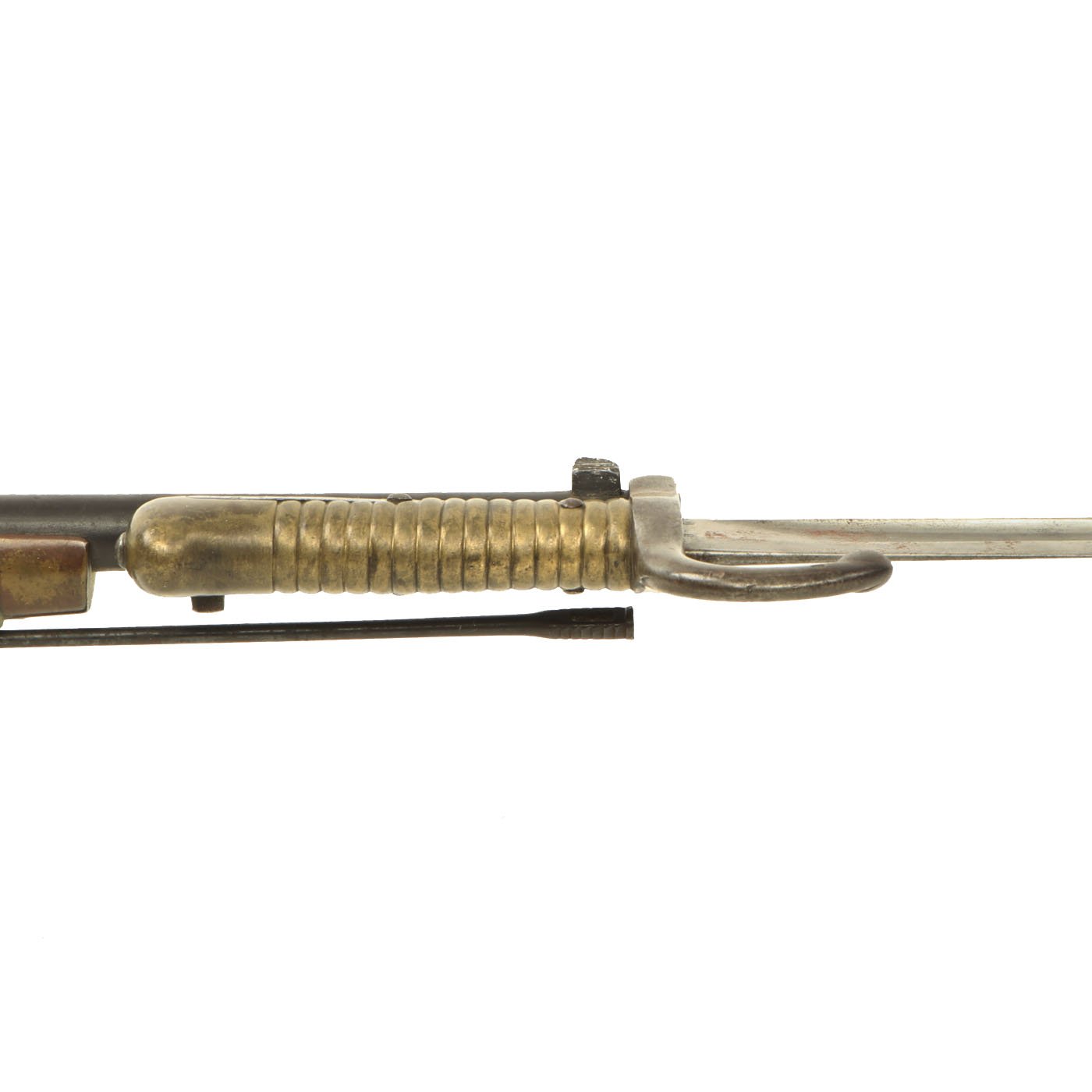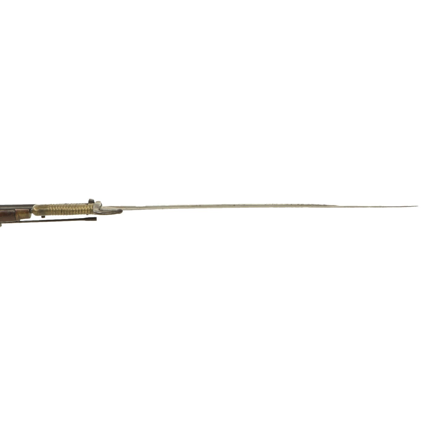 The carbine comes with a very nice example of the long "yataghan" saber bladed bayonet for the French Fusil modèle 1866 "Chassepot" Needle Fire rifle. These were very often cut down or altered later on in their service life, but this example still has the original full length 22 3/4 inch long blade, with an overall length of 25 1/2 inches.