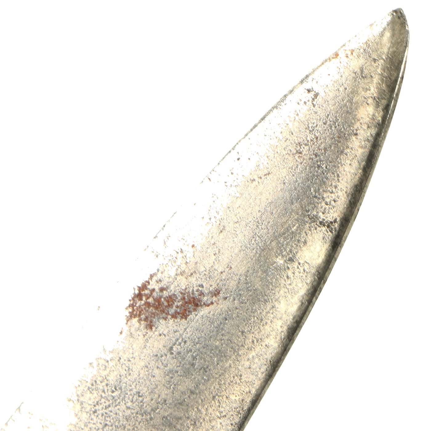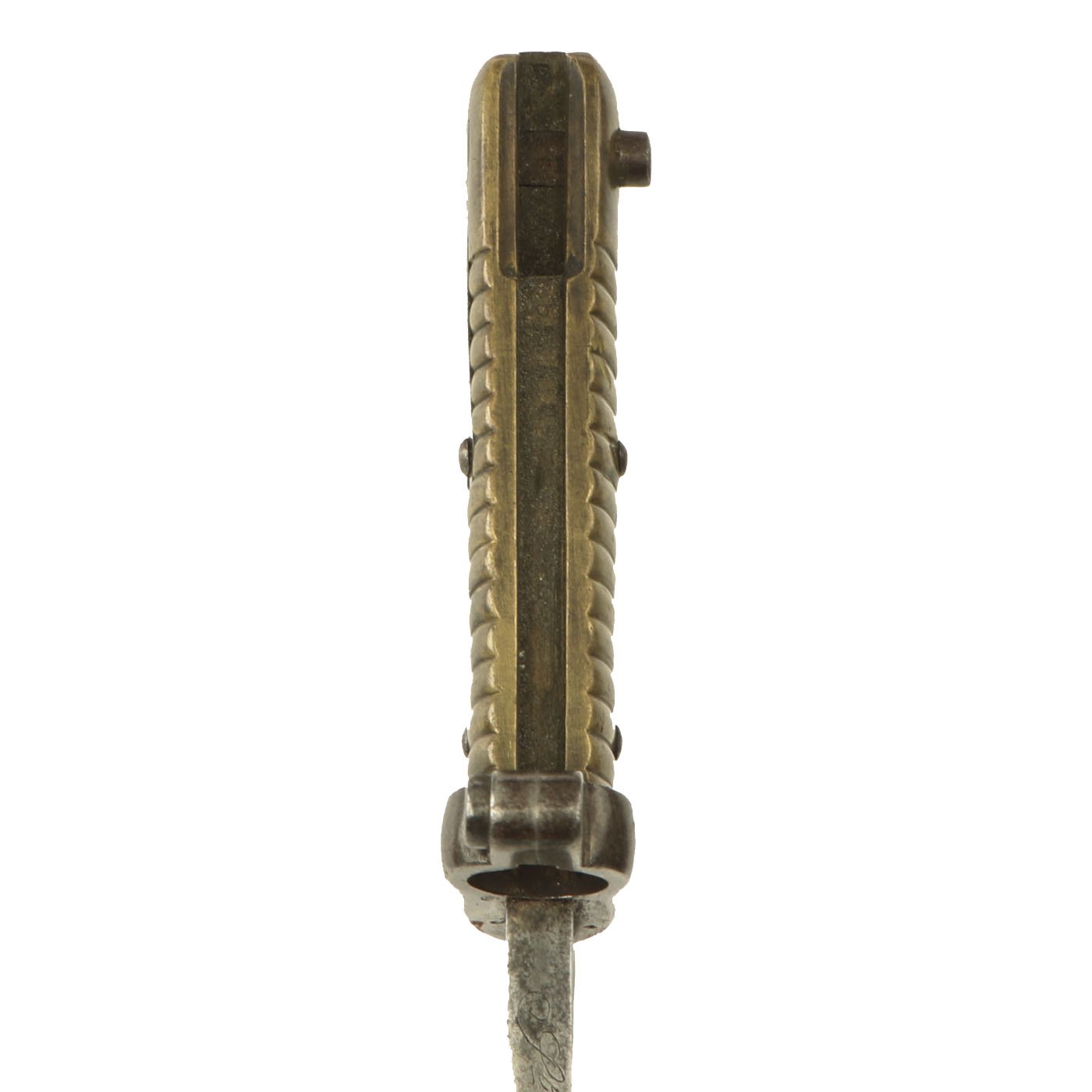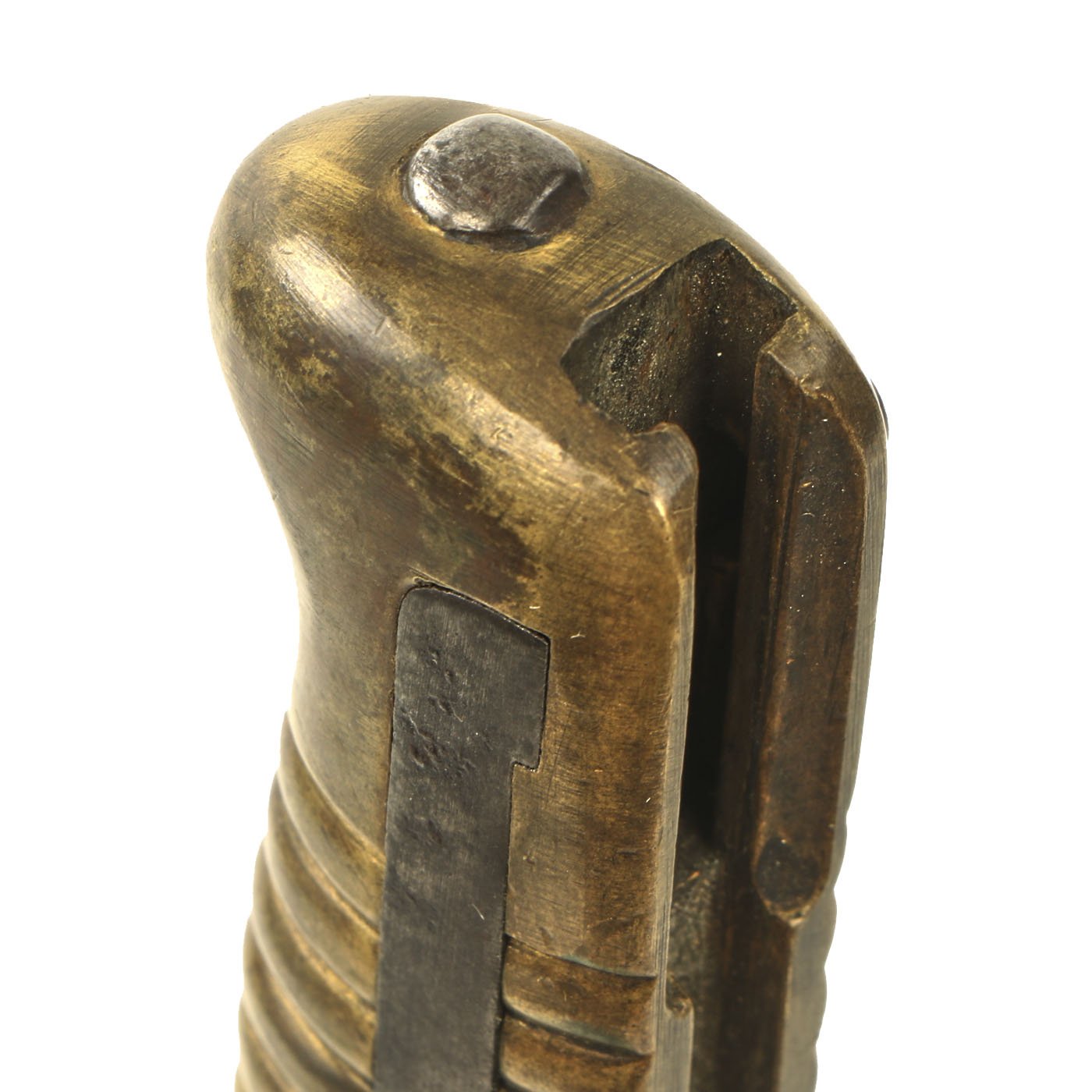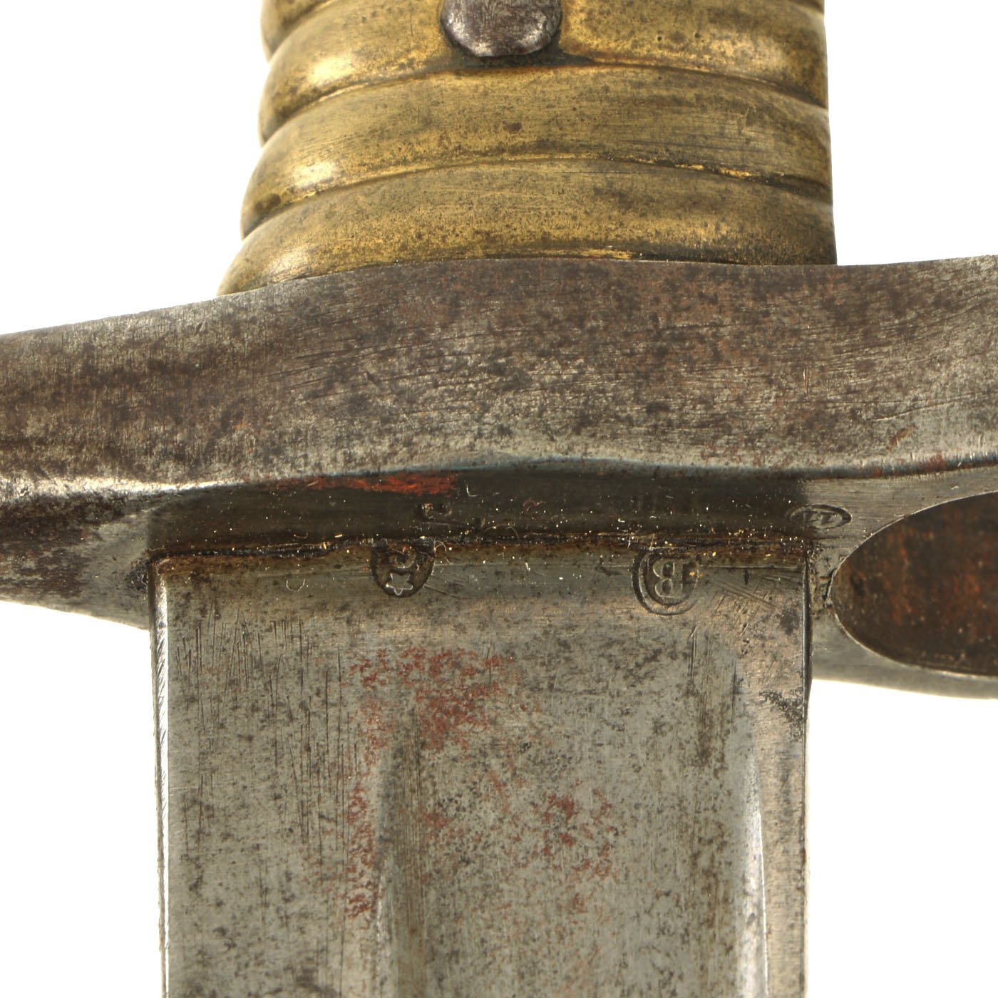 The spine of the bayonet is marked St. Étienne Mars 1872, indicating original manufacture at the arsenal in St. Étienne, during March 1872. It is in very good condition, with a mostly bright blade, with some areas of light staining. The brass handle has a lovely aged mustard patina.