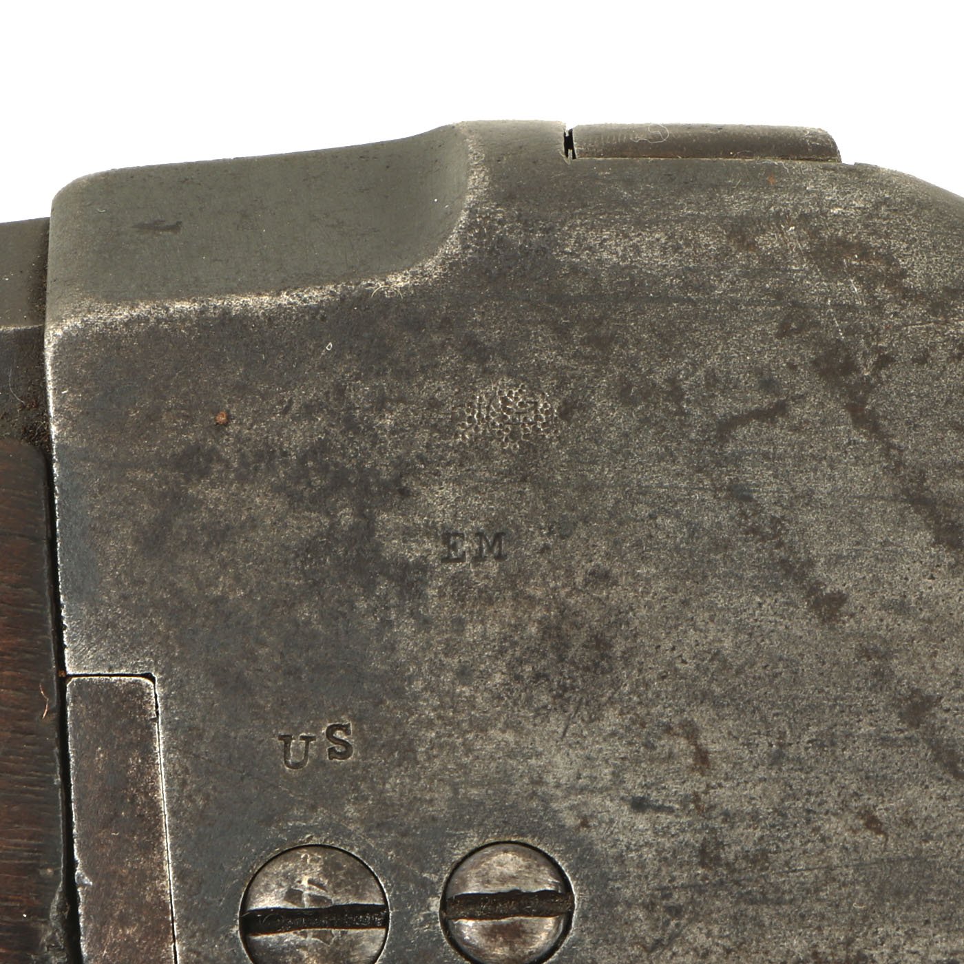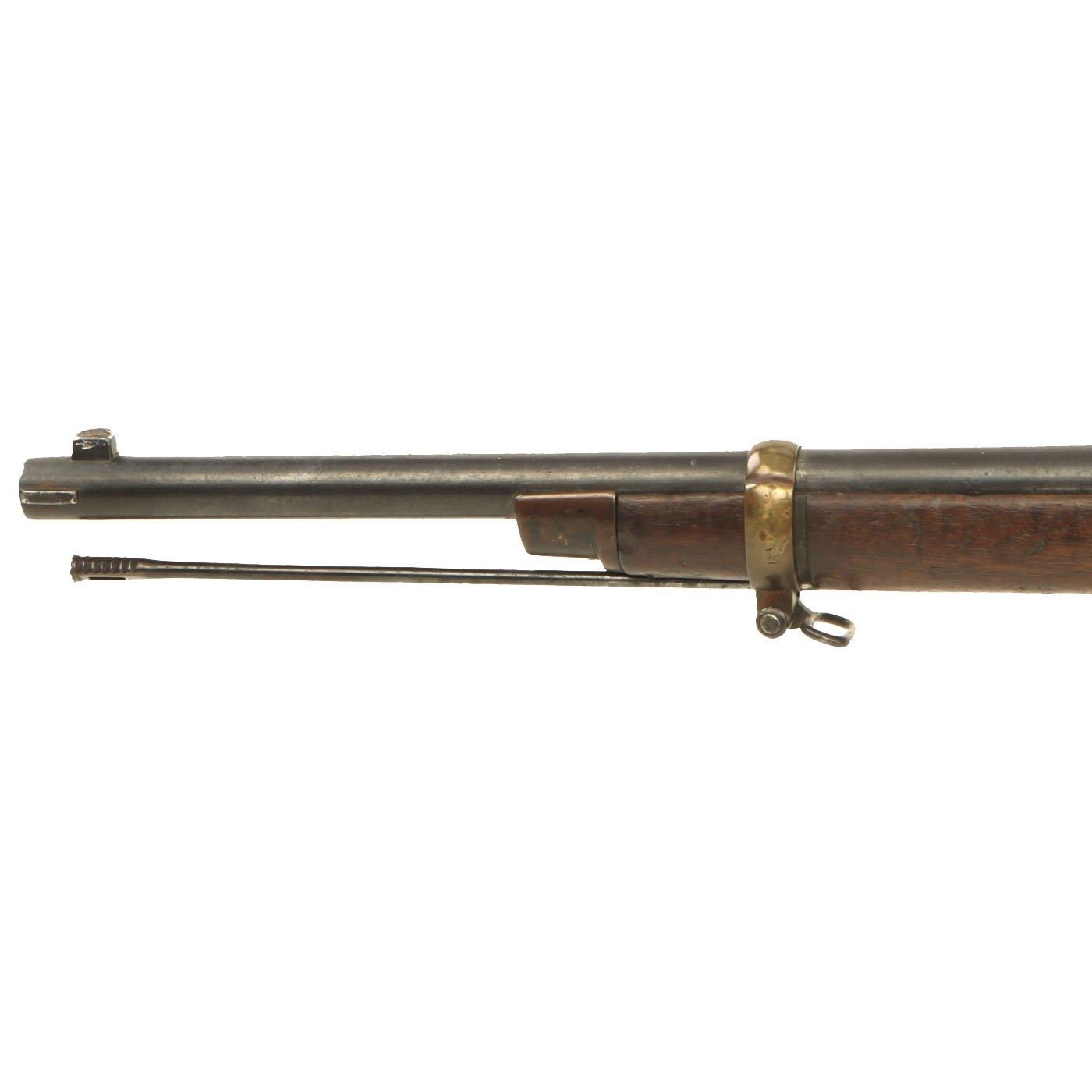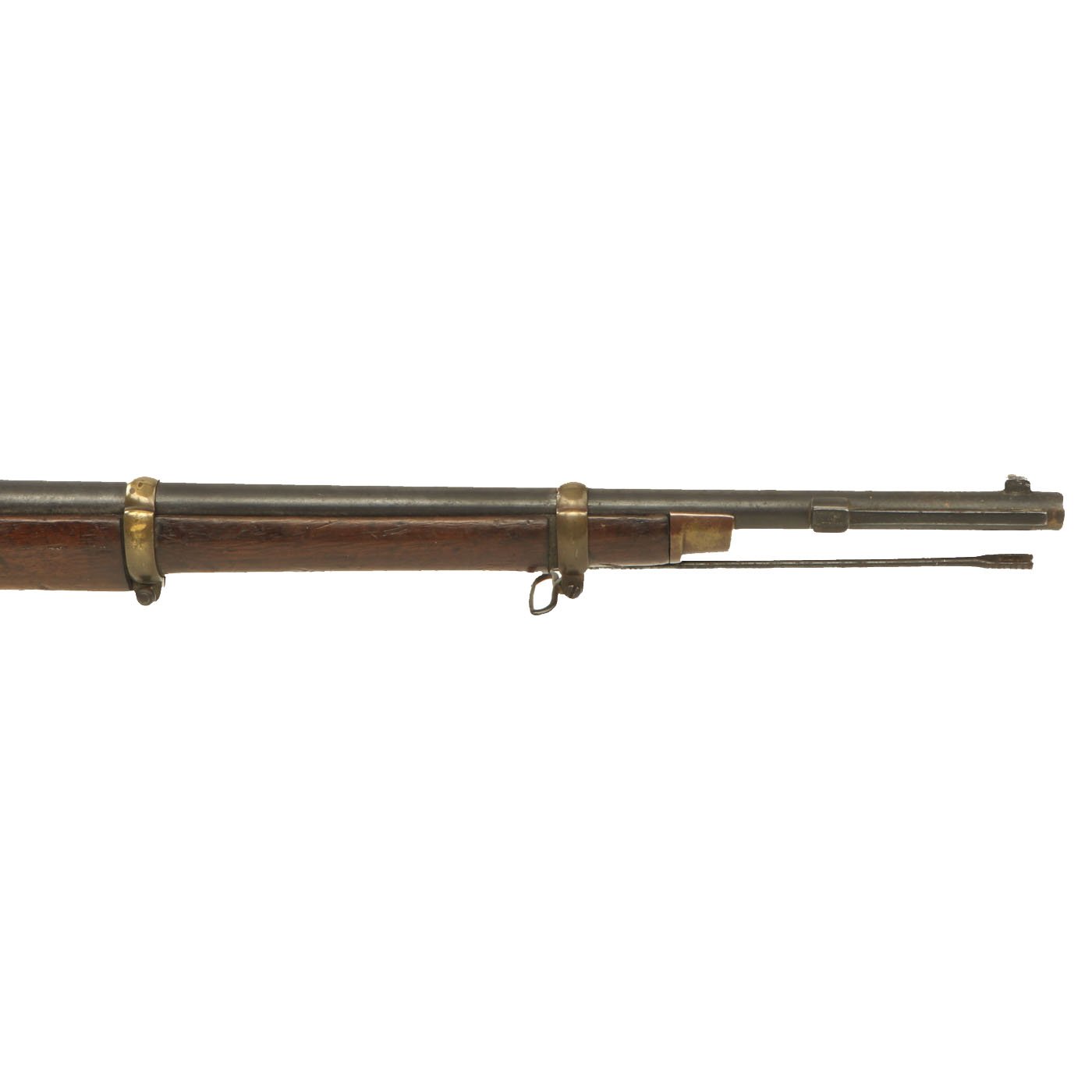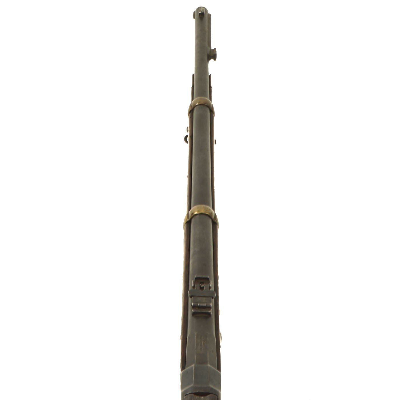 The barrel has a lovely blued finish with some peppering from age. The butt Plate, Nose Cap and barrel bands are brass, while the screws and trigger guard are steel. The two piece wood stock is in good condition, with a nice patina and signs of wear. Comes complete with the original cleaning rod. Bore is in very good condition, with clear lands and grooves, and a mostly bright finish. Just a small amount of darkening is present in some of the grooves. There are proof marks on the receiver and other parts of the gun.