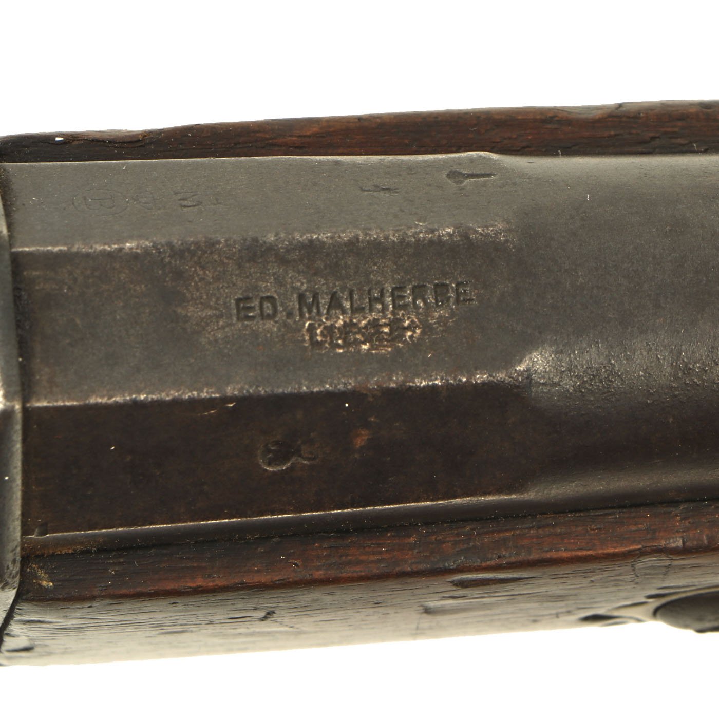 This example bears serial number 28637, and is in very good condition. The action is bare steel, and is marked with additional serial number 10234, which matches the bayonet stand, but not the bolt, which is marked 10366. It was almost certainly re-worked at arsenal at some point. The top of the barrel knox form is marked ED. MALHERBE / A LIÈGE, a well known Belgian firearms and edged weapon manufacturer. There is also the typical E / L G / * in an oval proof mark of Liège, though some attempt has been made to stamp over some markings. There is also an arsenal rondel on the left butt stock, which is not entirely legible, but looks to be South American.