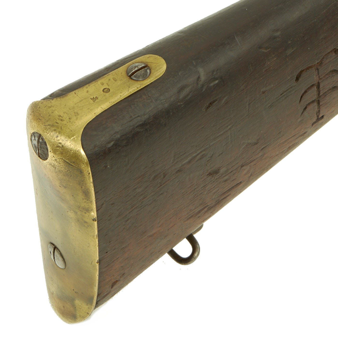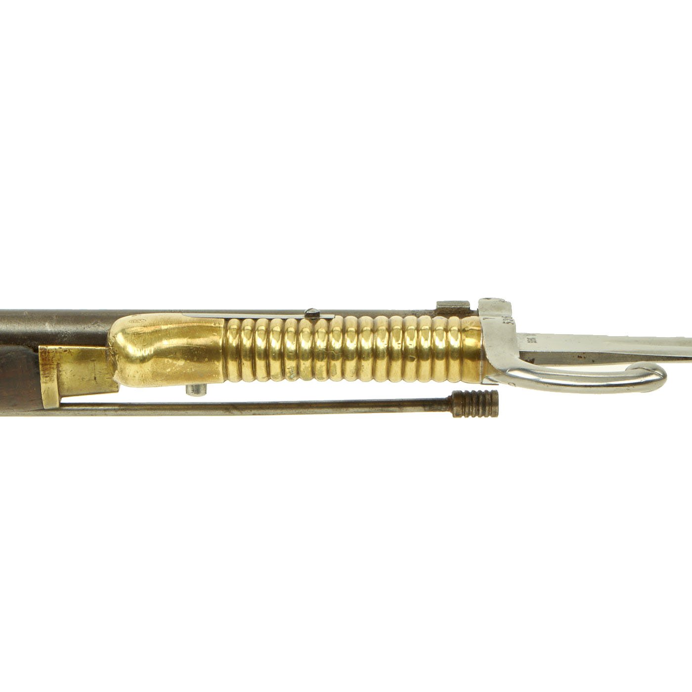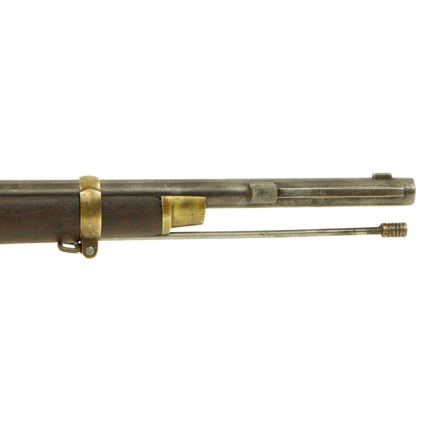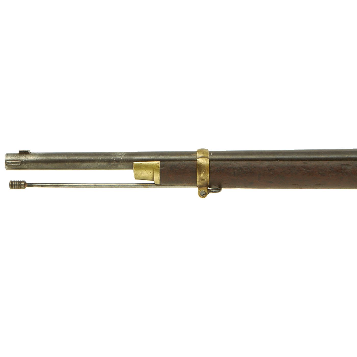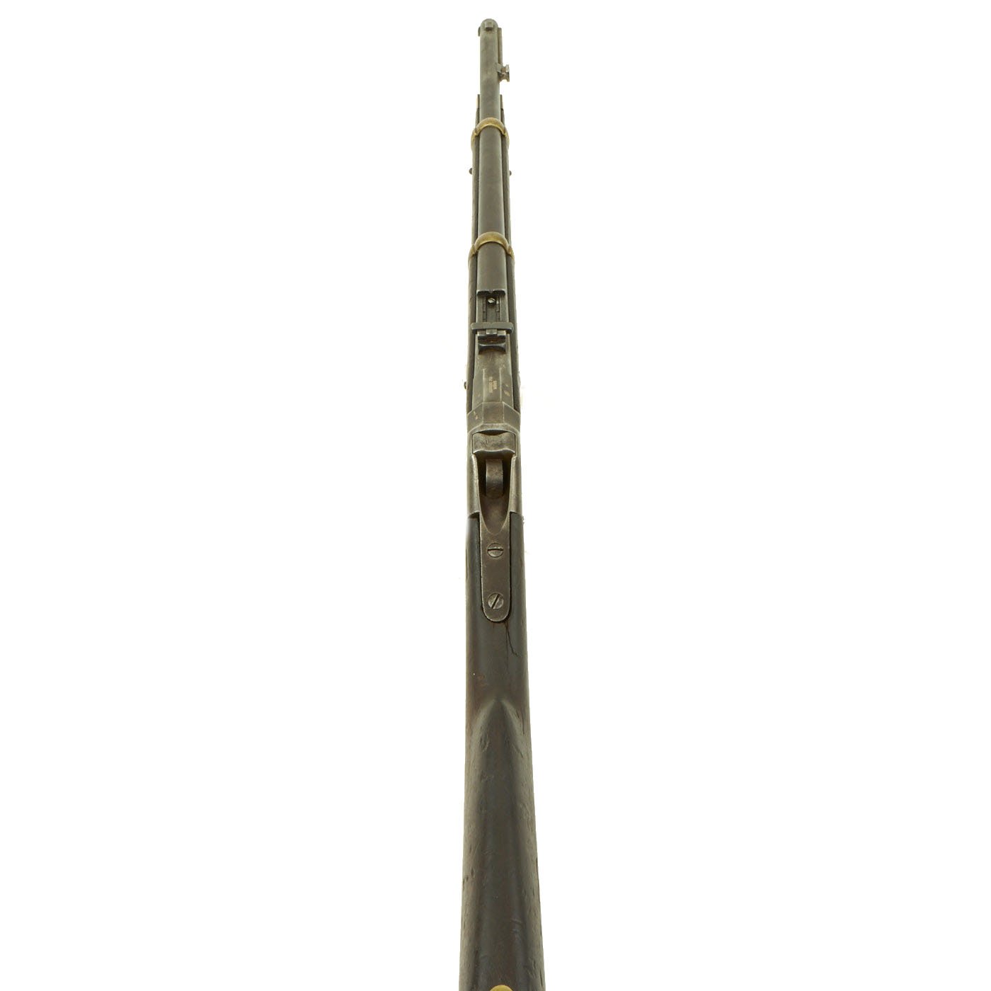 Overall the metalwork has a worn patina, with some areas of light peppering, now cleaned away. The butt plate, nose cap and barrel bands are brass, while the screws and trigger guard are steel. The two piece wood stock is in good condition, with a nice patina and signs of wear. Comes complete with the original cleaning rod, and both sling swivels are intact and functional. Bore is in very good condition, with clear lands and grooves and a partly bright finish. There is some oxidation in areas, and definitely signs of use. The action cycles well, and we did not notice any issues. The rear sight is intact and fully functional, however the front barleycorn sight had the top ground flat for some reason.