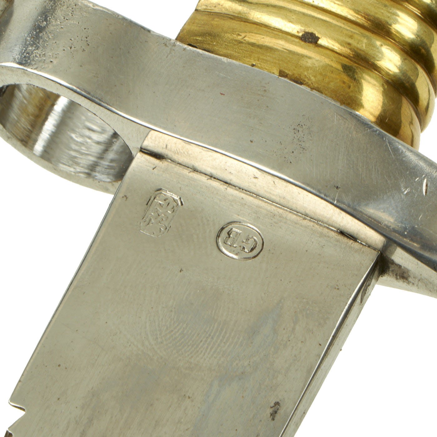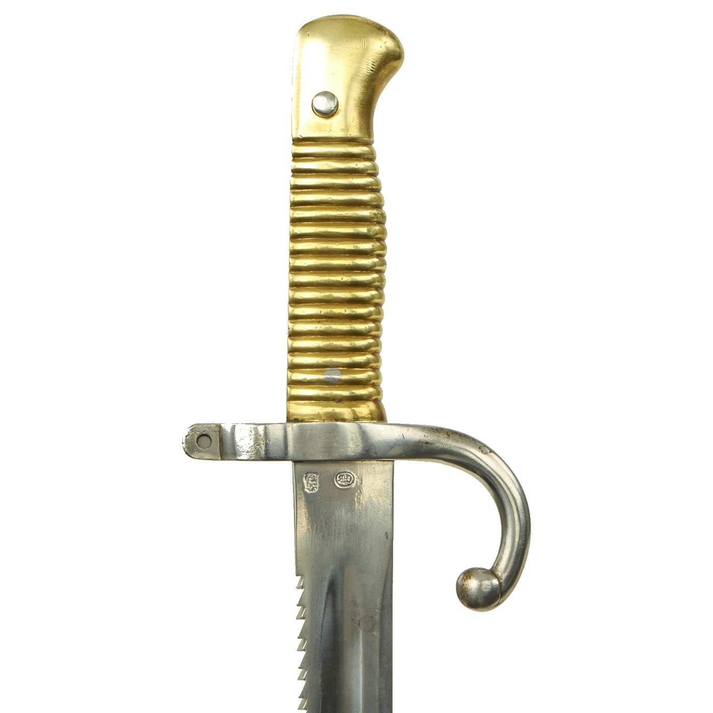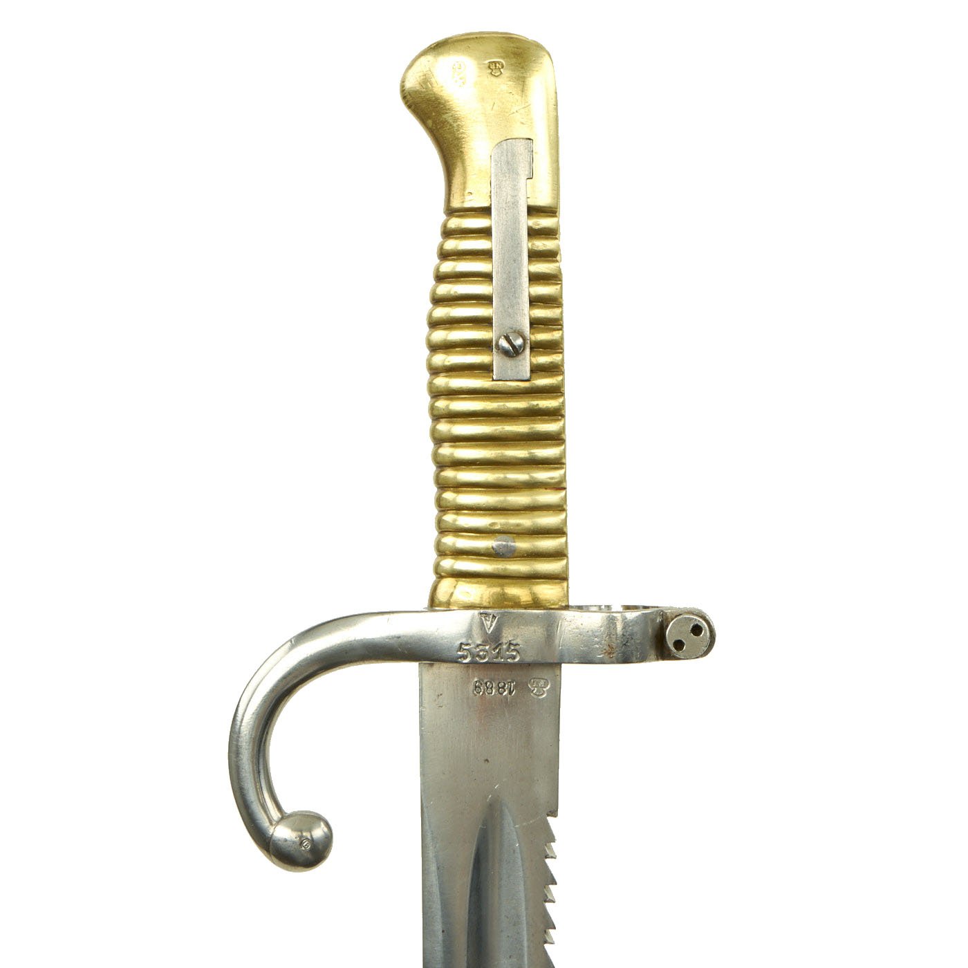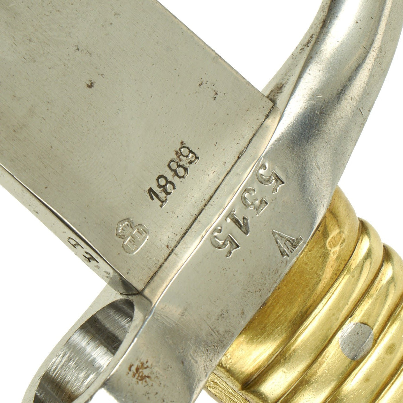 The carbine comes with an excellent condition sawback sword bayonet, with a brass handle and hooked quillon very similar to the French model 1866 chassepot bayonet. The blade on this bayonet is however straight, and has a great saw back, which is still quite sharp. There are proof and maker marks on the bayonet, and it is dated 1889 on the blade. It locks onto the front of the carbine securely, though it can be hard to get off once locked on.