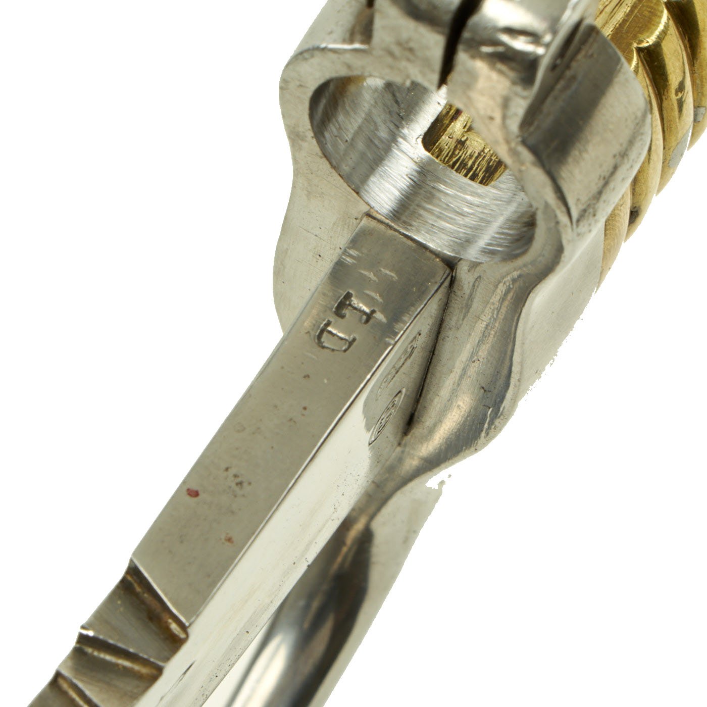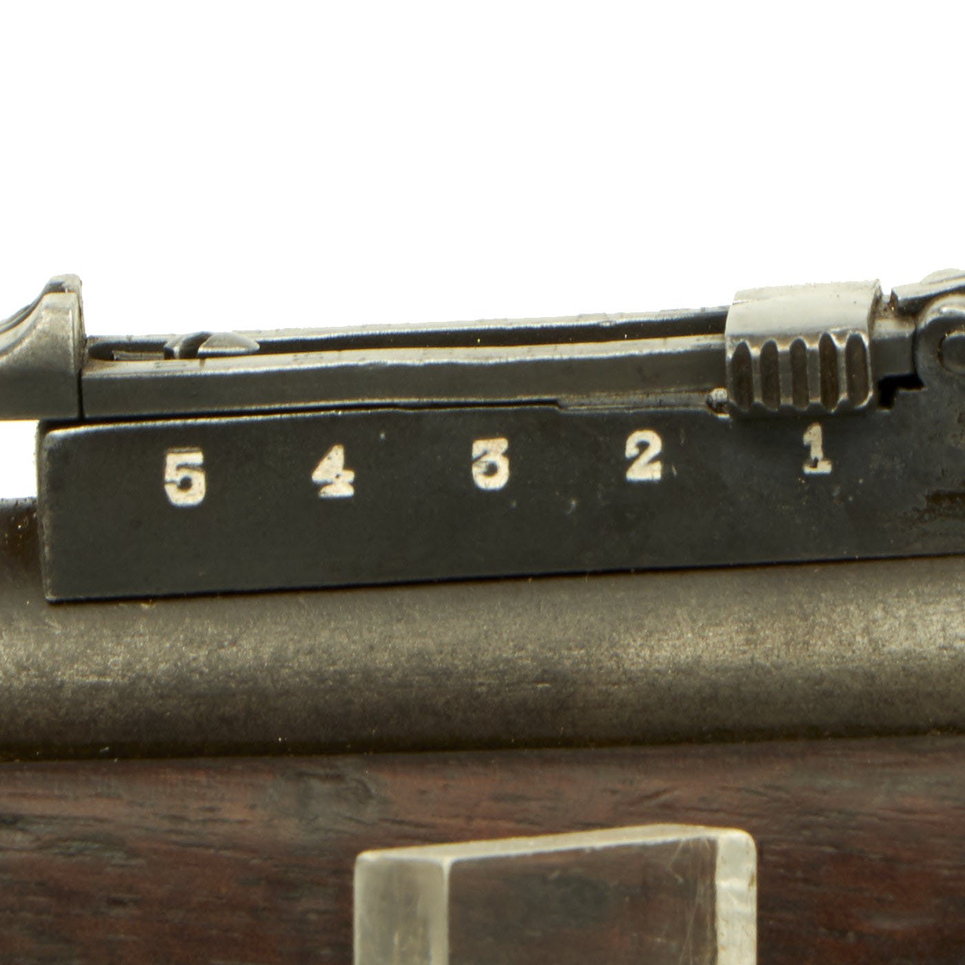 This example bears serial number 24321, and is in very good condition. The action is blued steel, and is marked with assembly number 10501, which matches the number bayonet stand and bolt. There are various other proofs and markings on the receiver and barrel, however they are faint due to wear. It looks to have a maker marking on the top of the barrel nocks form: