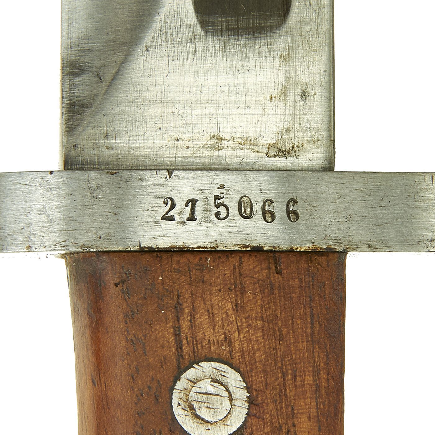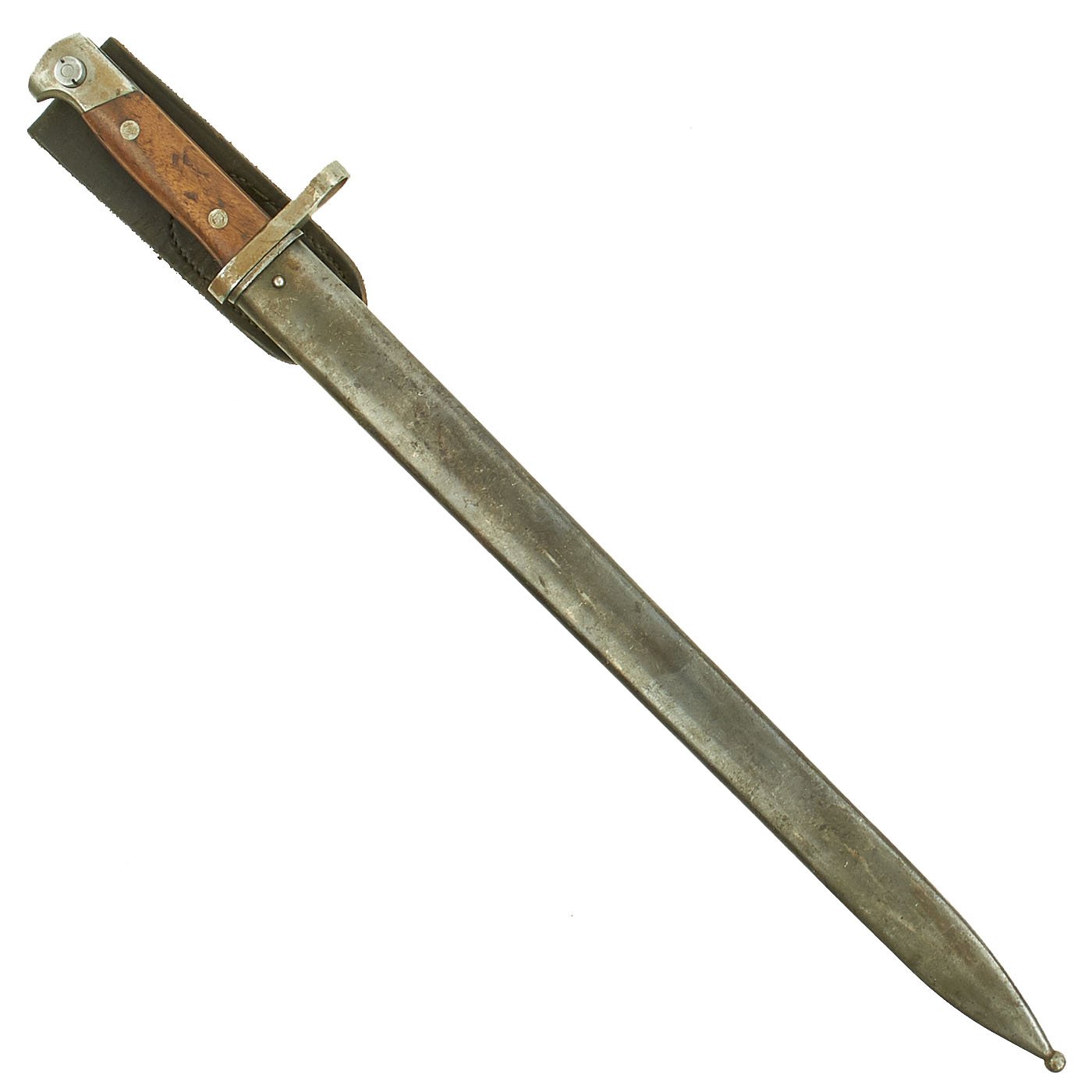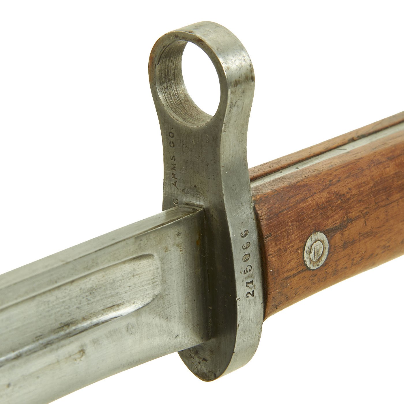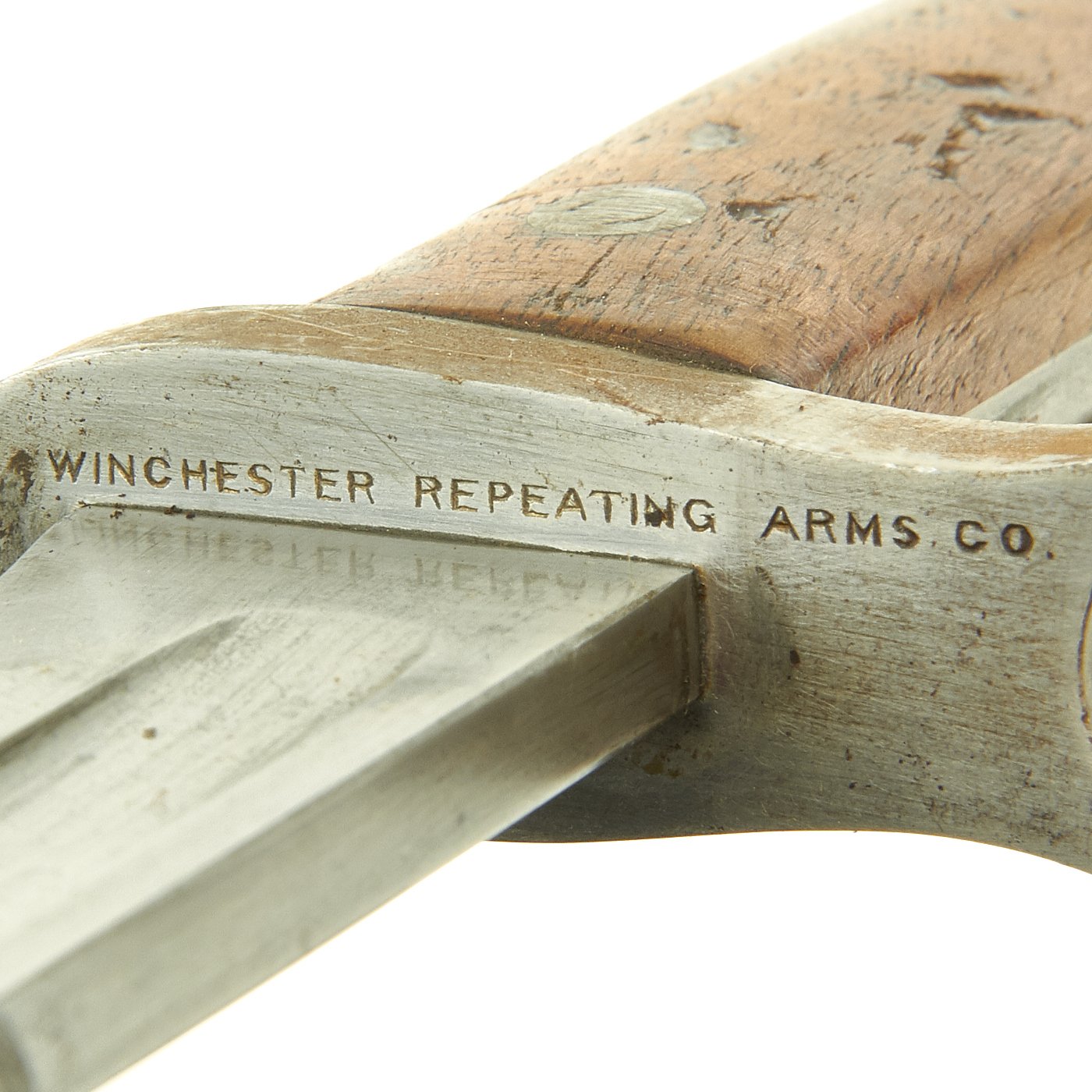 Original item: Only One Available. This is very rare, especially in the wonderful all original Condition. The steel is bright and the bayonet has almost a 16" blade, with an overall length of 20 1/2". The grips are wood secured by two rivets, ground smooth. It bears the Rifle's serial number 215066 and comes in its original blued steel scabbard complete with its original integral leather belt frog. The top of the crossguard is clearly marked WINCHESTER REPEATING ARMS CO.
