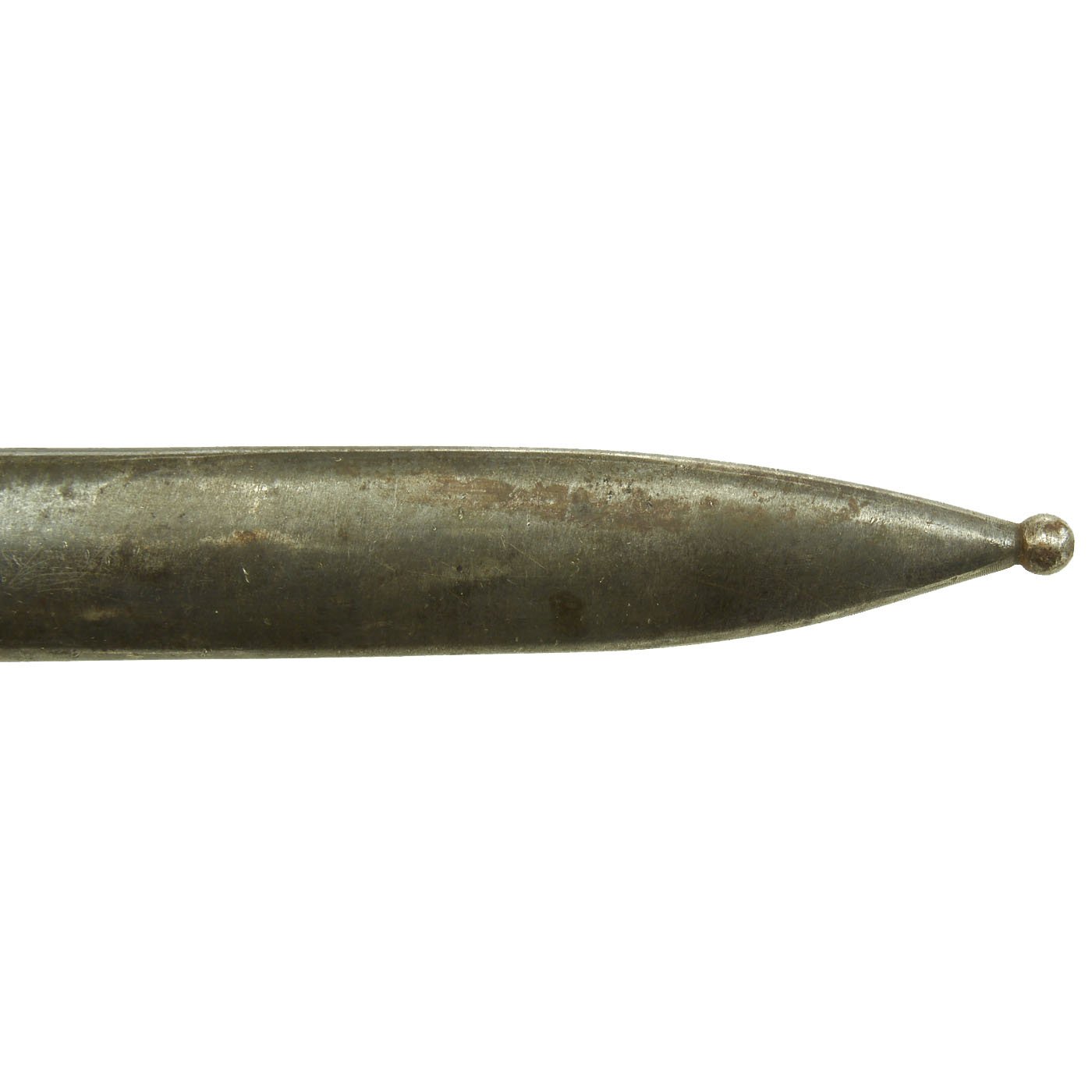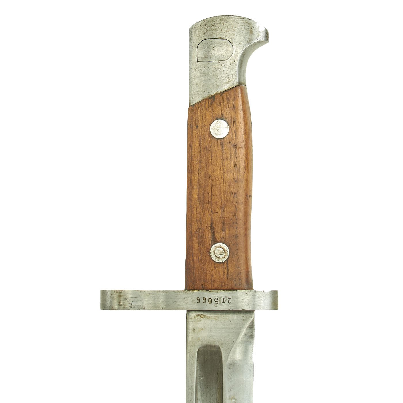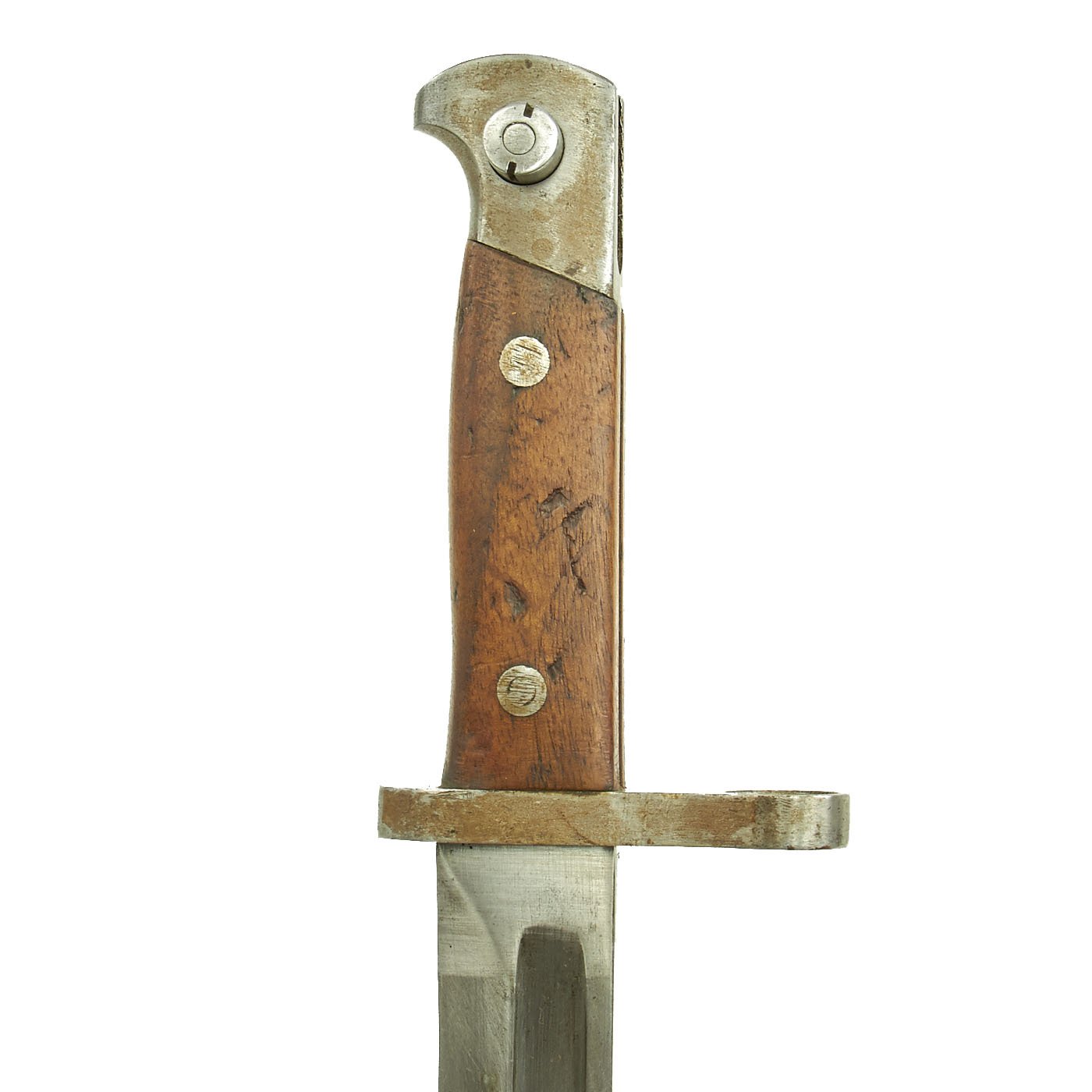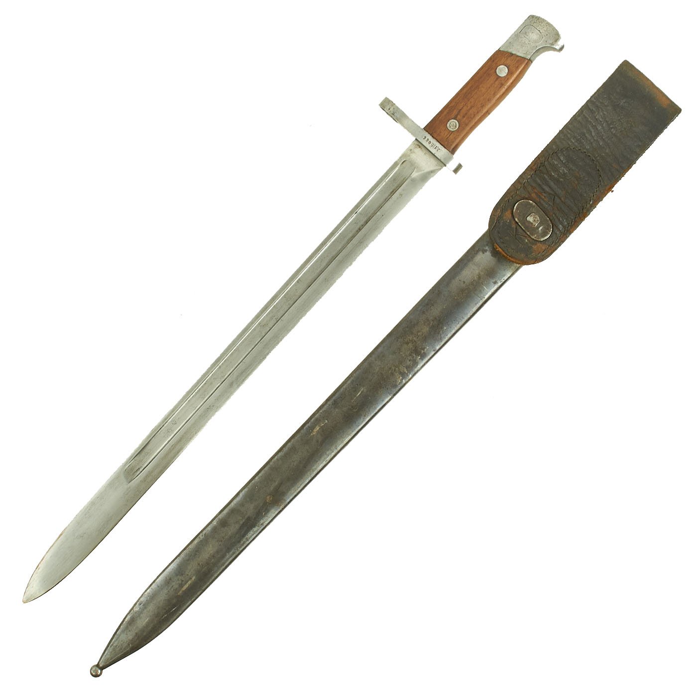 Original item: Only One Available. This is very rare, especially in the wonderful all original Condition. The steel is bright and the bayonet has almost a 16" blade, with an overall length of 20 1/2". The grips are wood secured by two rivets, ground smooth. It bears the Rifle's serial number 215066 and comes in its original blued steel scabbard complete with its original integral leather belt frog. The top of the crossguard is clearly marked WINCHESTER REPEATING ARMS CO.