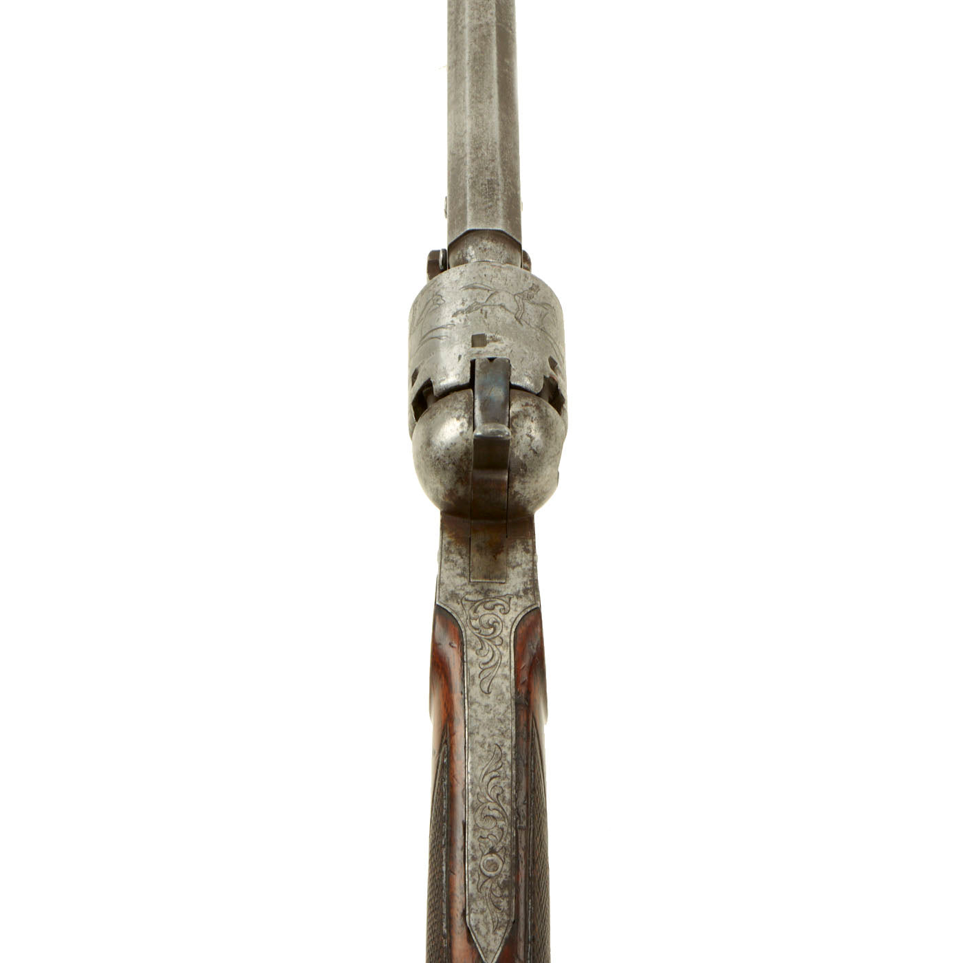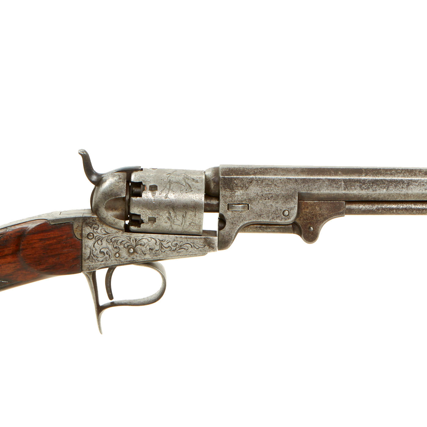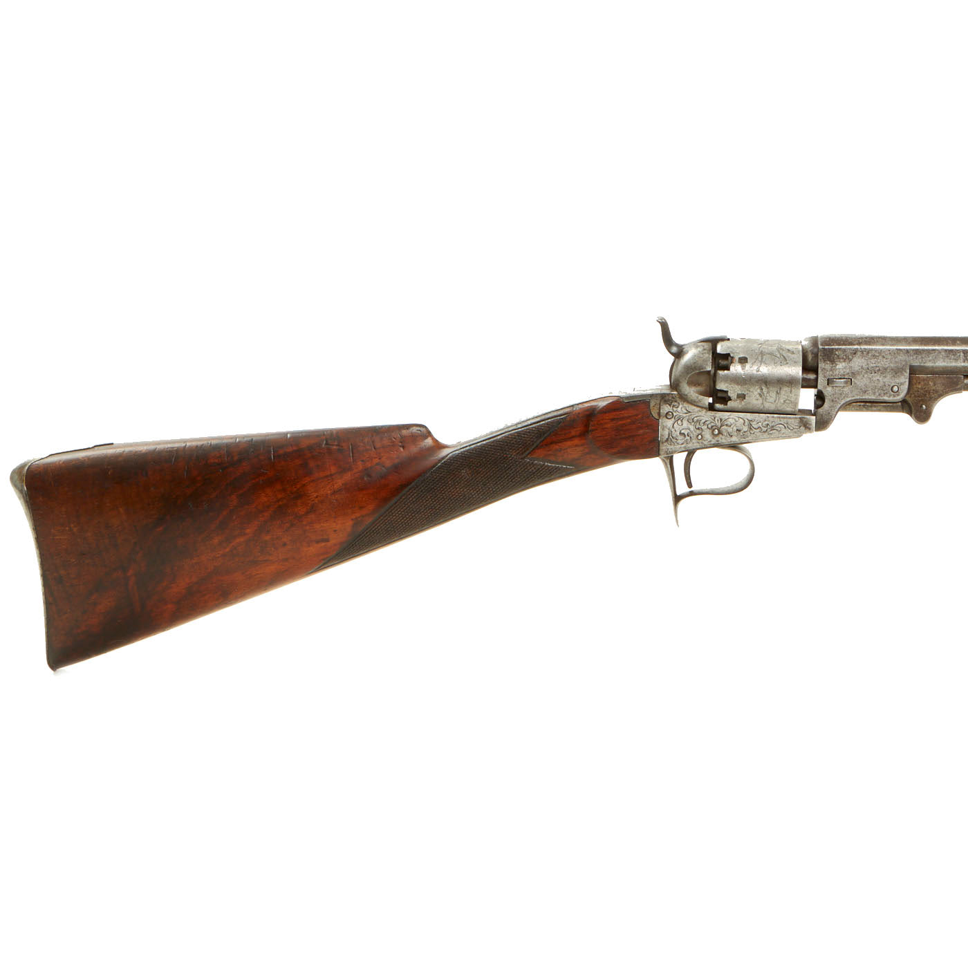 We have here one of these revolving rifles, often called "revolving pistol carbines", in the same .36 caliber as the Model 1851 Navy. It is correctly marked COLT BREVETE on the top of the barrel, and on the lower support for the butt stock. It is also marked with serial number 446 under the barrel, and there are no other markings that we are able to see. The frame and trigger guard bear some lovely foliate engraving, typical of Belgian produced arms from the mid 19th century. The cylinder looks to have been engraved post manufacture with a battle scene, with two soldiers on horseback with guns chasing two other men on horses, with some flying arrows in the air. The soldiers look to be European in dress, but could also be U.S. Soldiers chasing Native Americans. Definitely worth some further research.